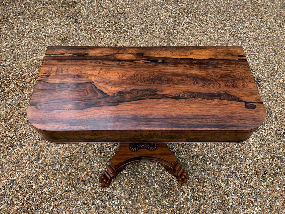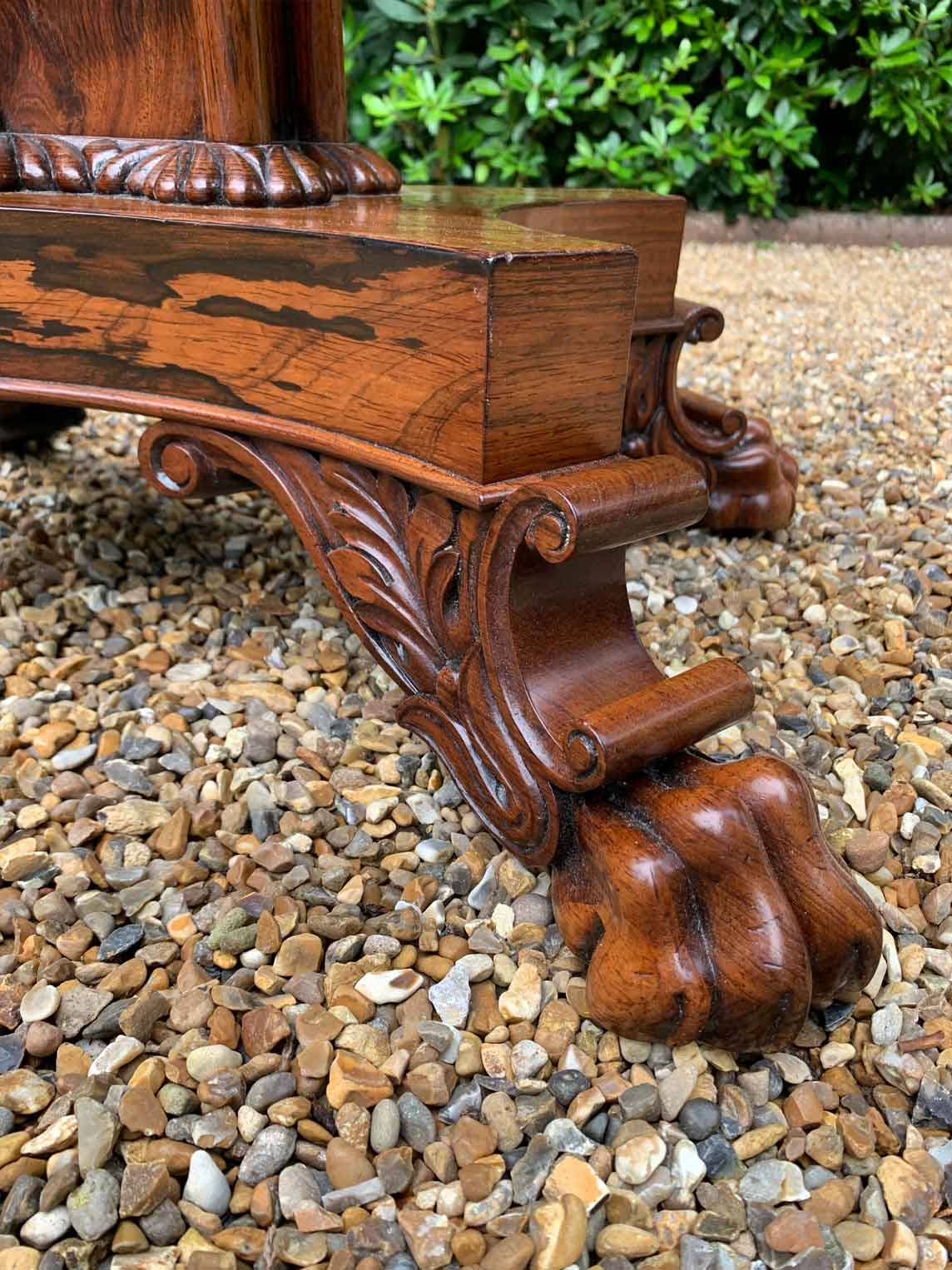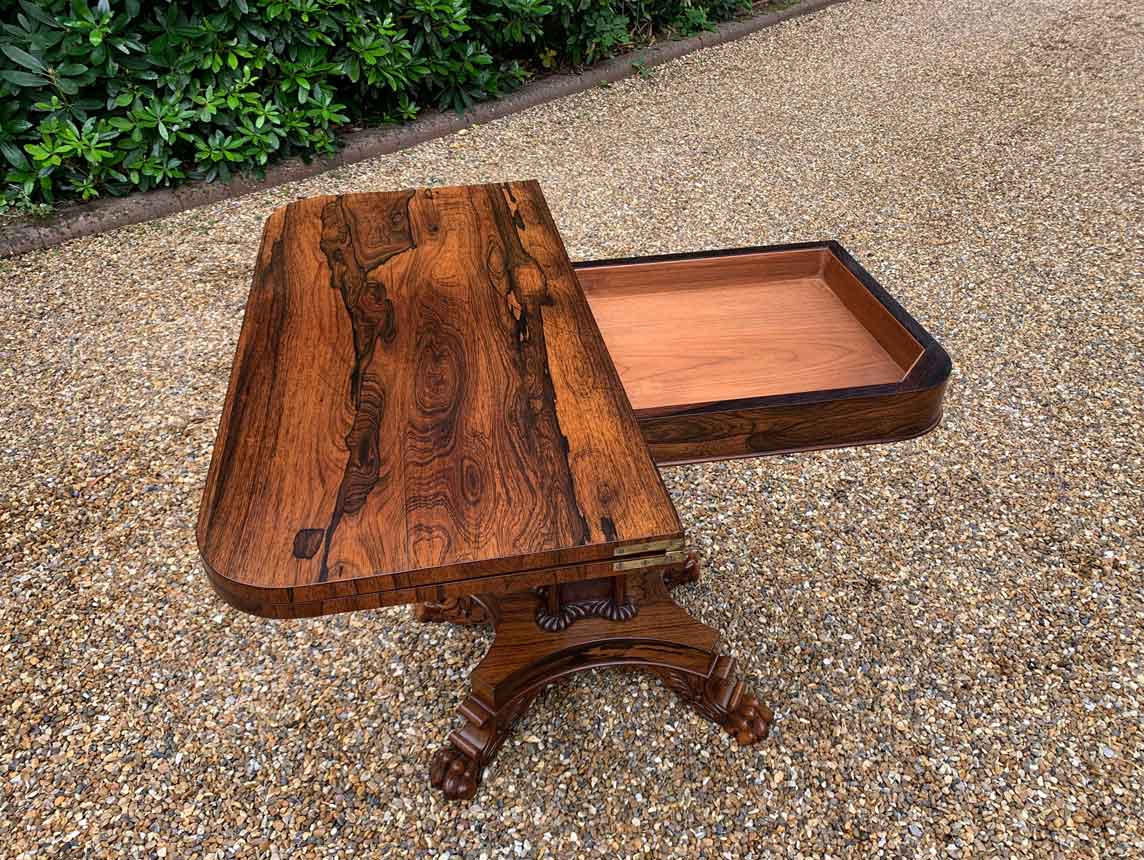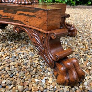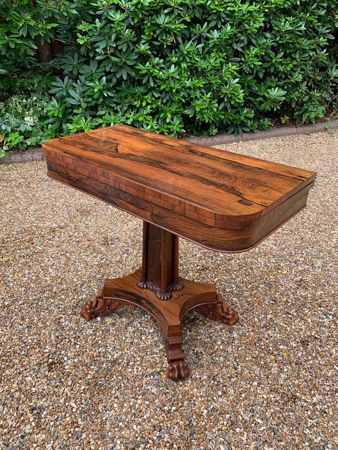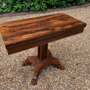A beautiful 19th Century figured Regency Rosewood Tea Table. The top rotates by 90 degrees and unfolds to convert to a Tea Table. The table stands on an elegant turned carved column on a quatrefoil base with four carved lion claw feet with brass castors.