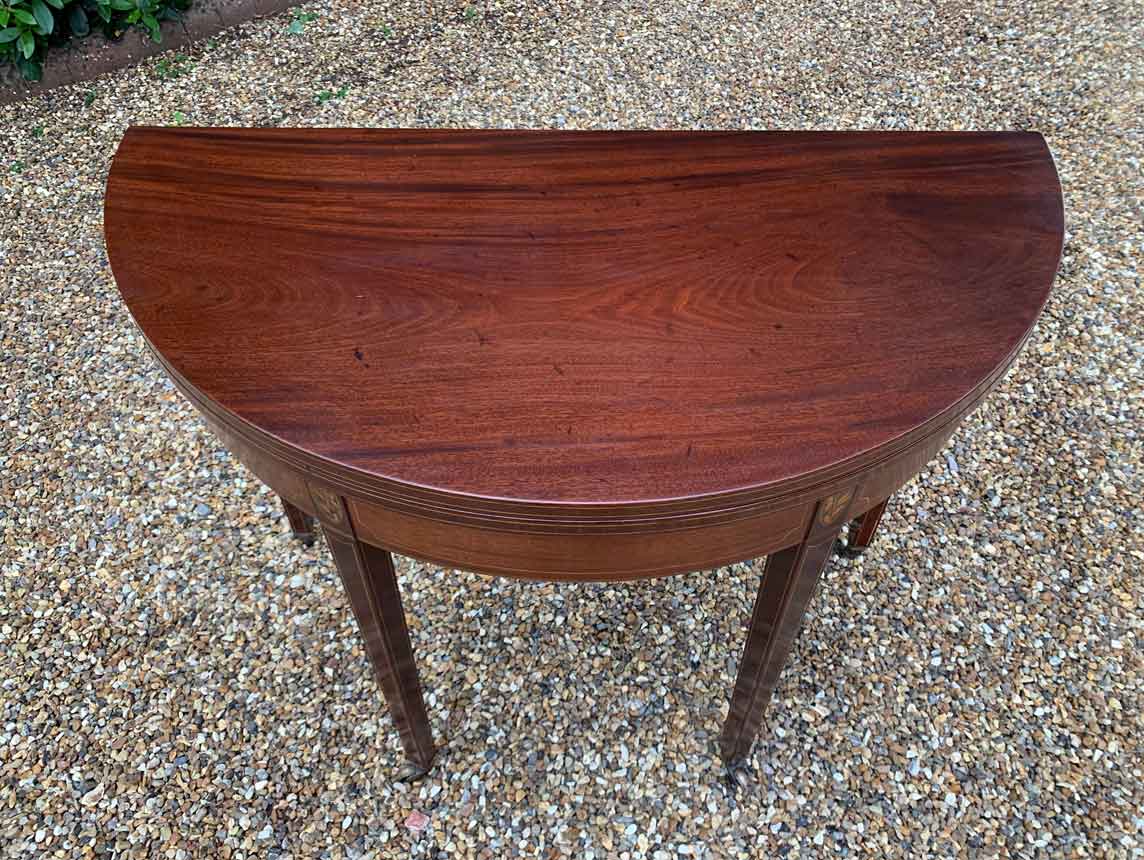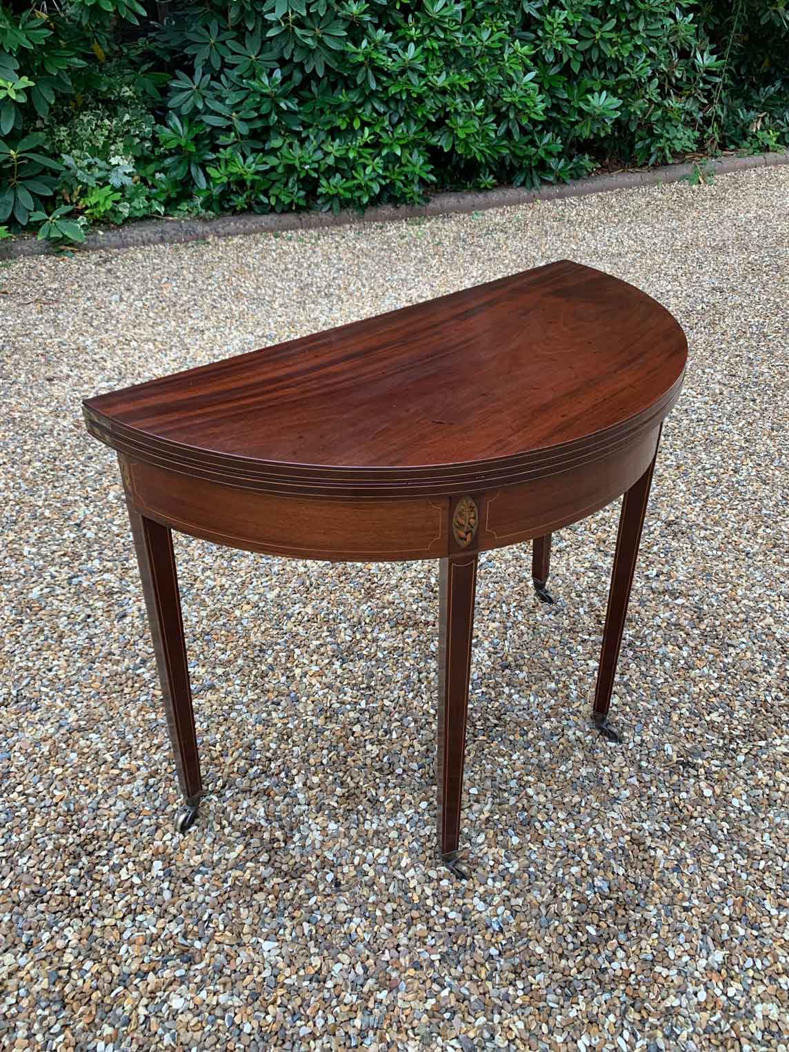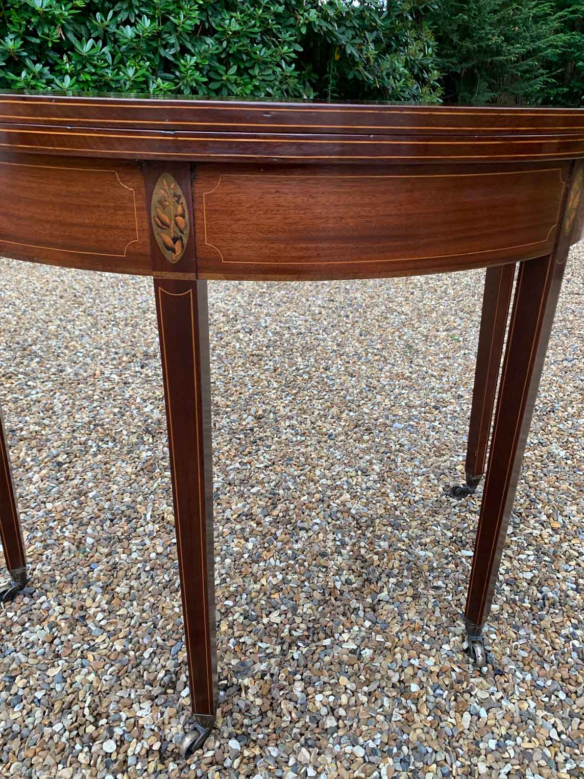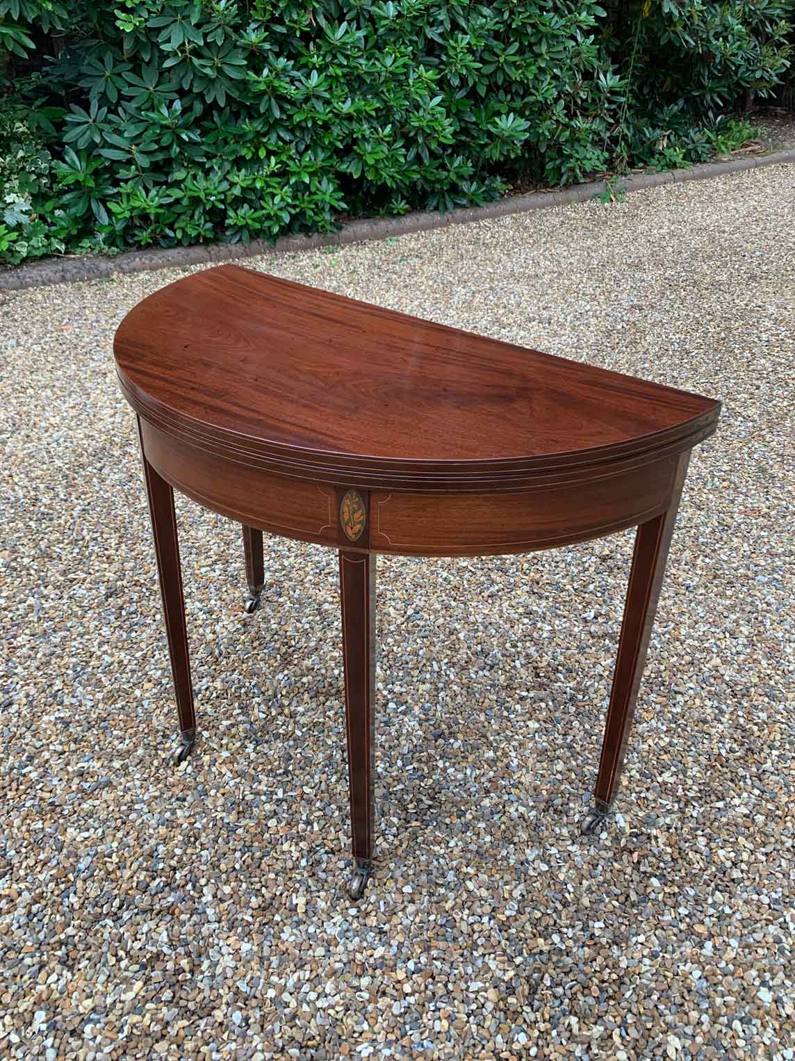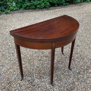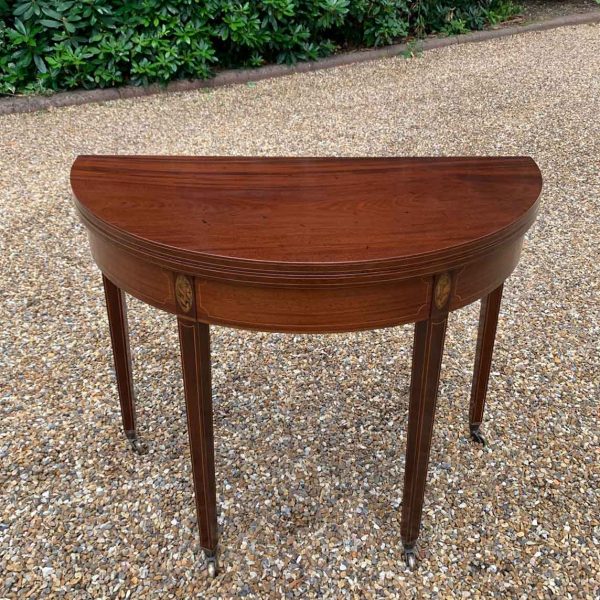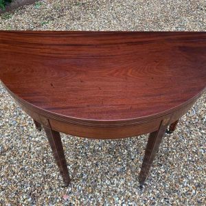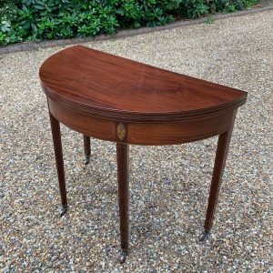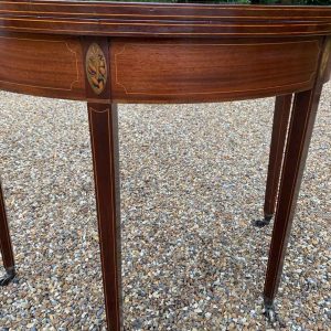 A 19th Century Inliad Mahogany Demi Lune Tea Table on tapering legs and with satinwood crossbanding.