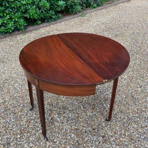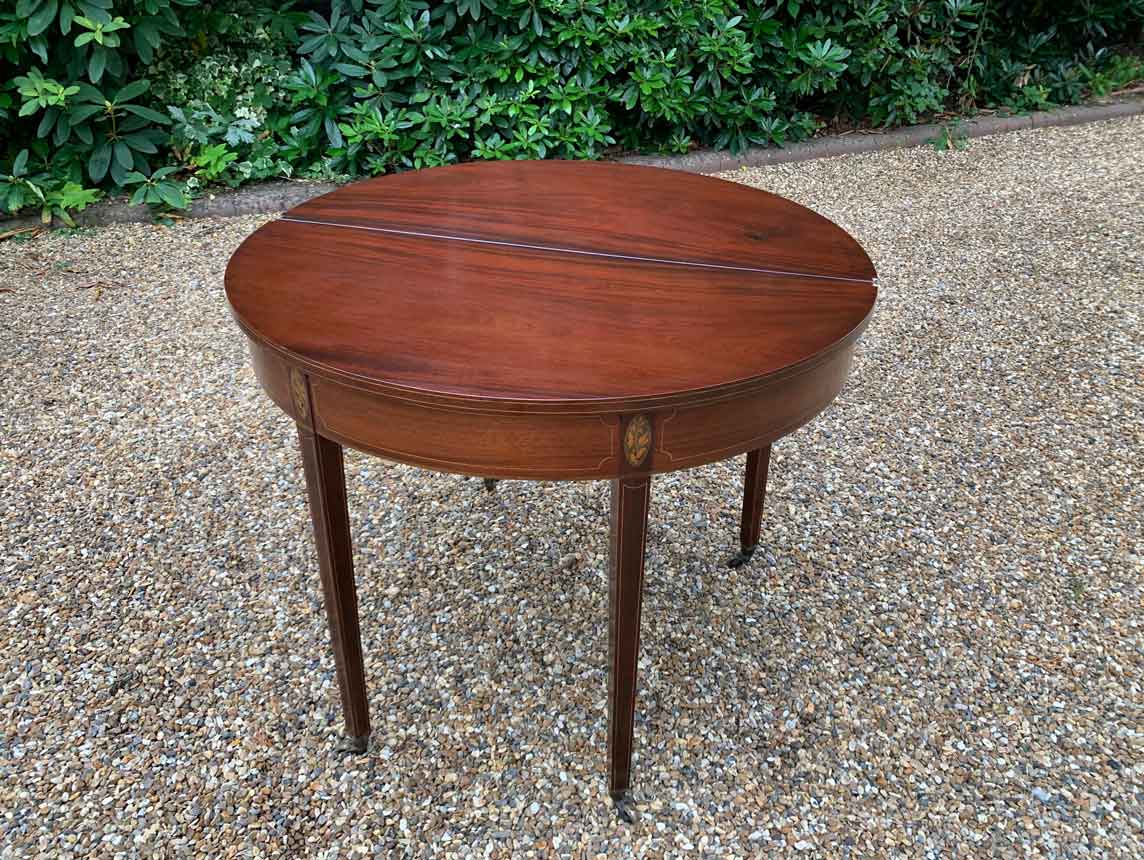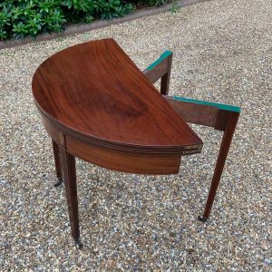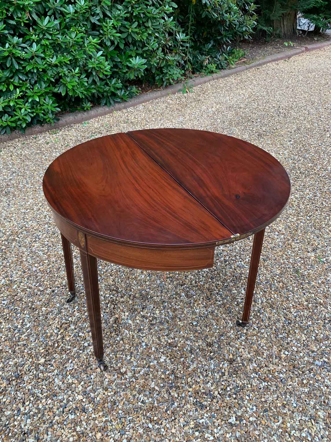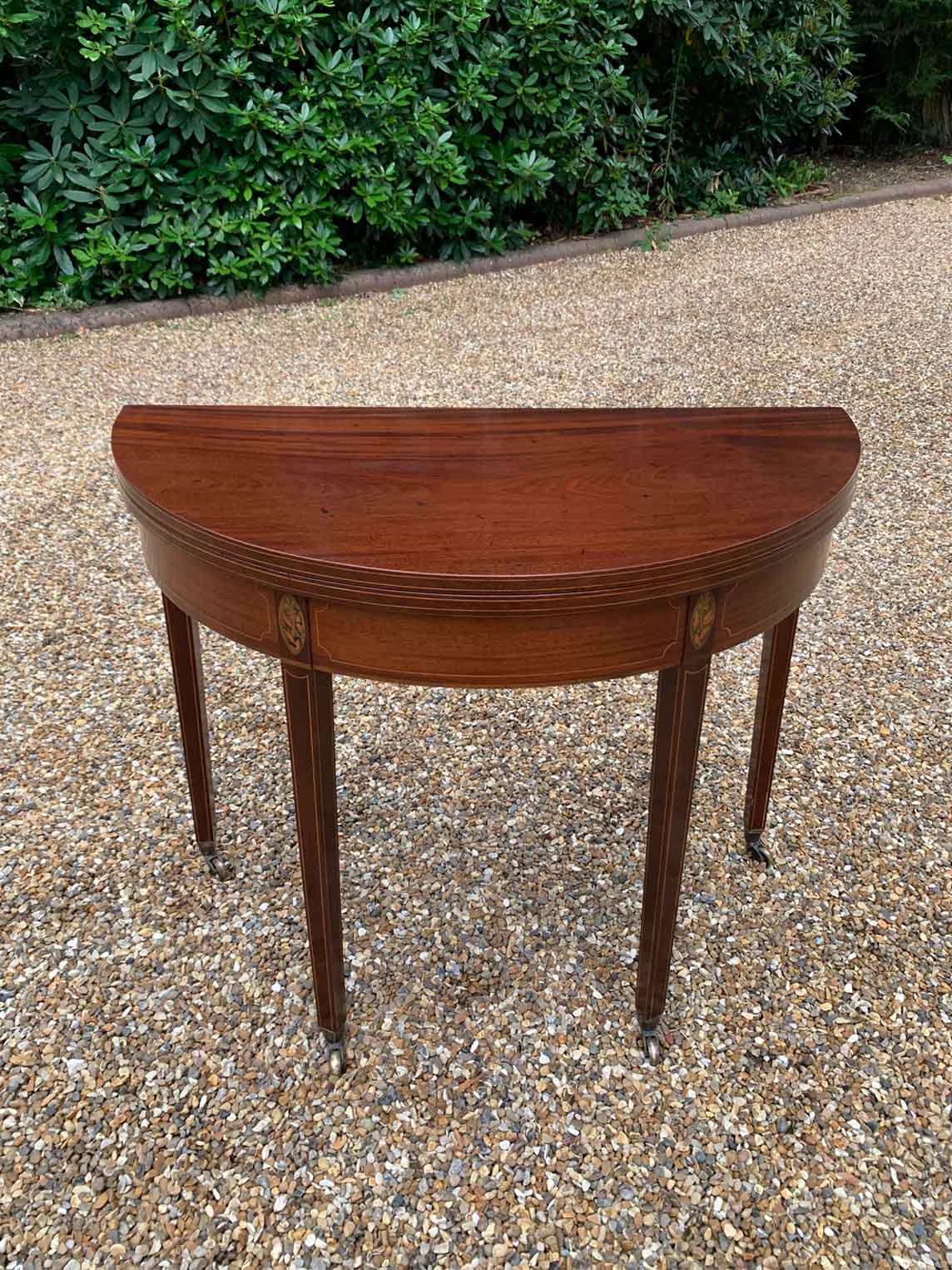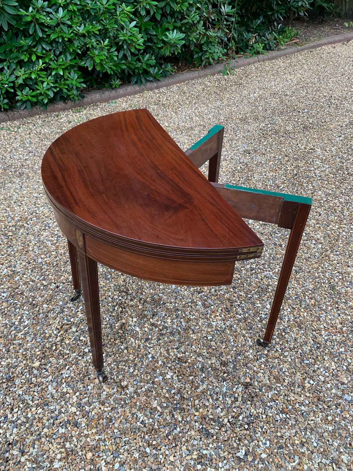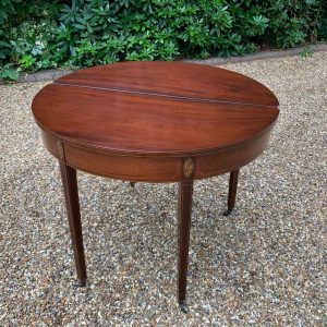 A 19th Century Inliad Mahogany Demi Lune Tea Table on tapering legs and with satinwood crossbanding.
