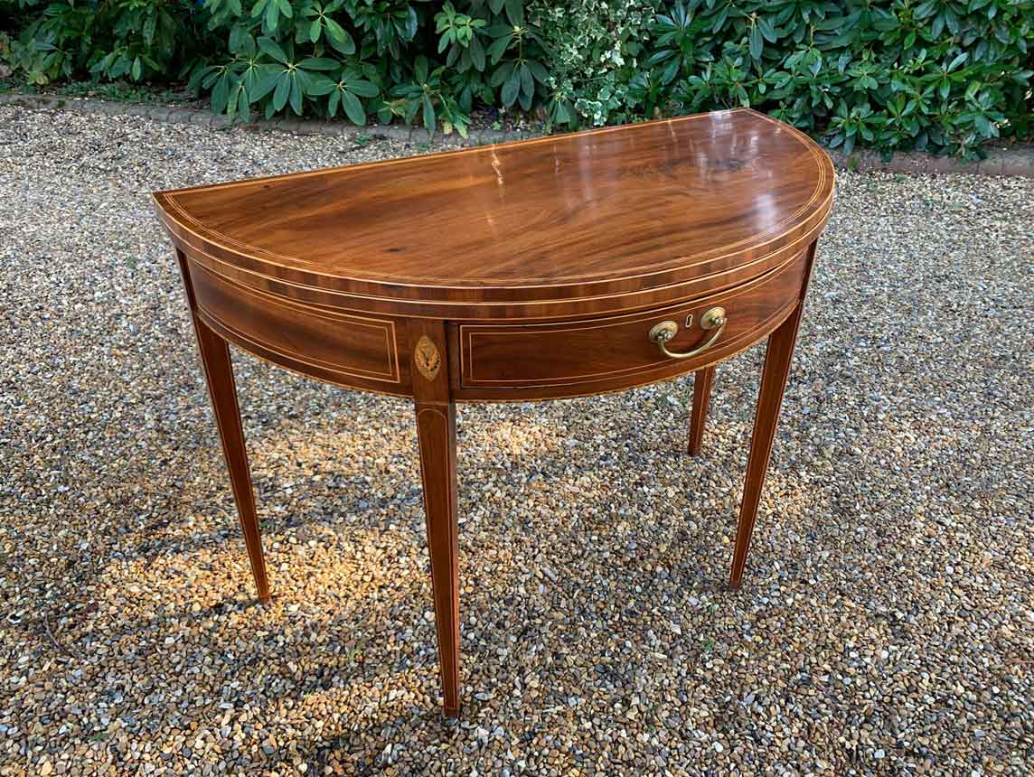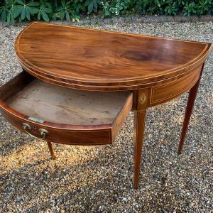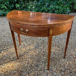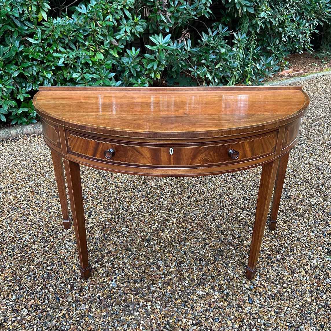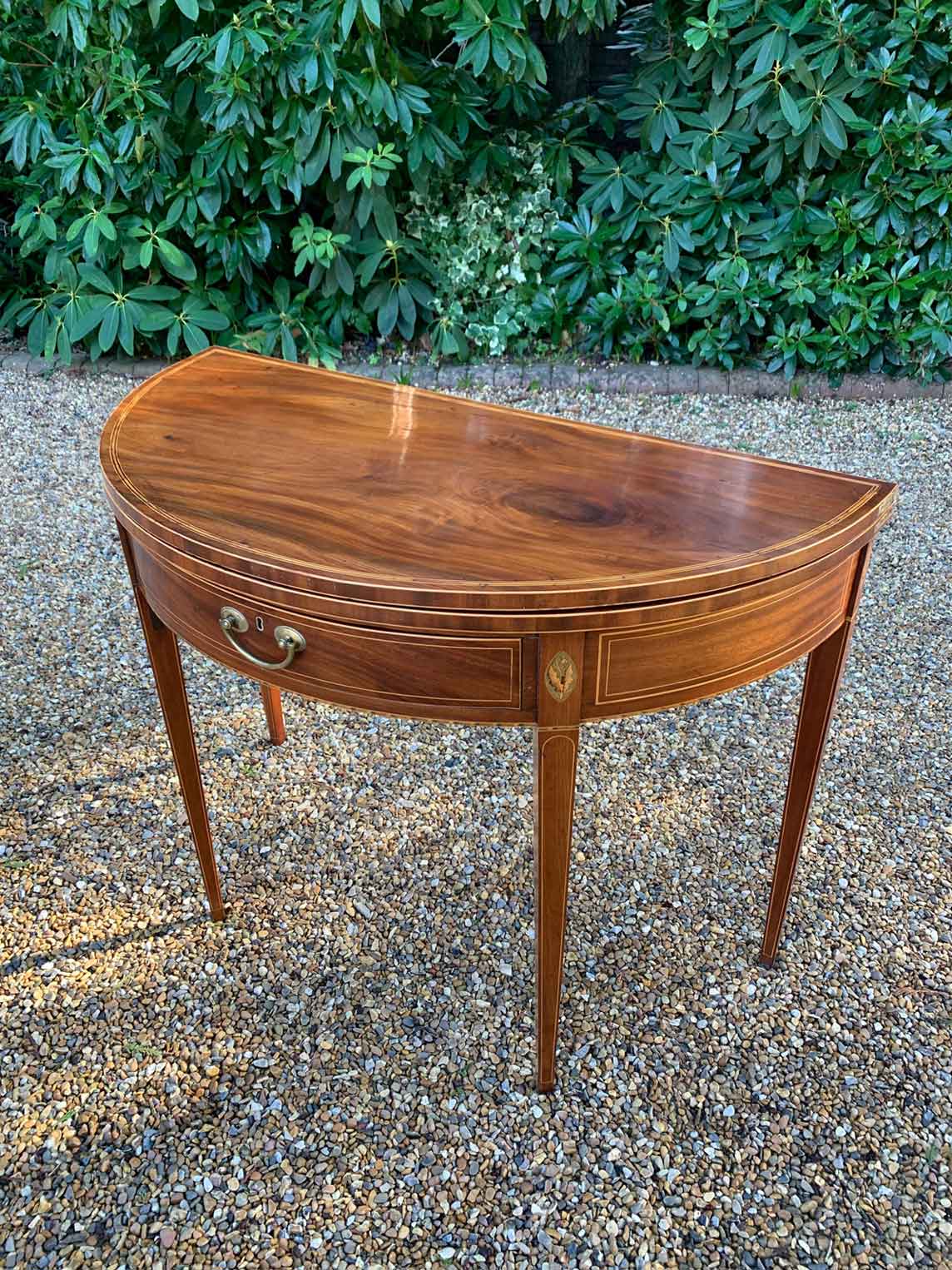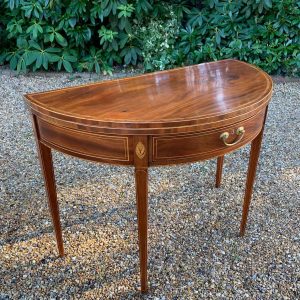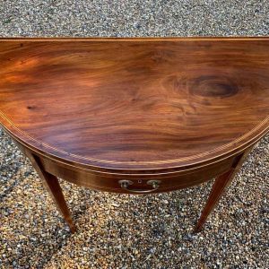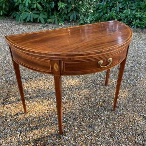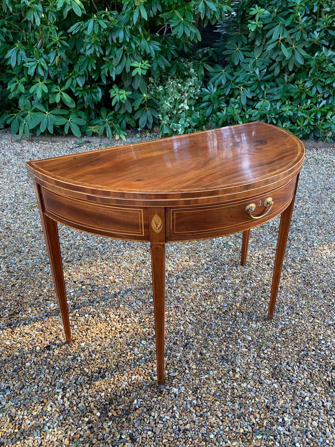 Georgian Mahogany Demi Lune Inlayed Tea Table with a middle drawer raised on square tapering legs.