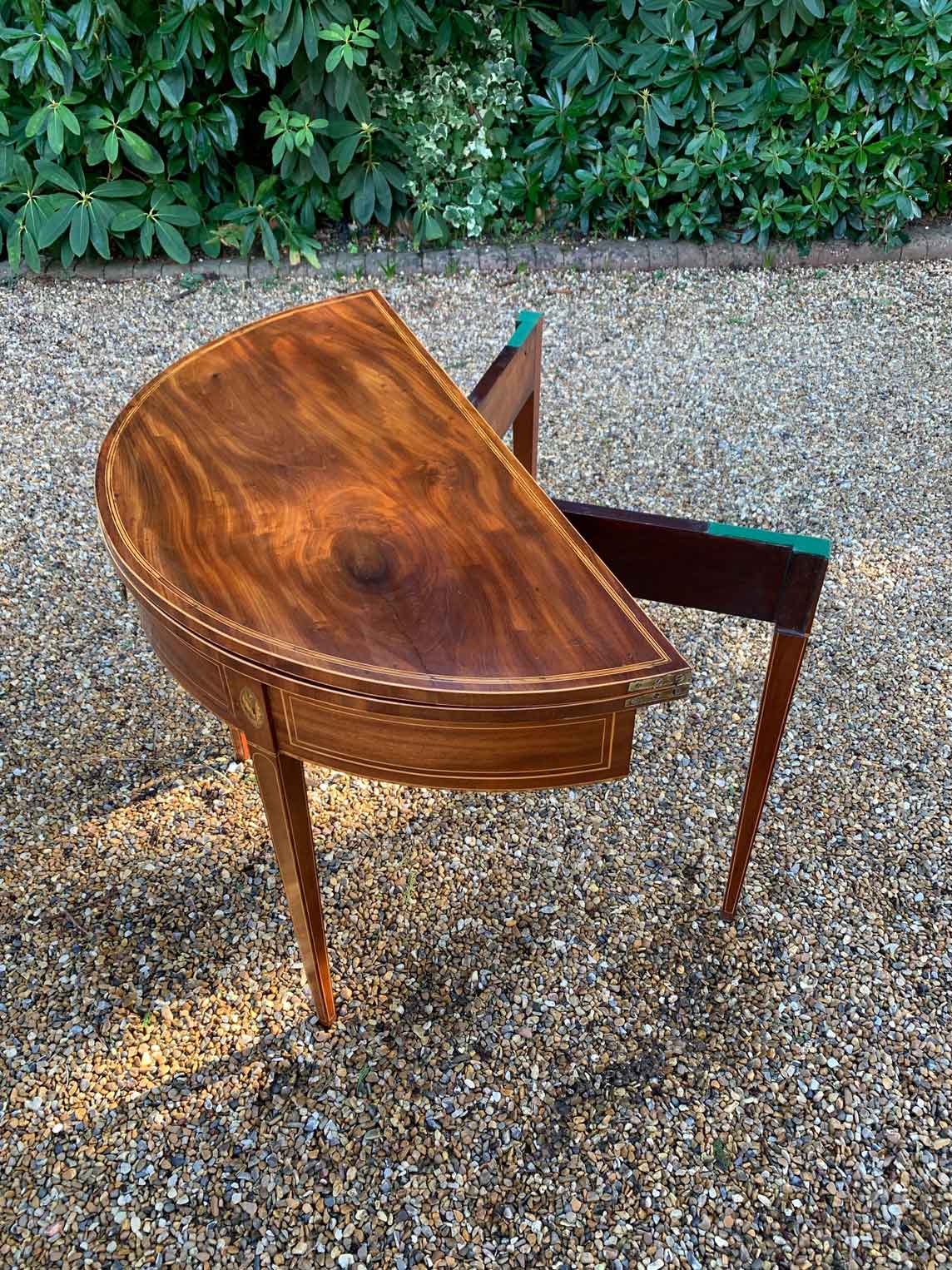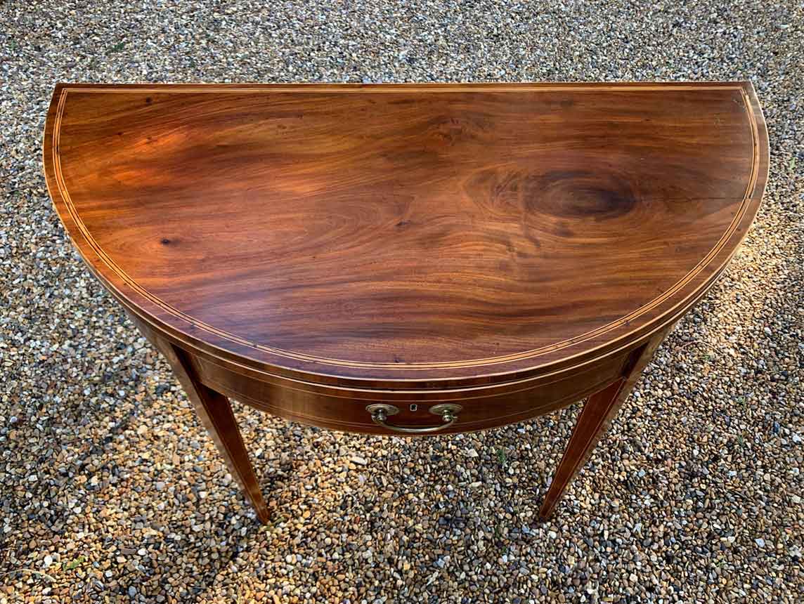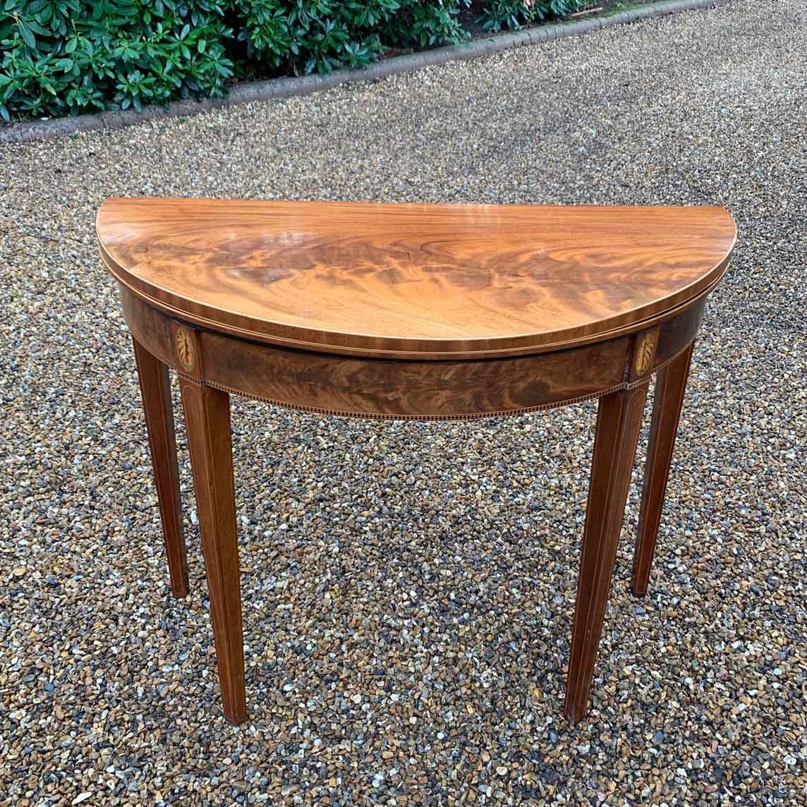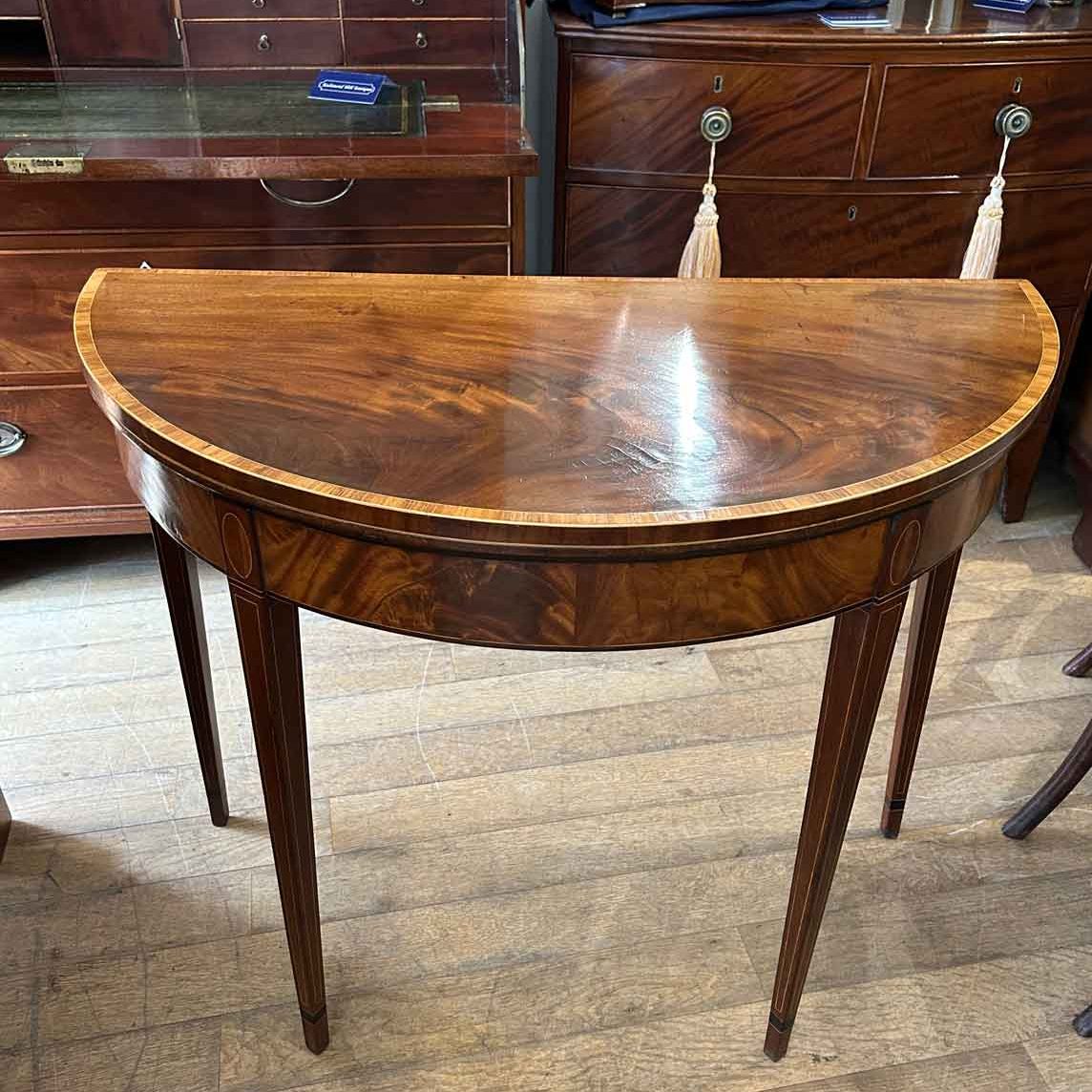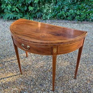 Georgian Mahogany Demi Lune Inlayed Tea Table with a middle drawer raised on square tapering legs.