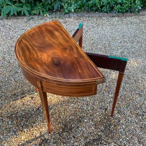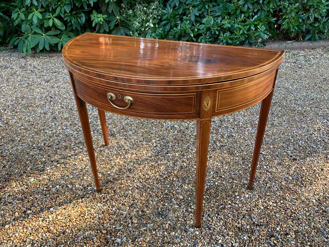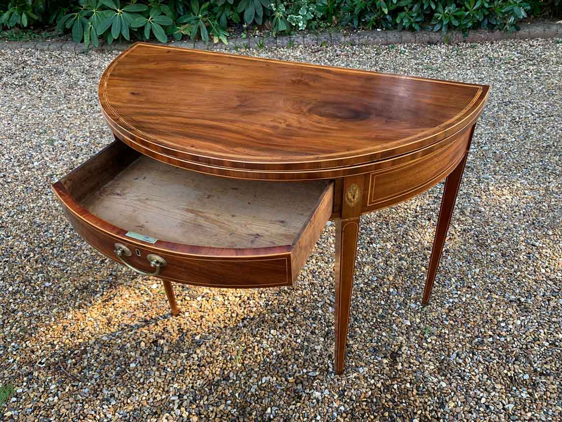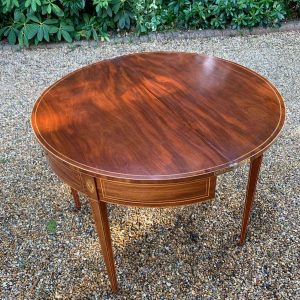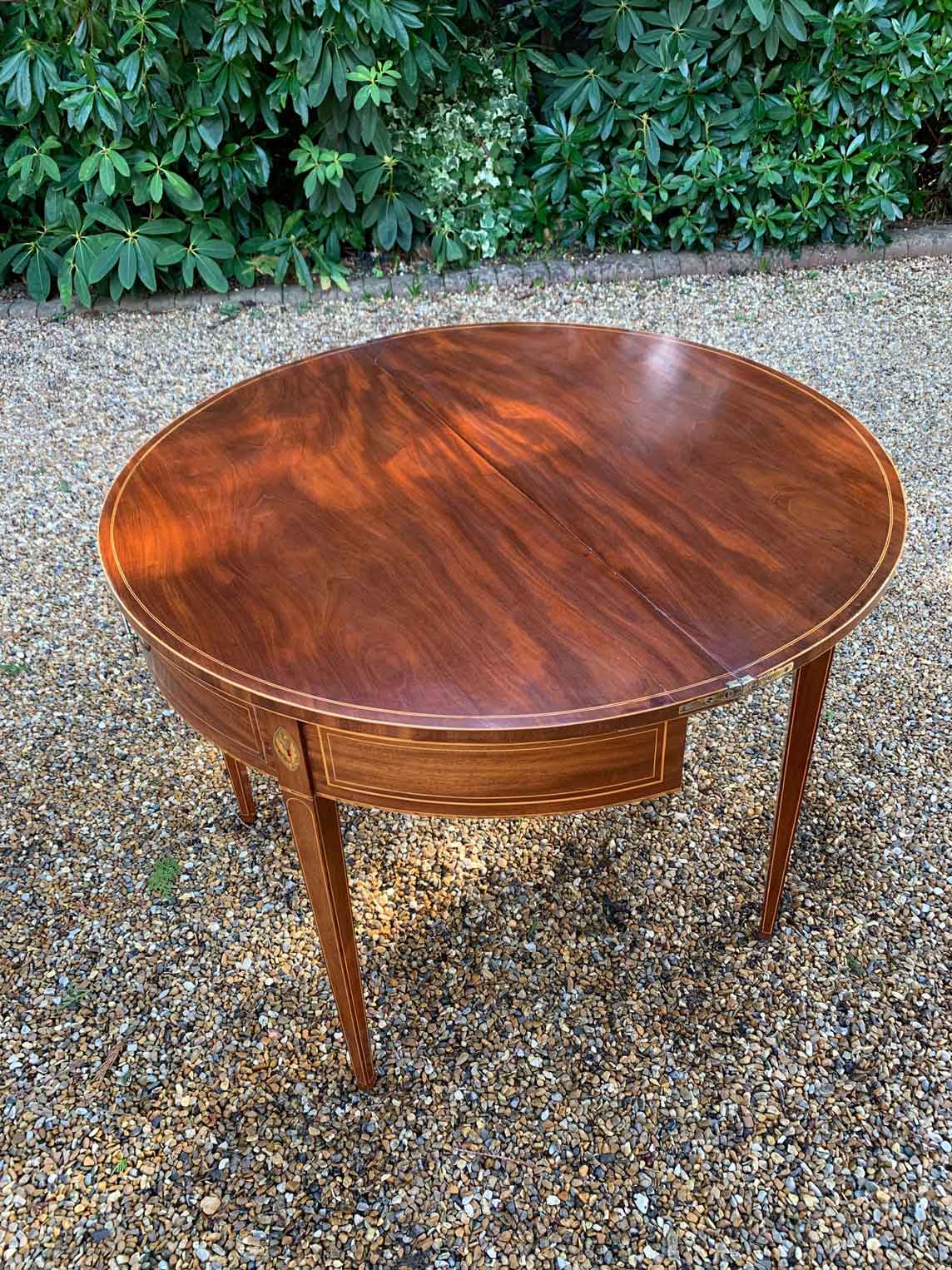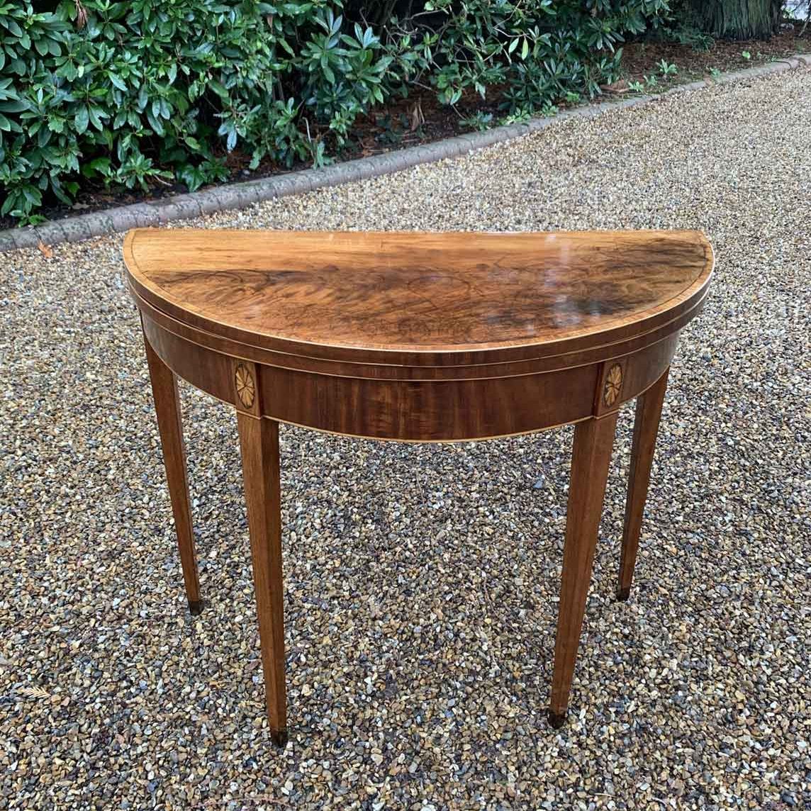 Georgian Mahogany Demi Lune Inlayed Tea Table with a middle drawer raised on square tapering legs.