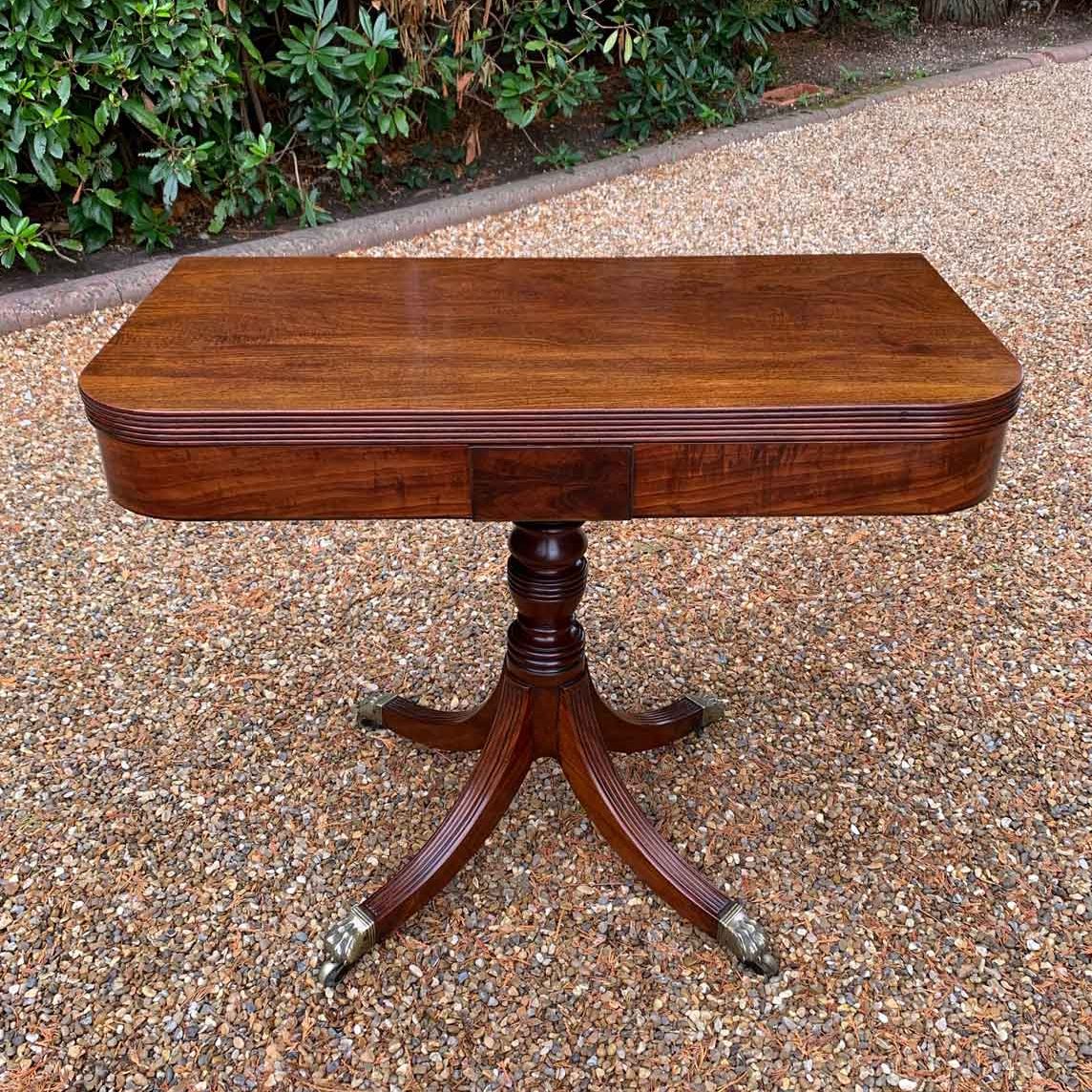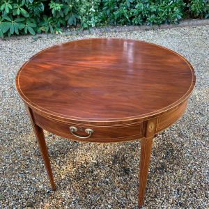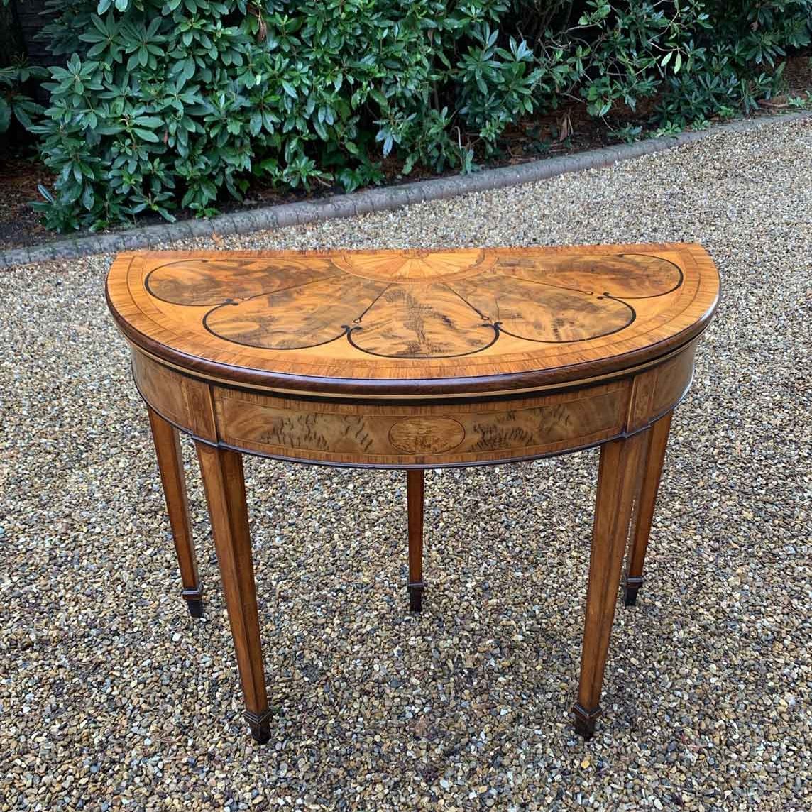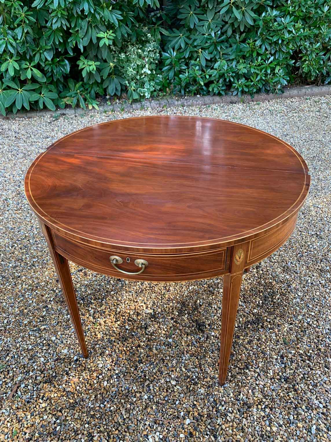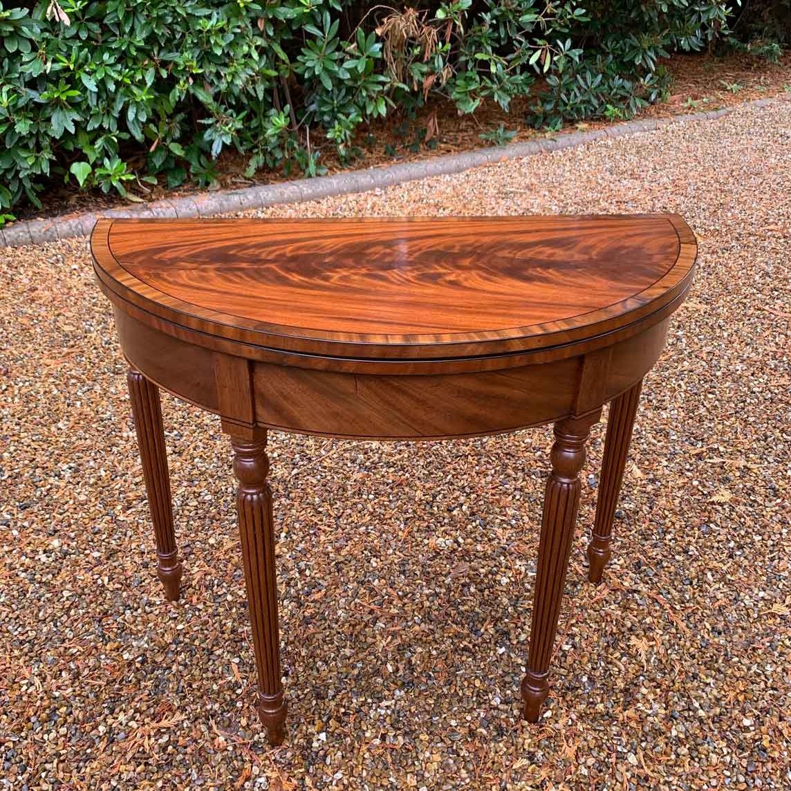 Georgian Mahogany Demi Lune Inlayed Tea Table with a middle drawer raised on square tapering legs.