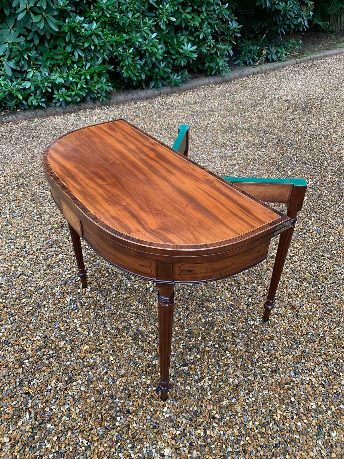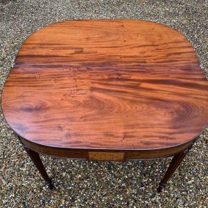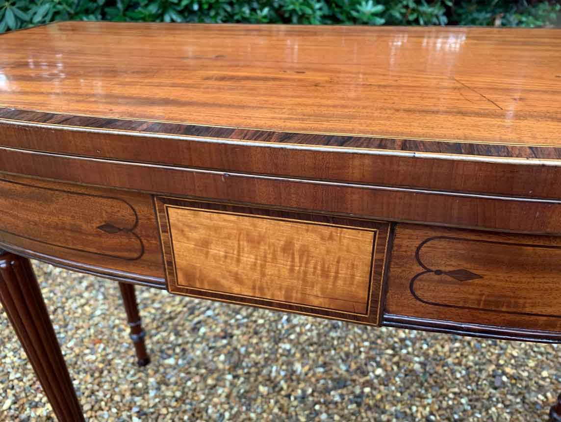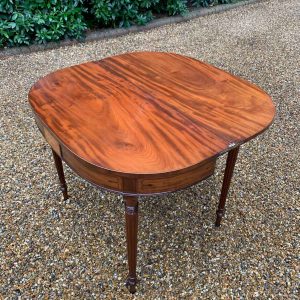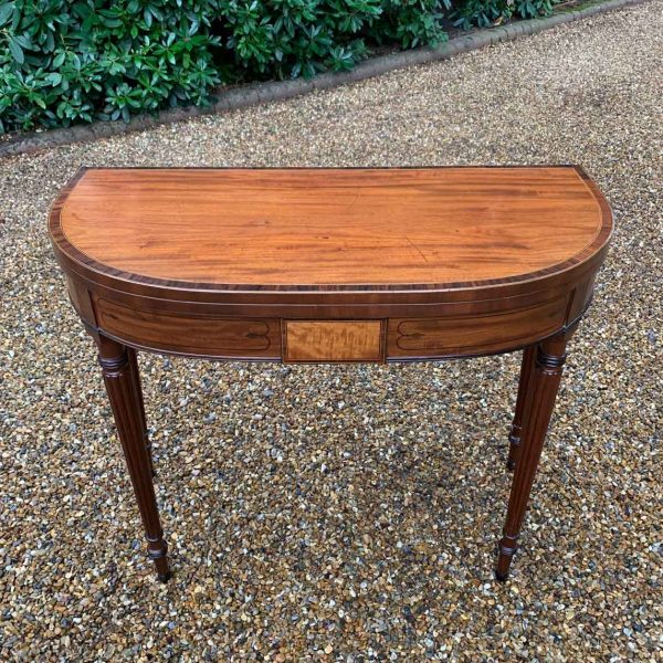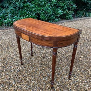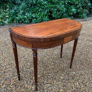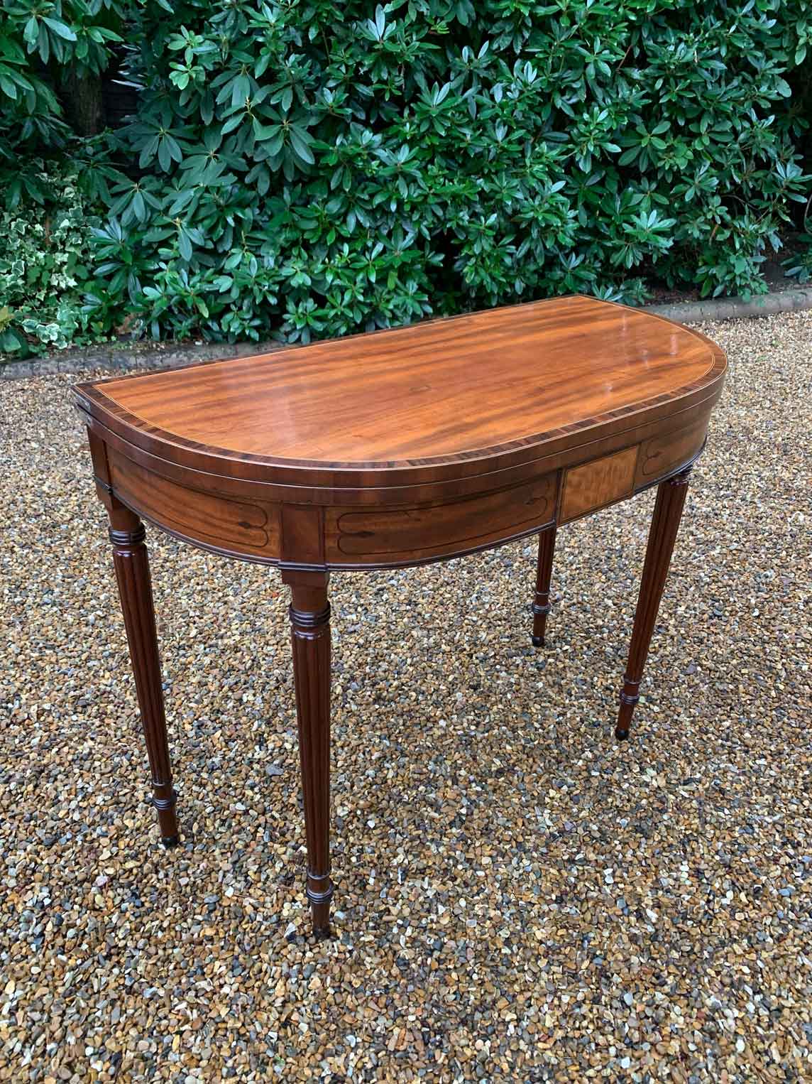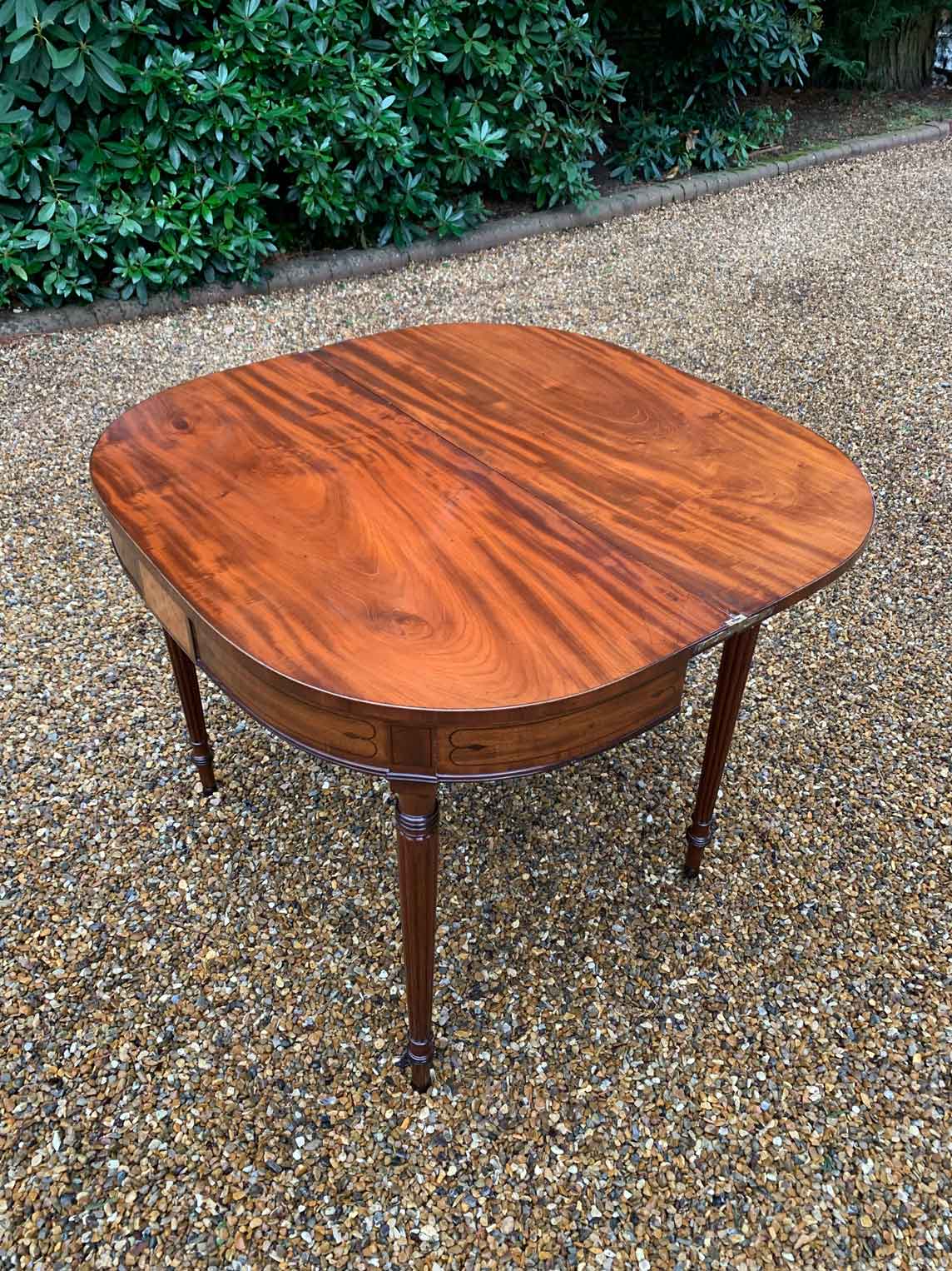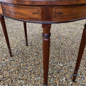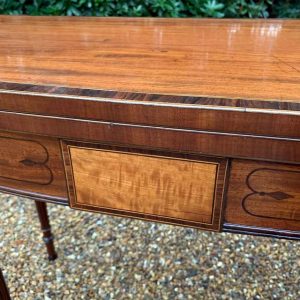 19th Century Regency Mahogany Tea Table with rosewood cross-banding and line inlaid decoration throughout. The two rear legs swing round and opens up to a Tea Table. Standing on turned reeded legs.