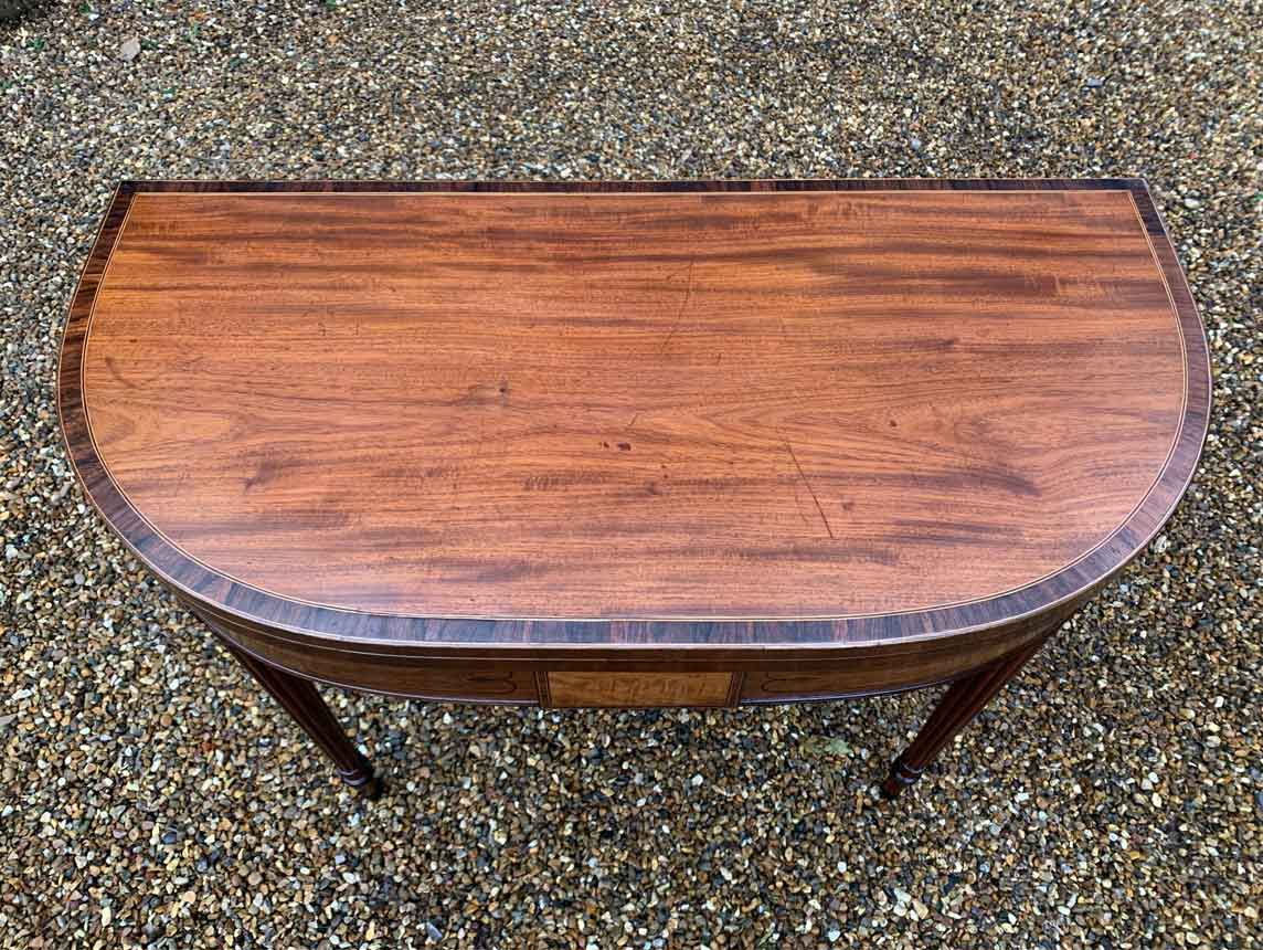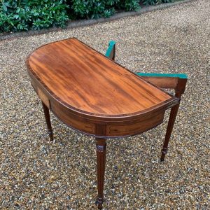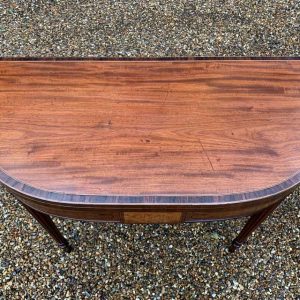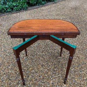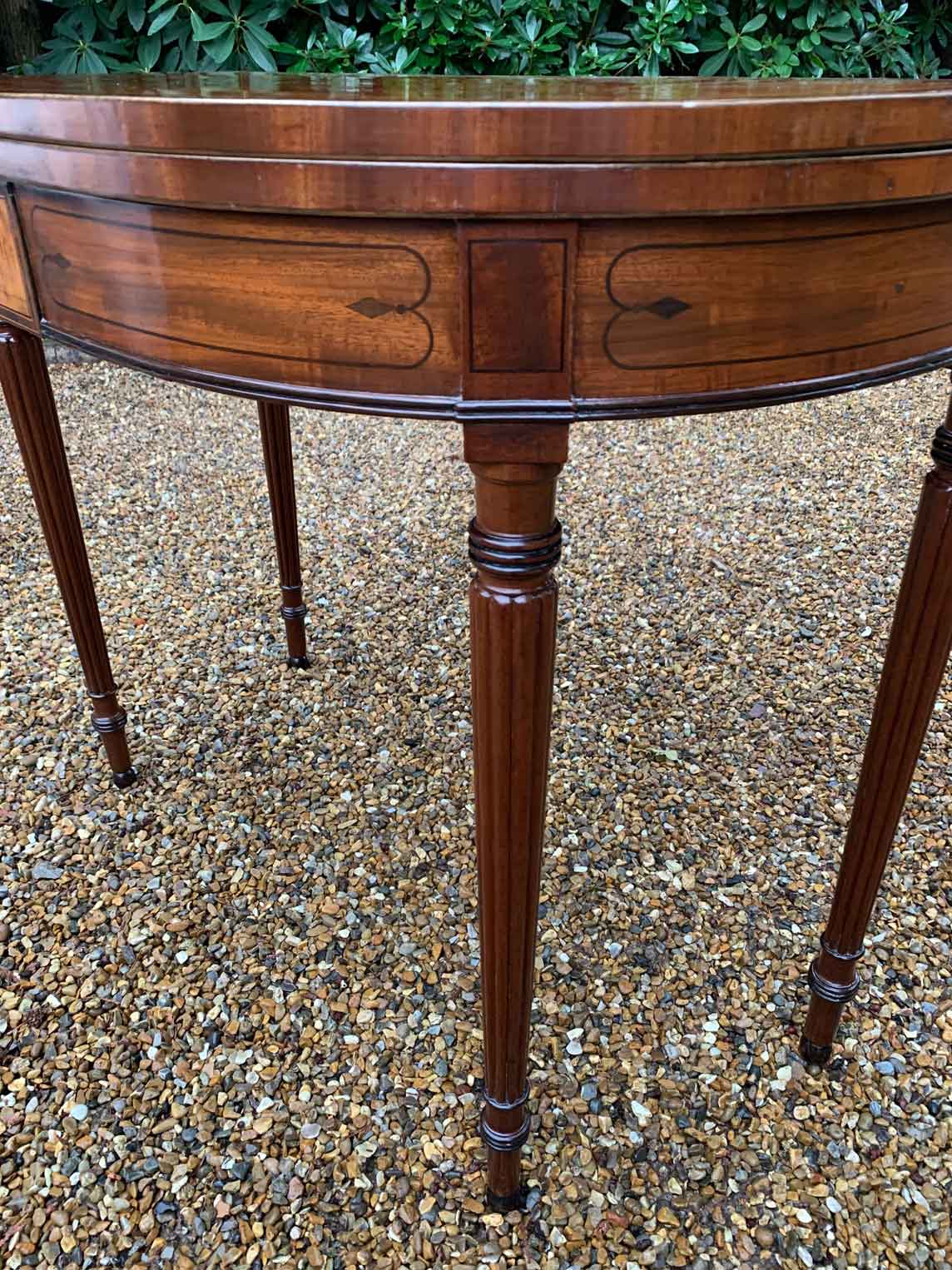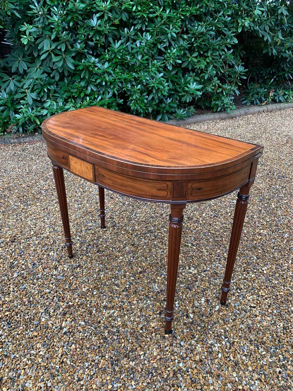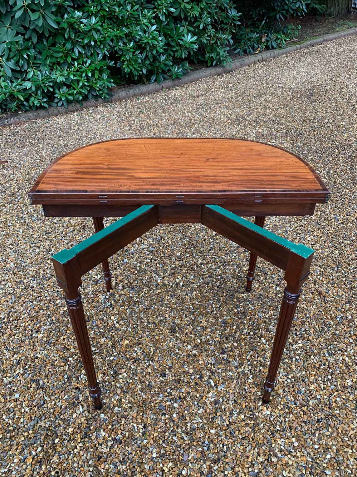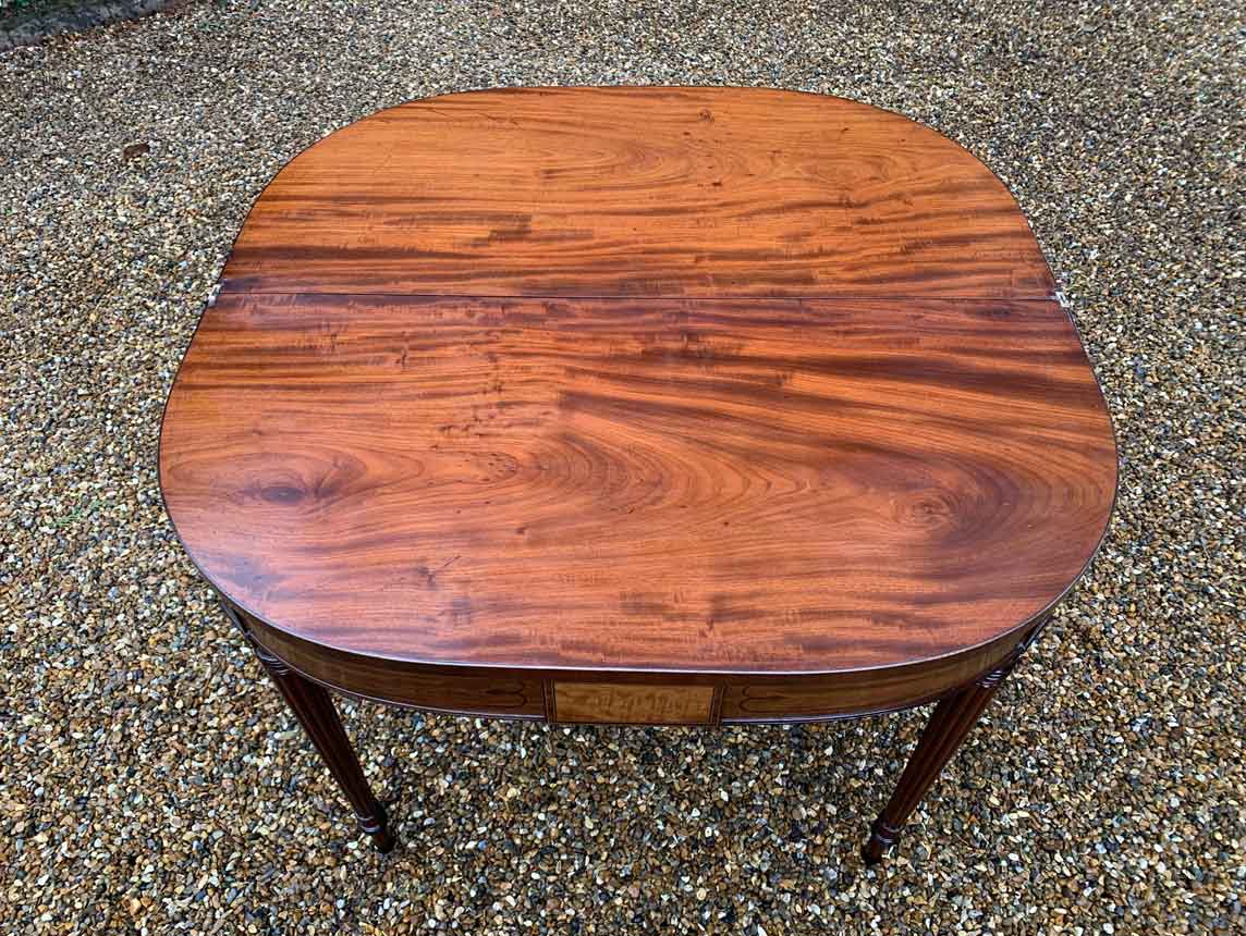 19th Century Regency Mahogany Tea Table with rosewood cross-banding and line inlaid decoration throughout. The two rear legs swing round and opens up to a Tea Table. Standing on turned reeded legs.