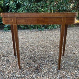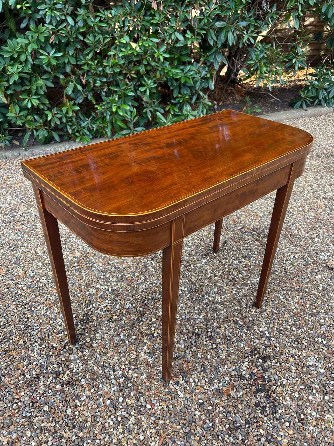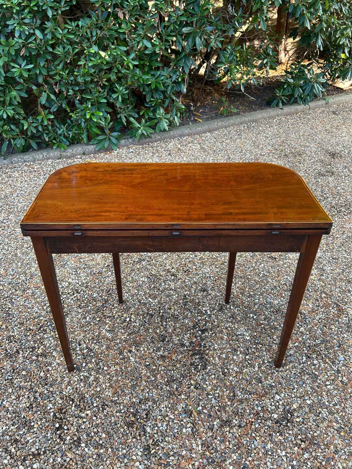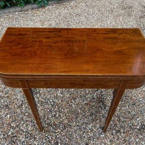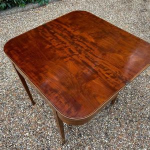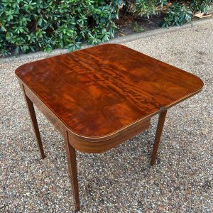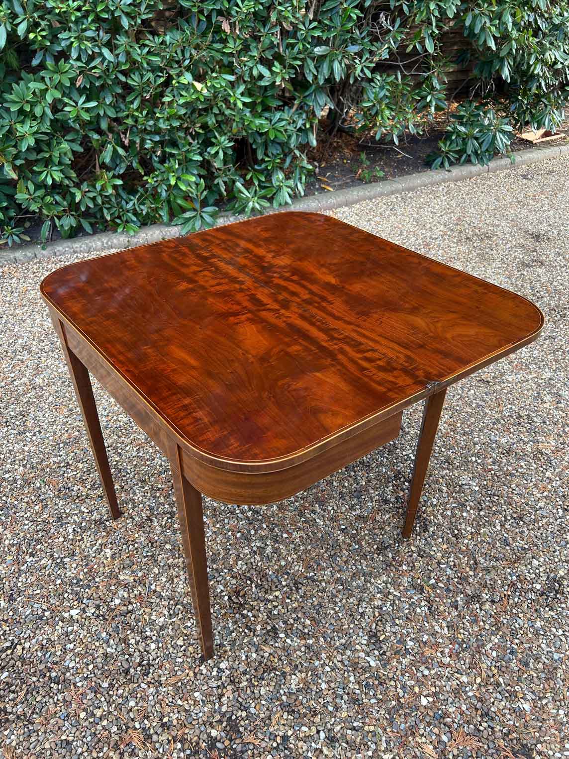 19th Century Georgian Mahogany Tea Table with cross-banding and line inlay throughout on square tapering legs. Rear legs slide back to open into a tea table.