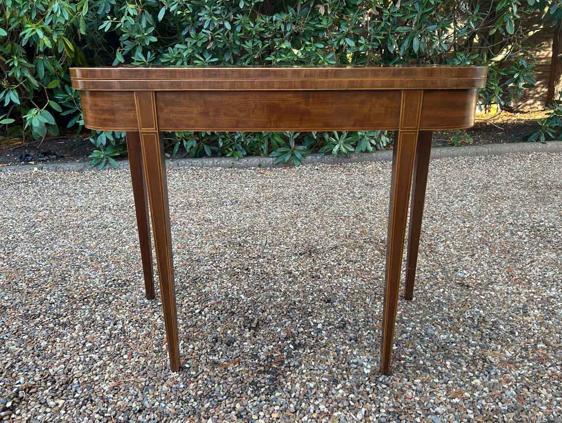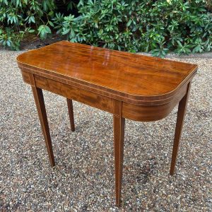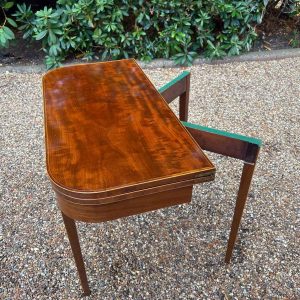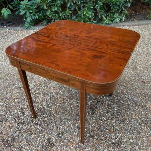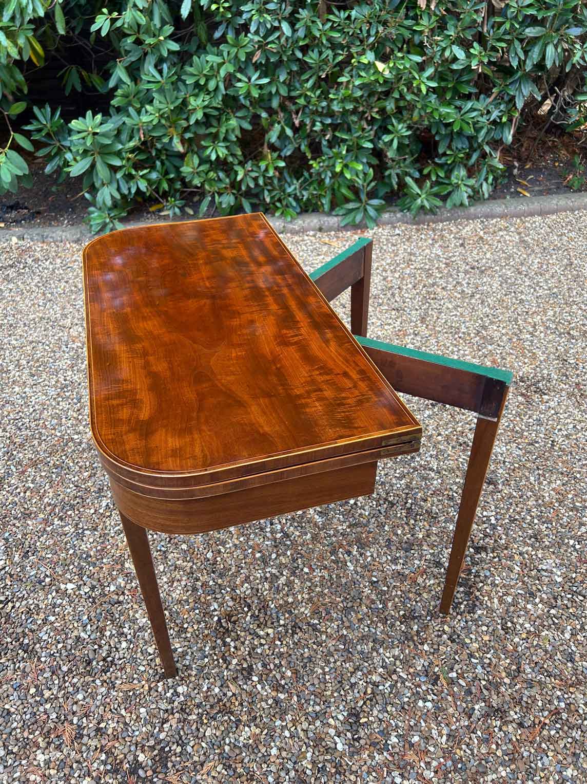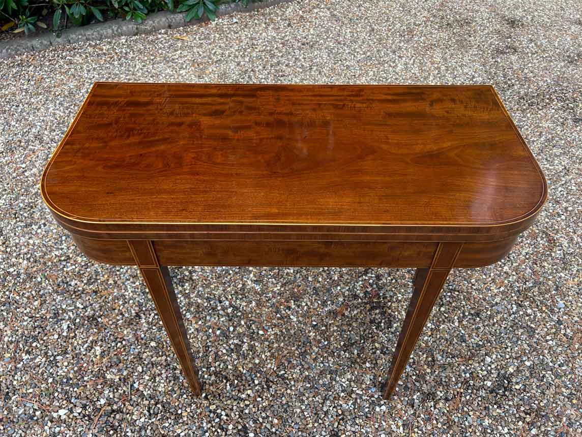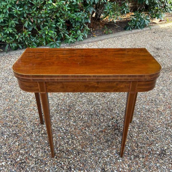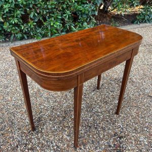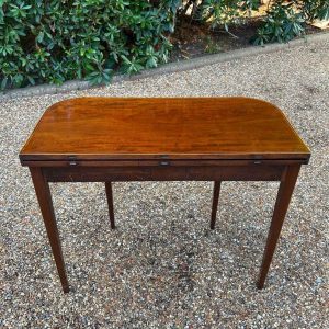 19th Century Georgian Mahogany Tea Table with cross-banding and line inlay throughout on square tapering legs. Rear legs slide back to open into a tea table.