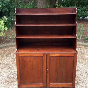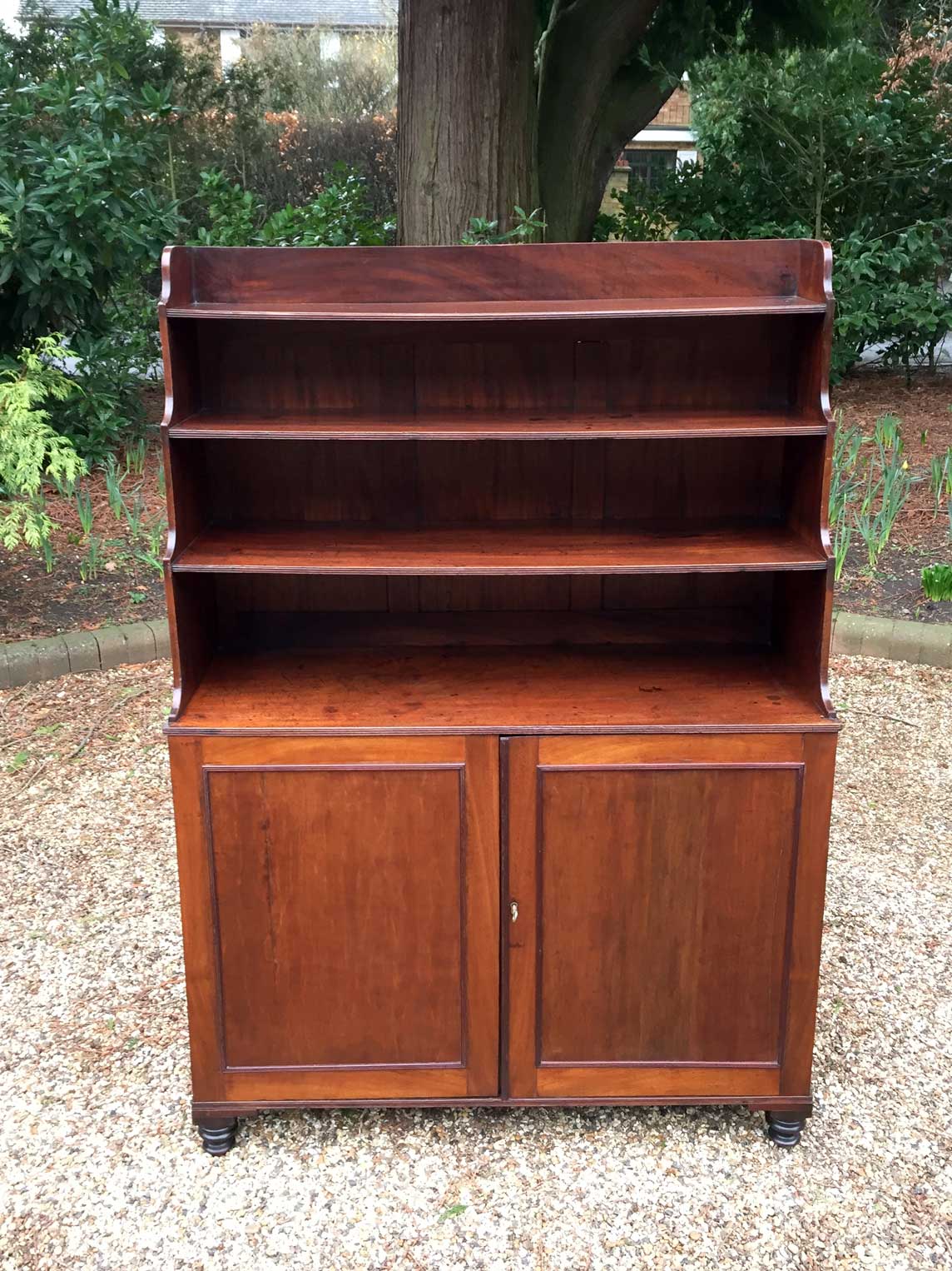 Early 19th Century Georgian Mahogany Waterfall Bookcase Cabinet, the four cascading open shelves above a pair of cupboard doors and panelled mahogany back, on turned feet.