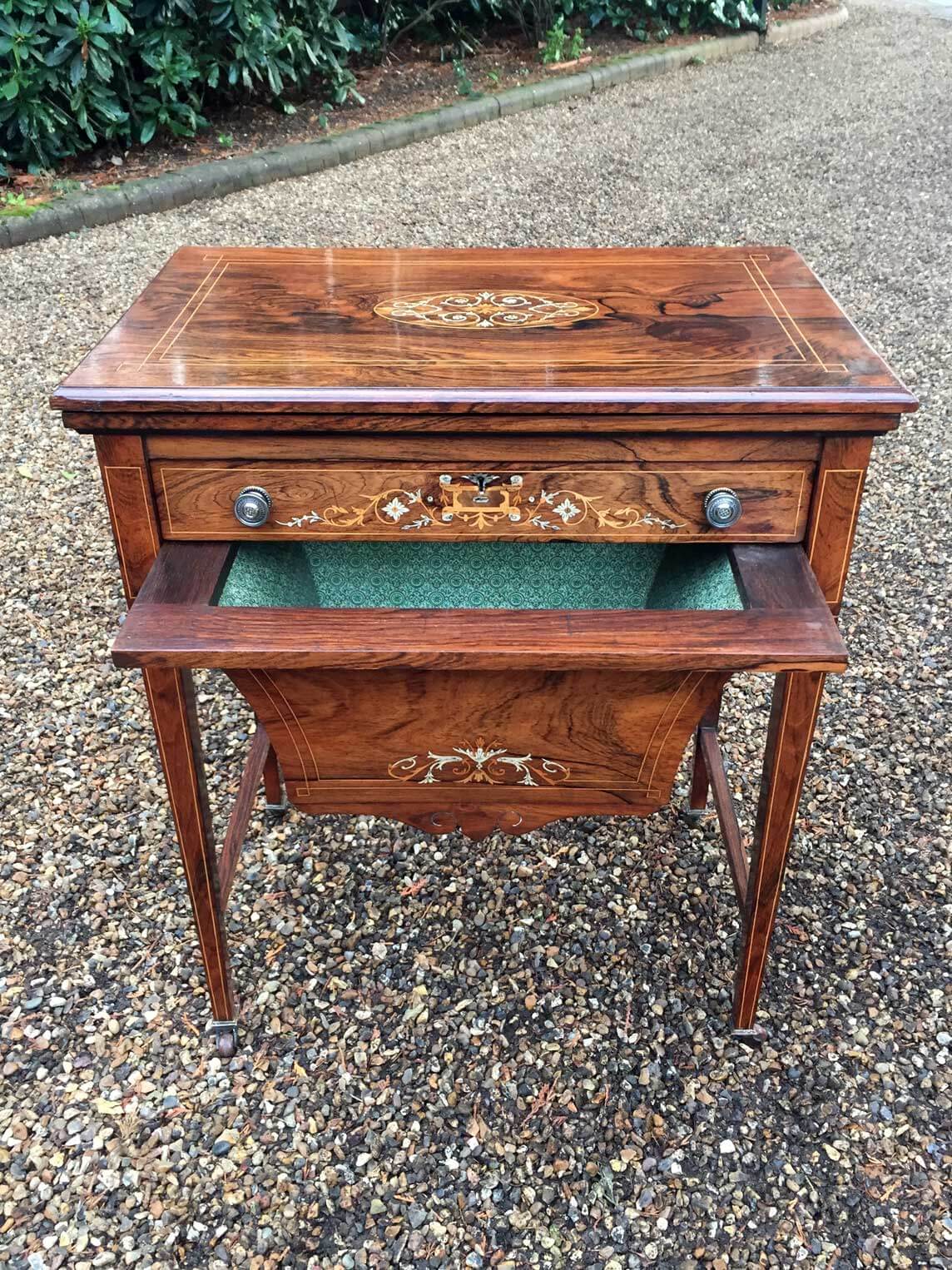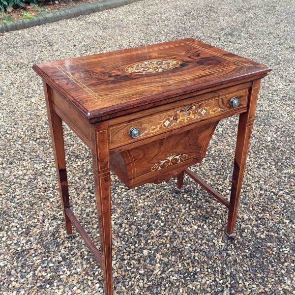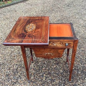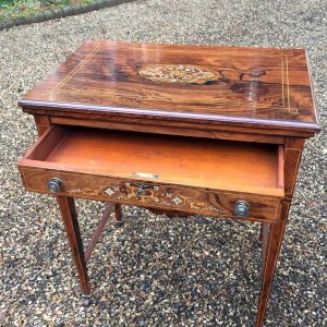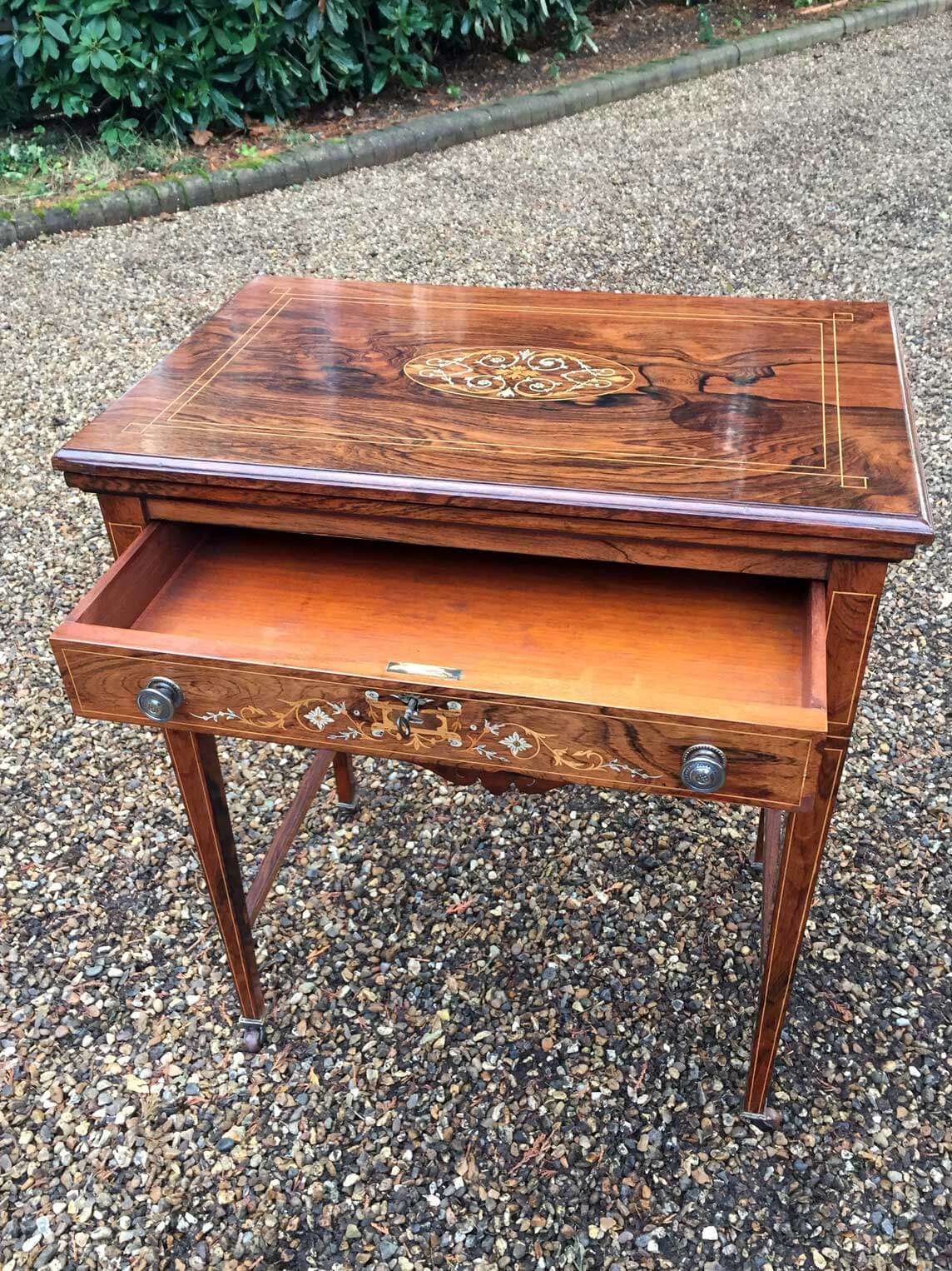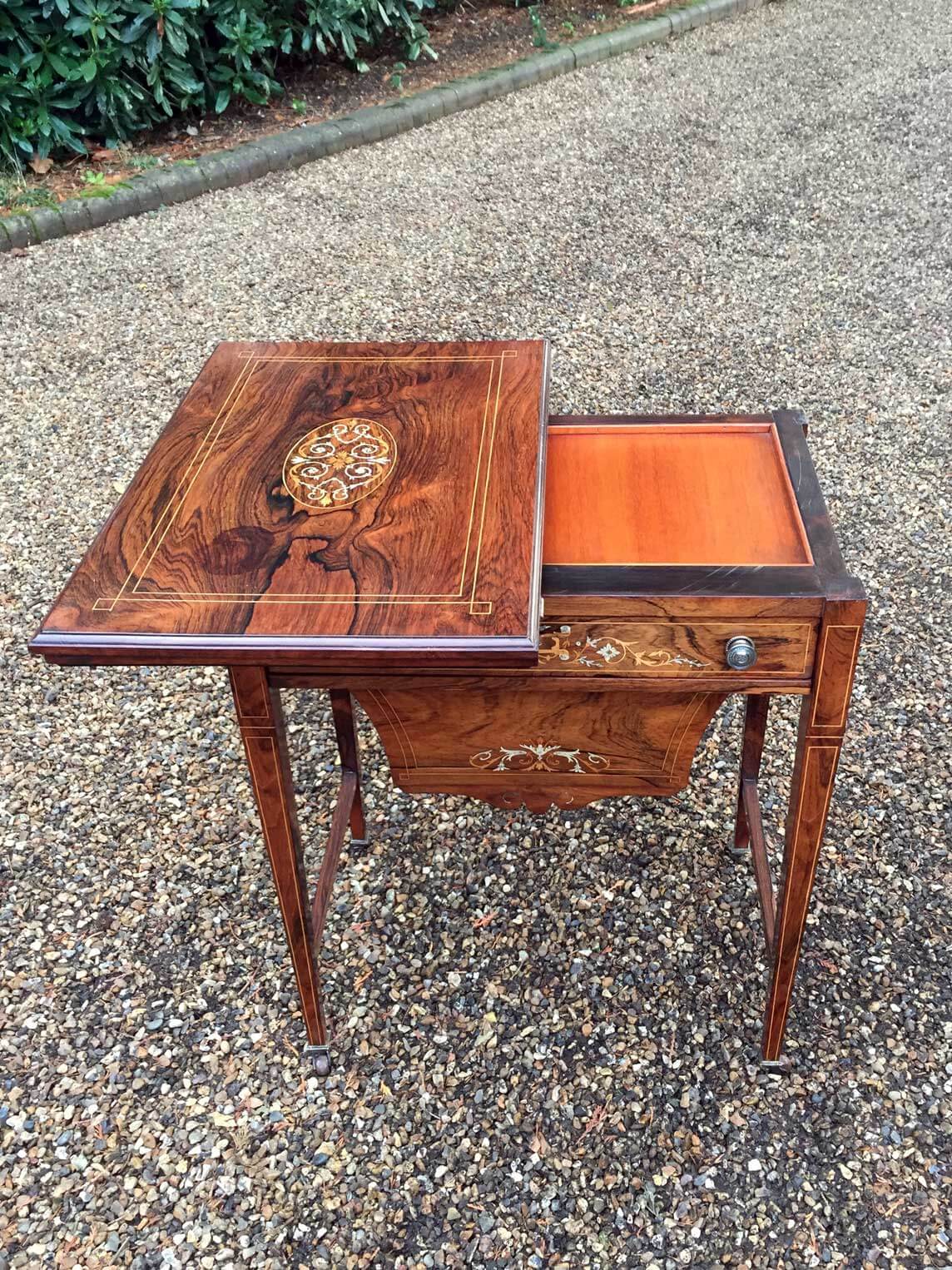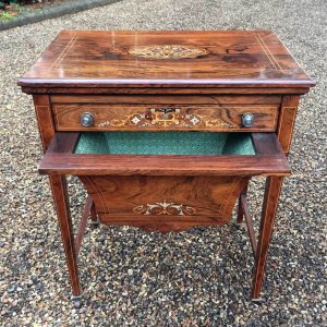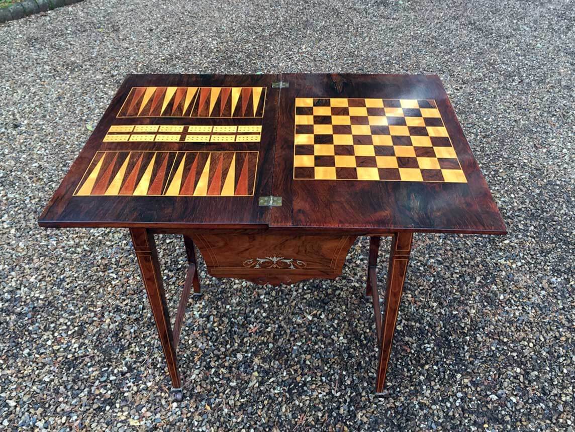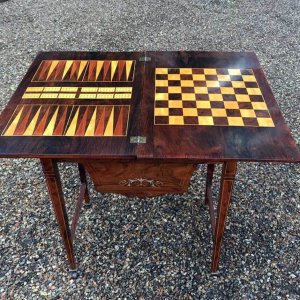 Victorian Rosewood Work / Games Table. Opening up the top reveals a inlaid chess/draughts board, a boxwood, ebony and tulipwood backgammon board and a cribbage board. Beneath the top is a single drawer and a workbox. The table has elegant inlaid supports on castors.