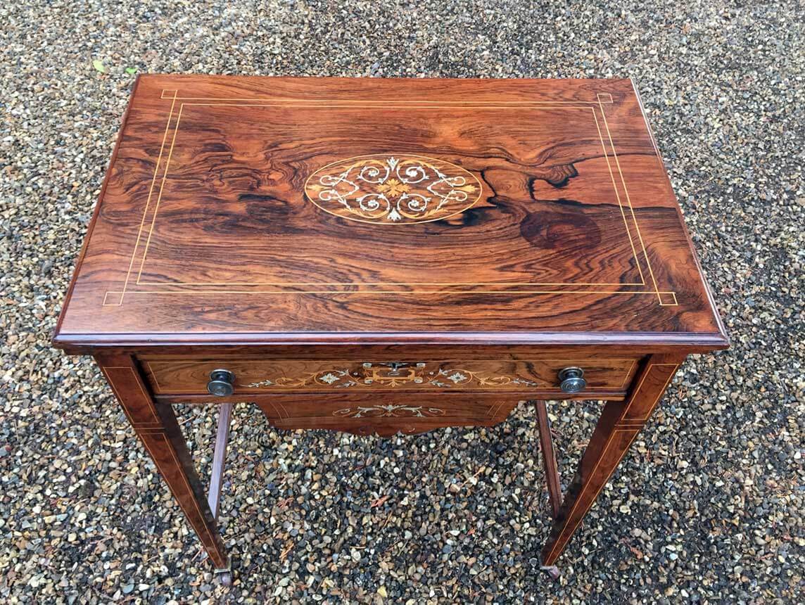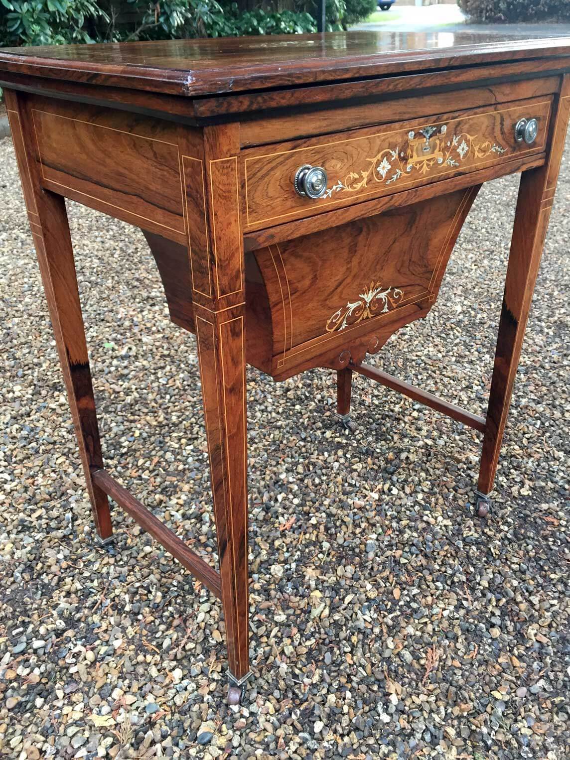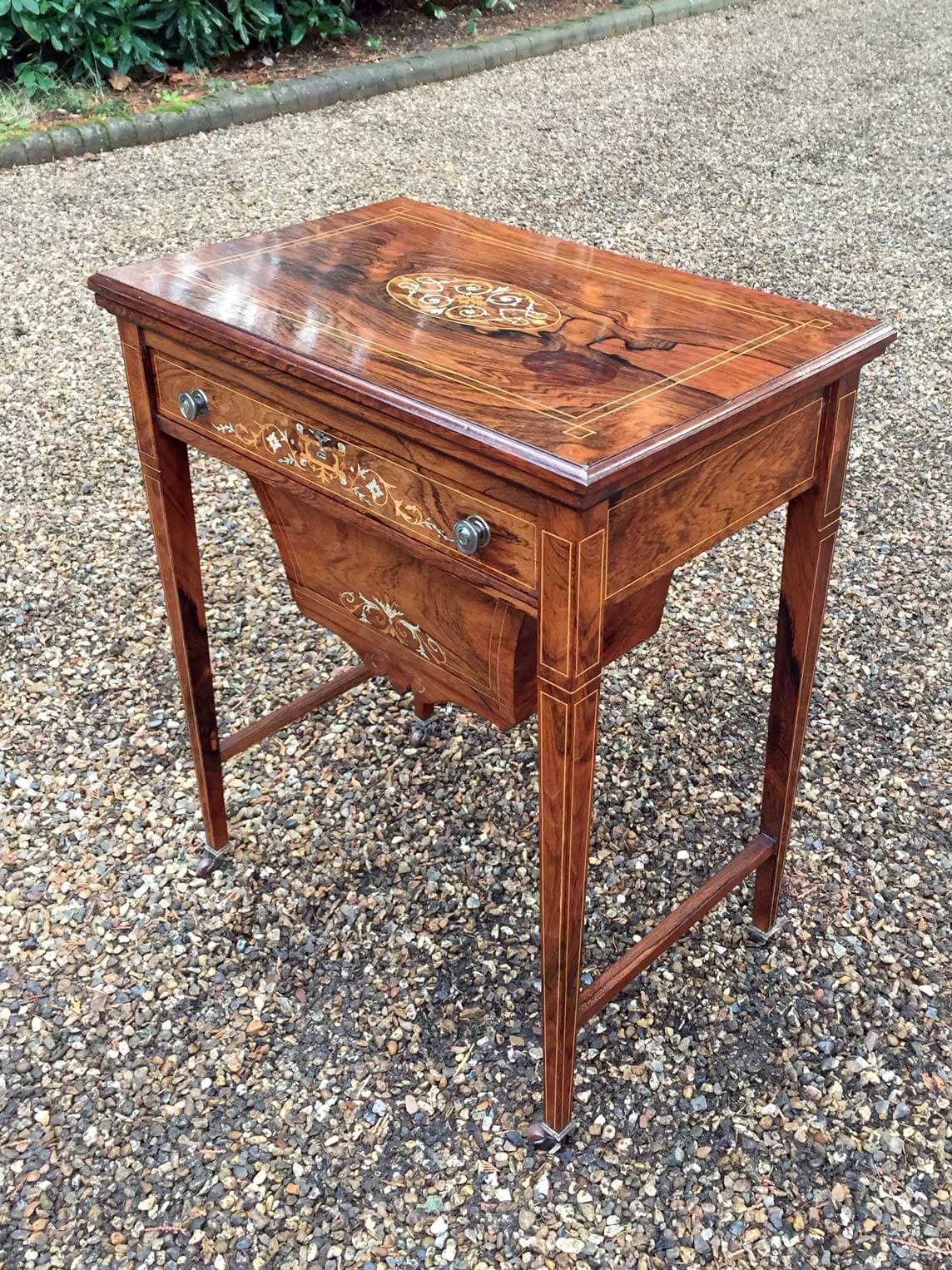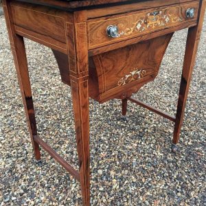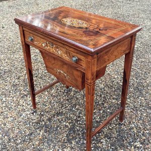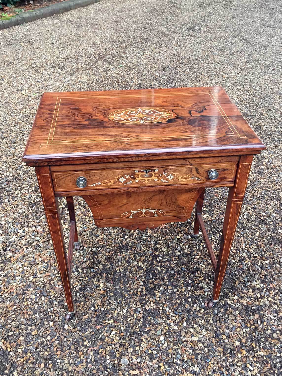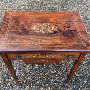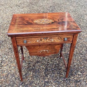 Victorian Rosewood Work / Games Table. Opening up the top reveals a inlaid chess/draughts board, a boxwood, ebony and tulipwood backgammon board and a cribbage board. Beneath the top is a single drawer and a workbox. The table has elegant inlaid supports on castors.