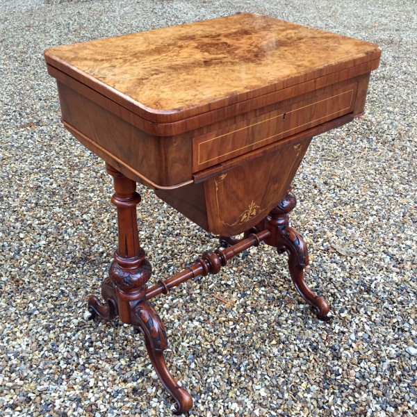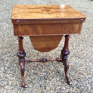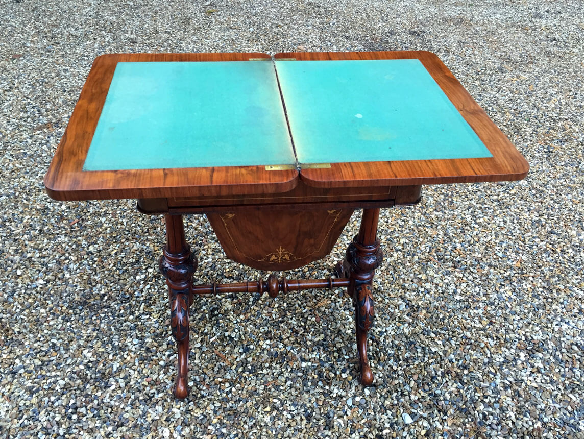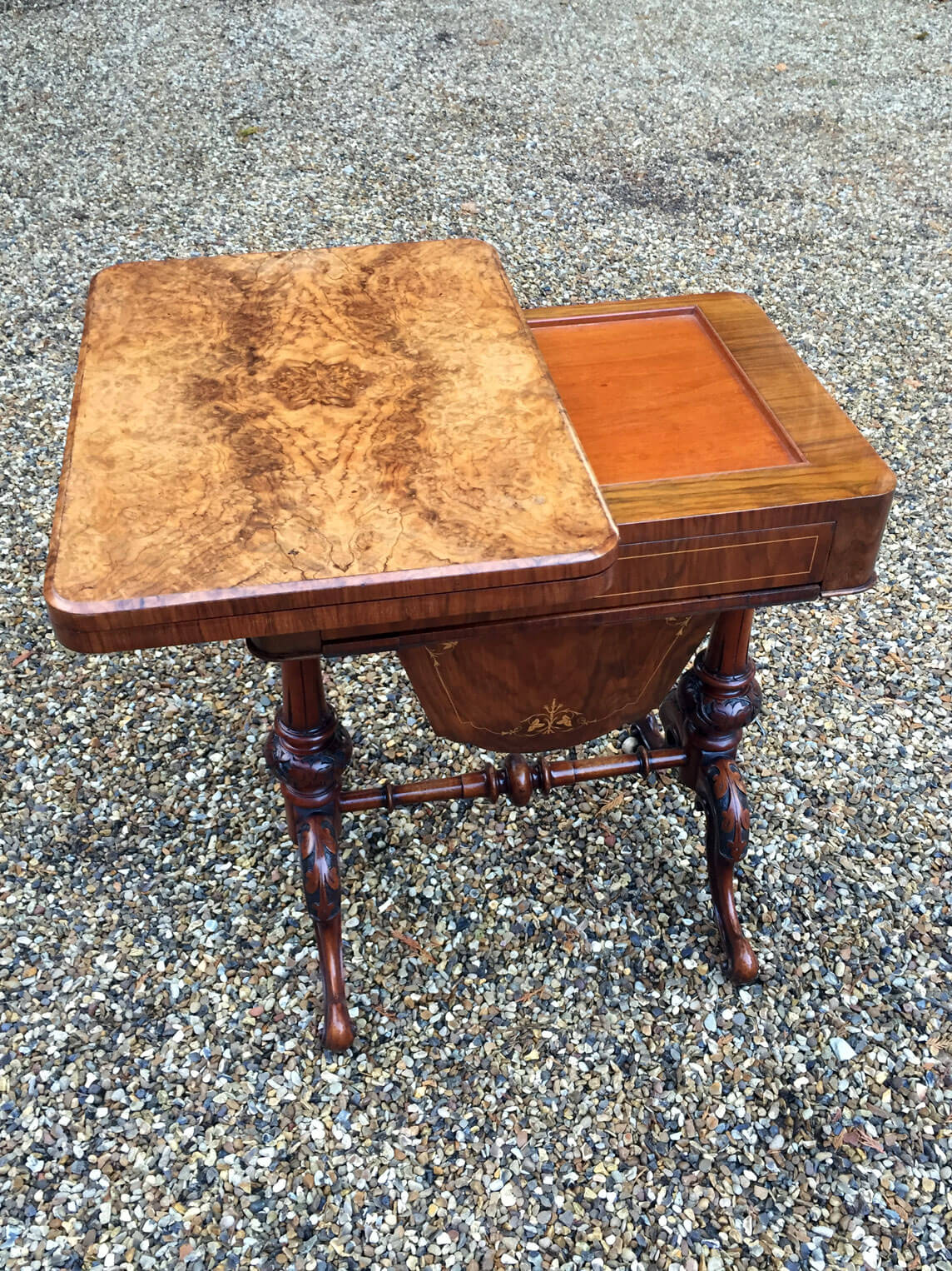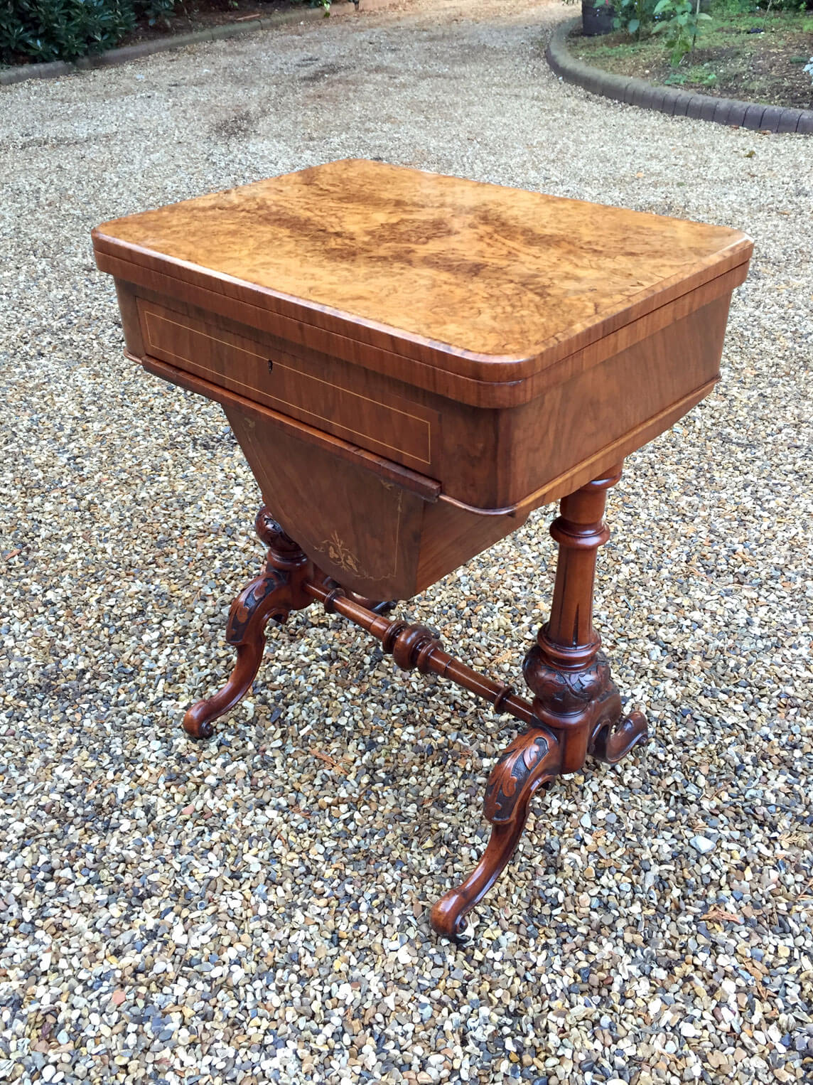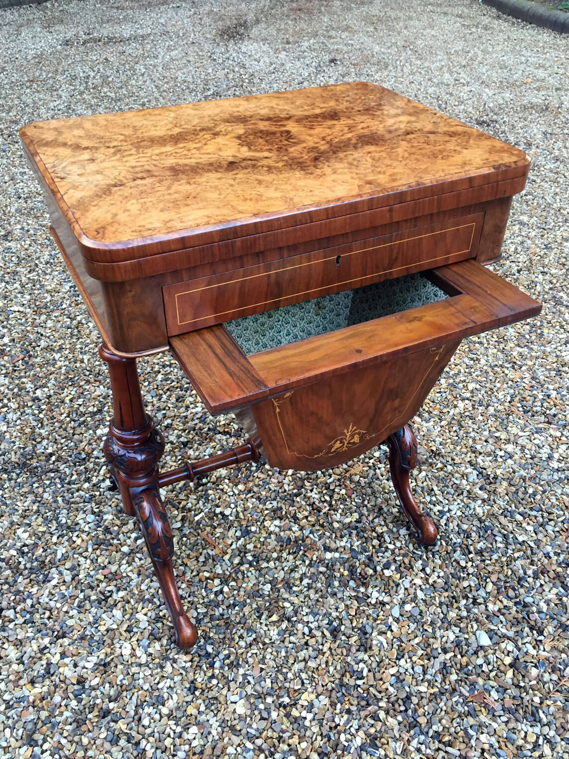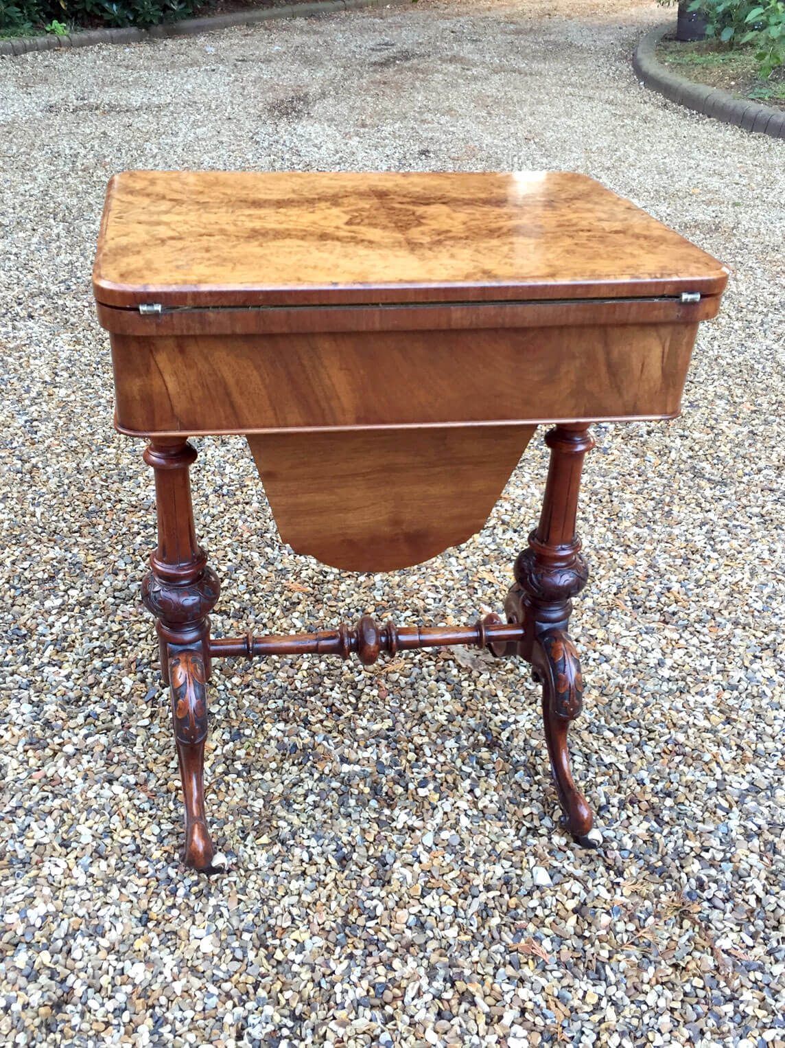 19th Century Walnut Work / Games Table with a folding top above drawer and work box, twin end supports to scrolled legs