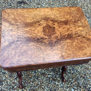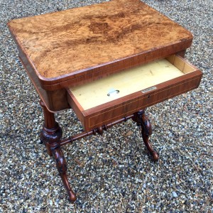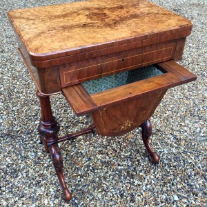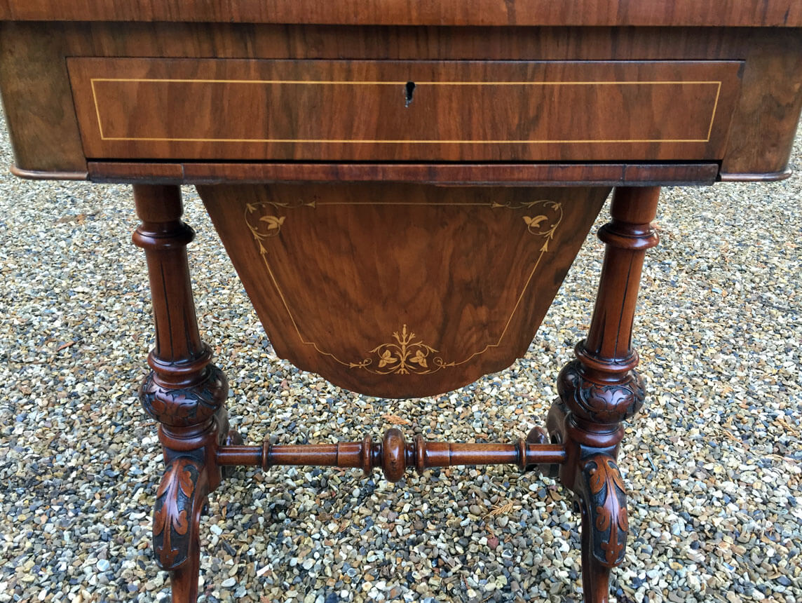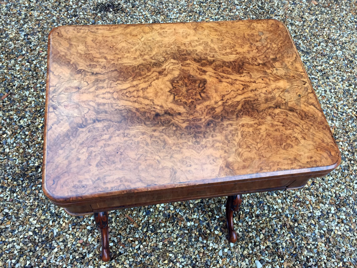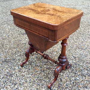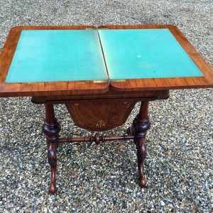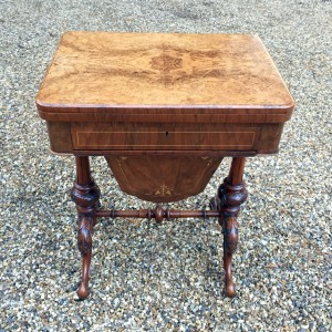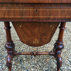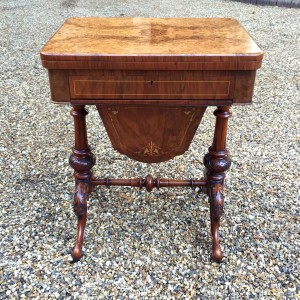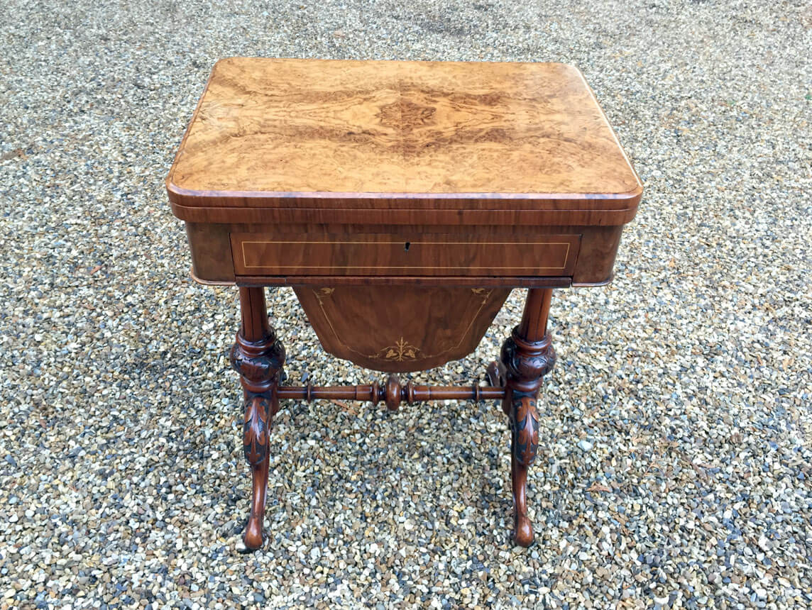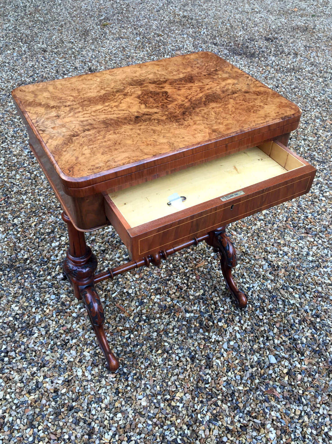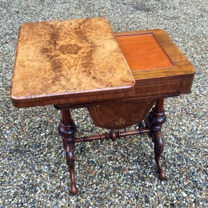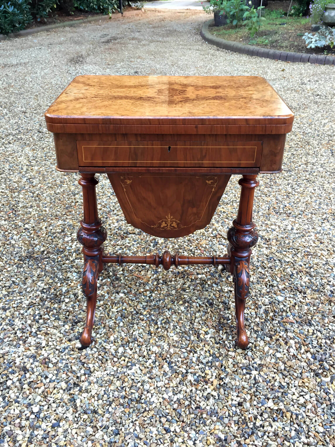 19th Century Walnut Work / Games Table with a folding top above drawer and work box, twin end supports to scrolled legs