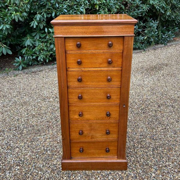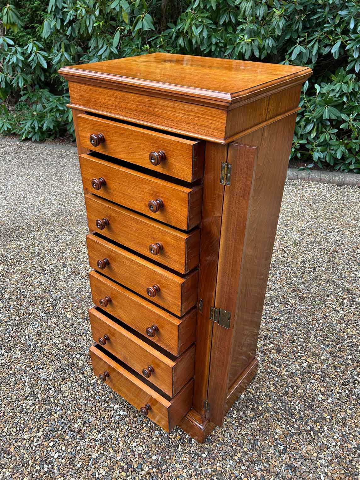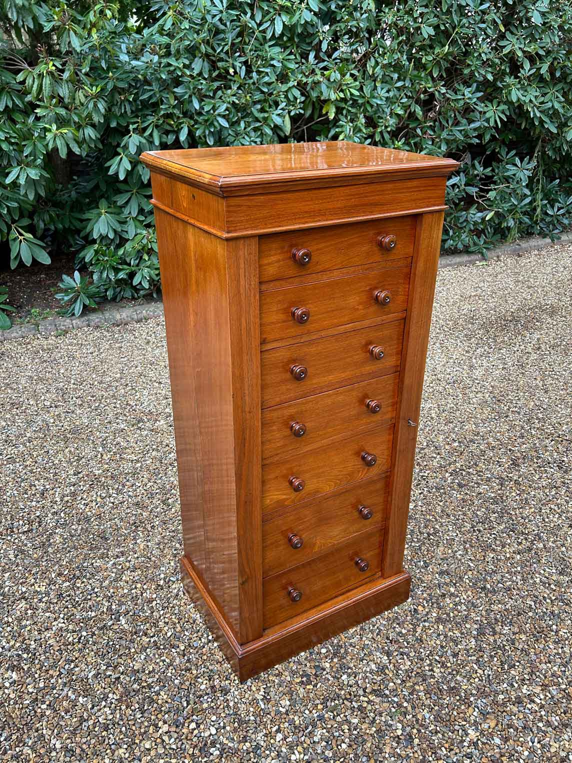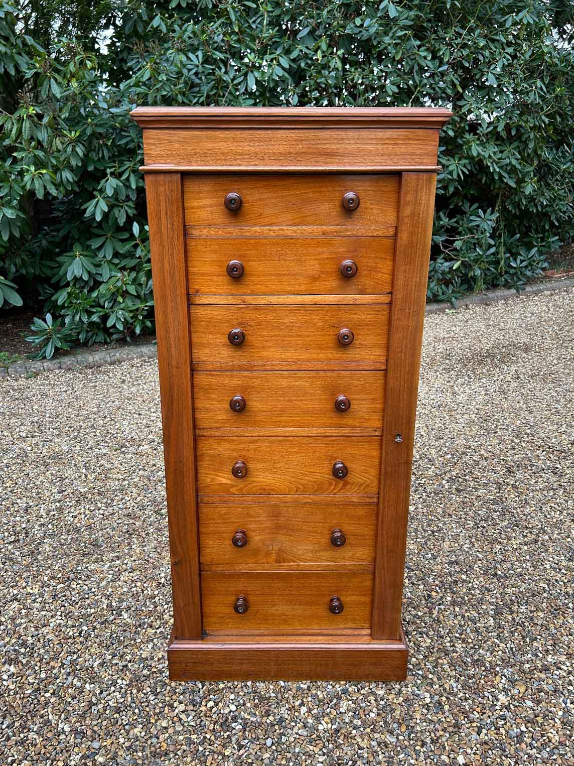A very high quality 19th Century Victorian Walnut Wellington Chest with seven mahogany lined drawers, turned walnut bun handles and plinth base. With working key.