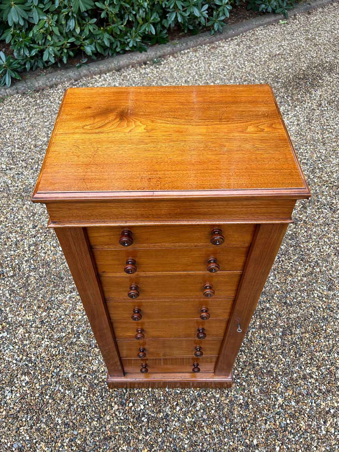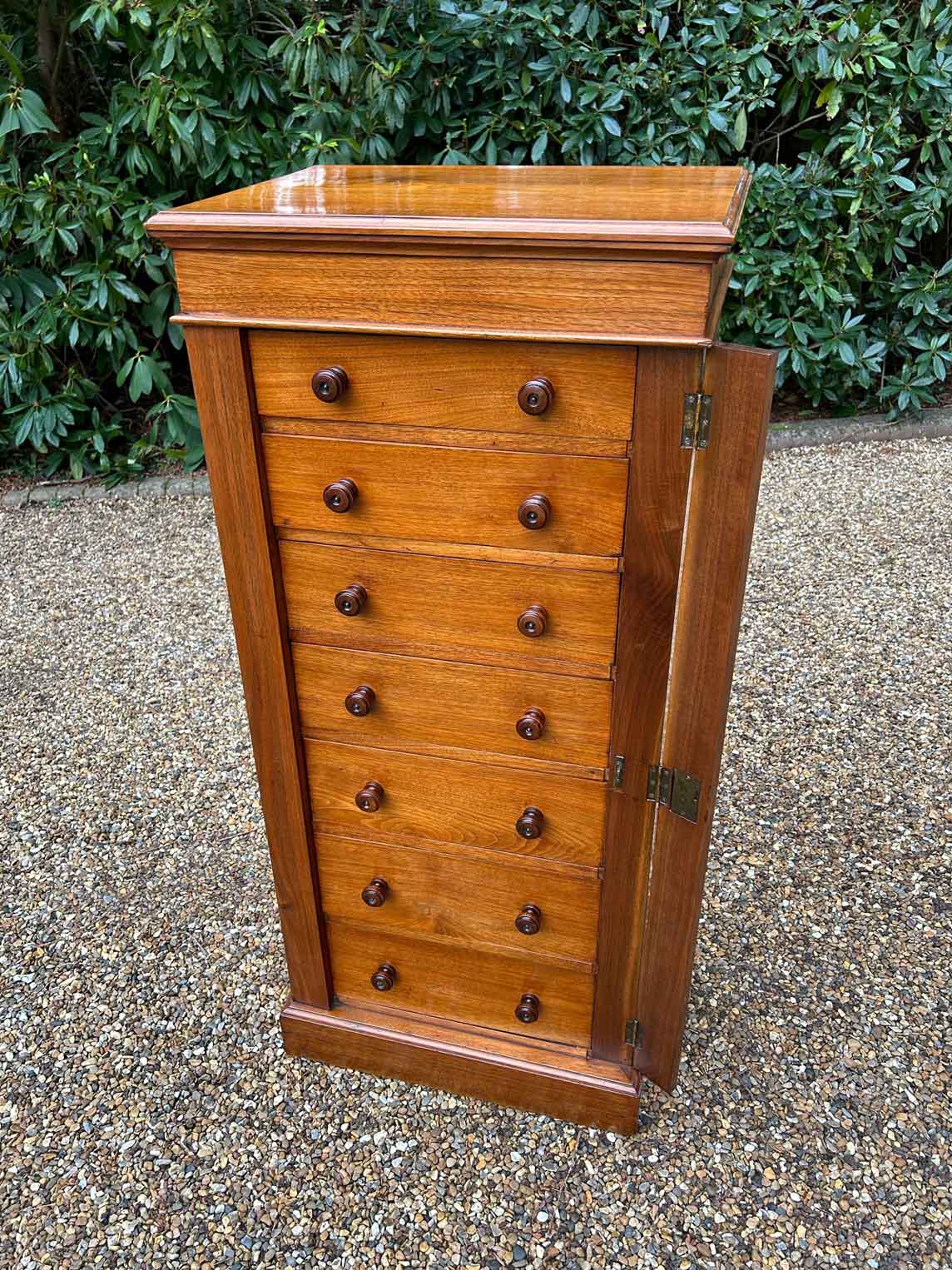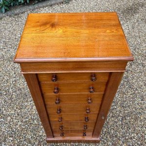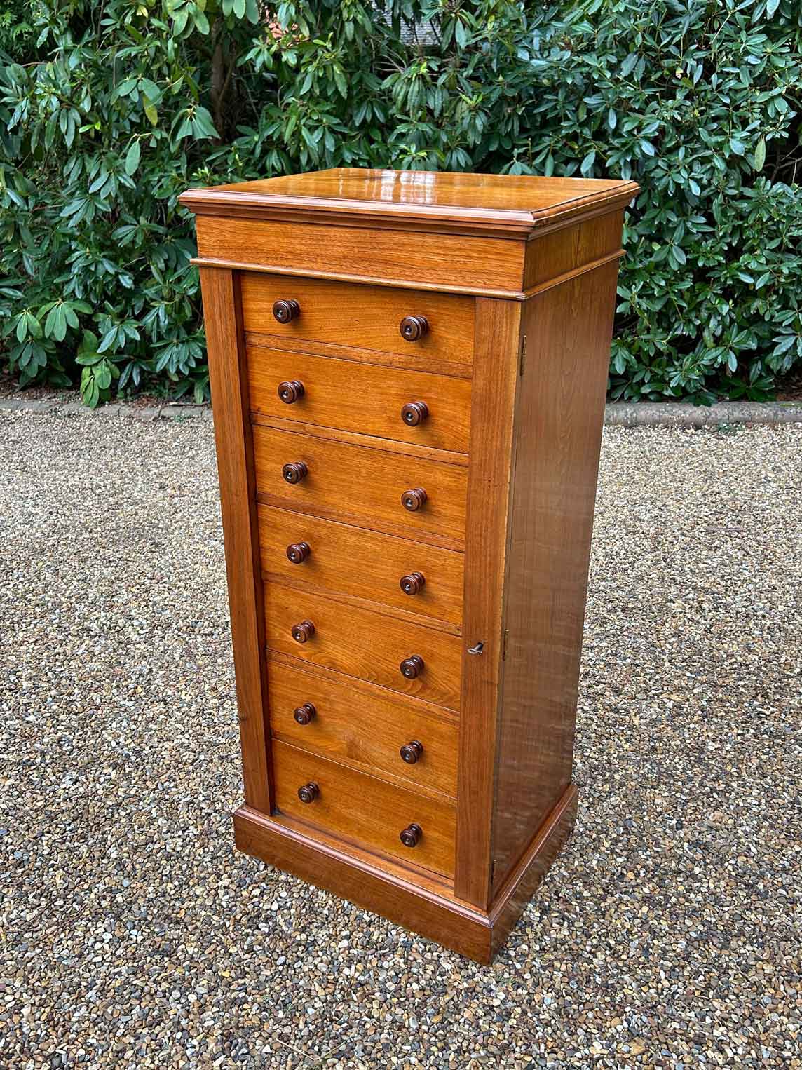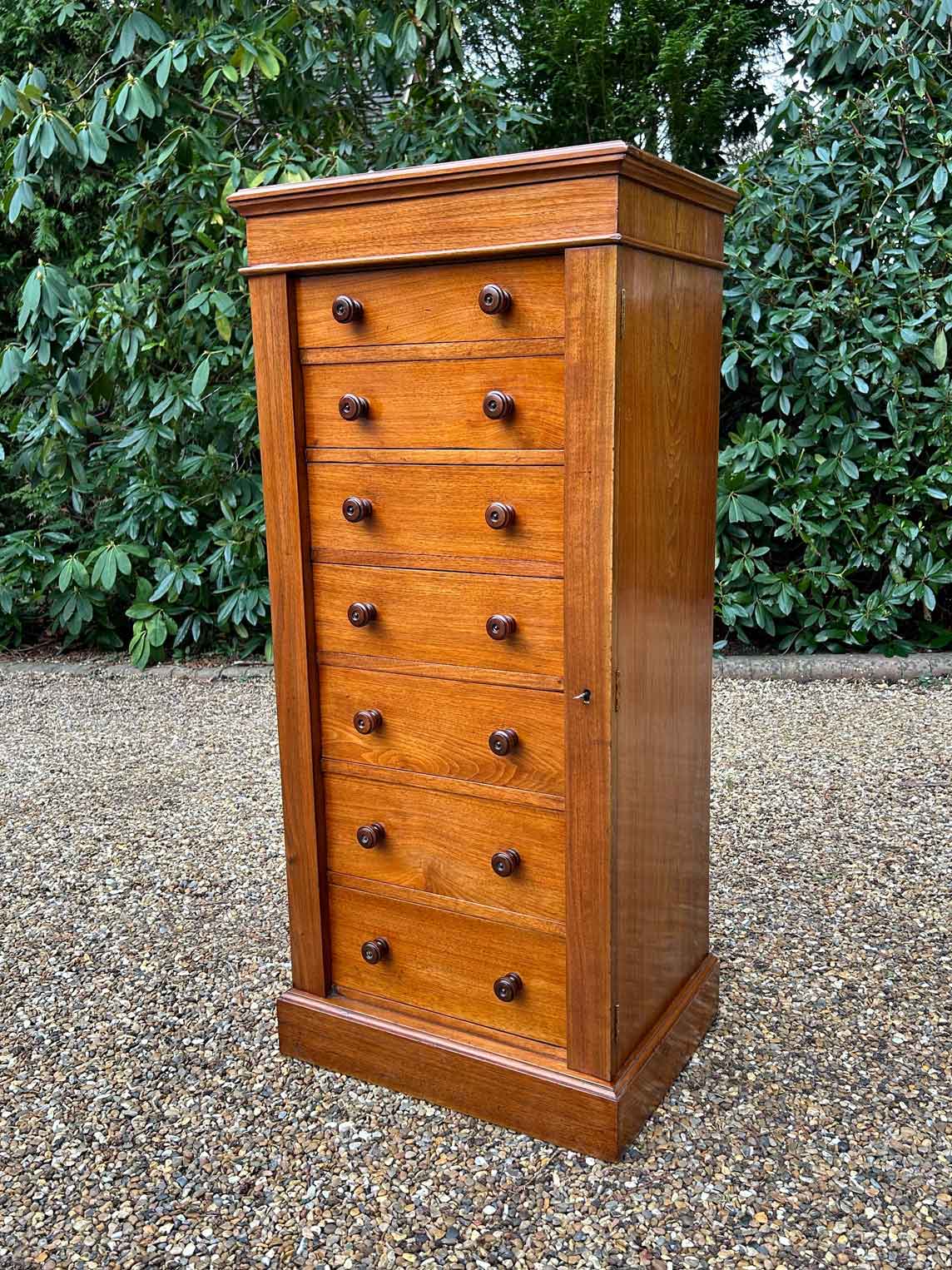 A very high quality 19th Century Victorian Walnut Wellington Chest with seven mahogany lined drawers, turned walnut bun handles and plinth base. With working key.