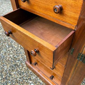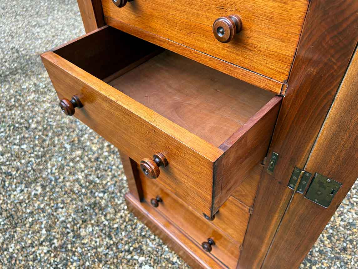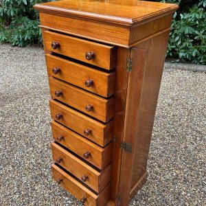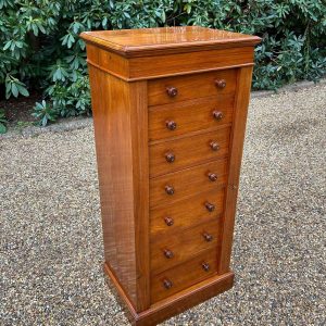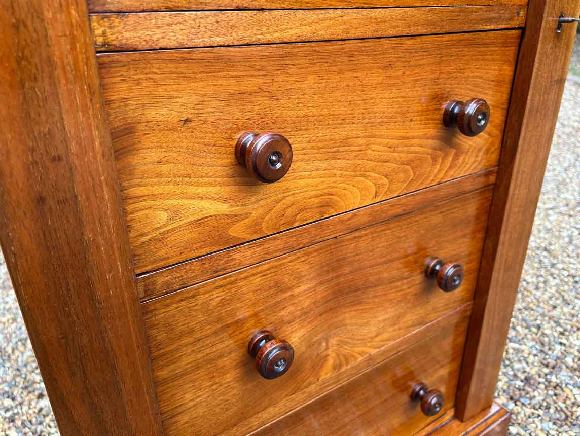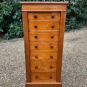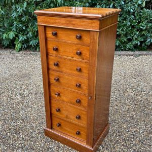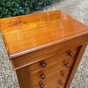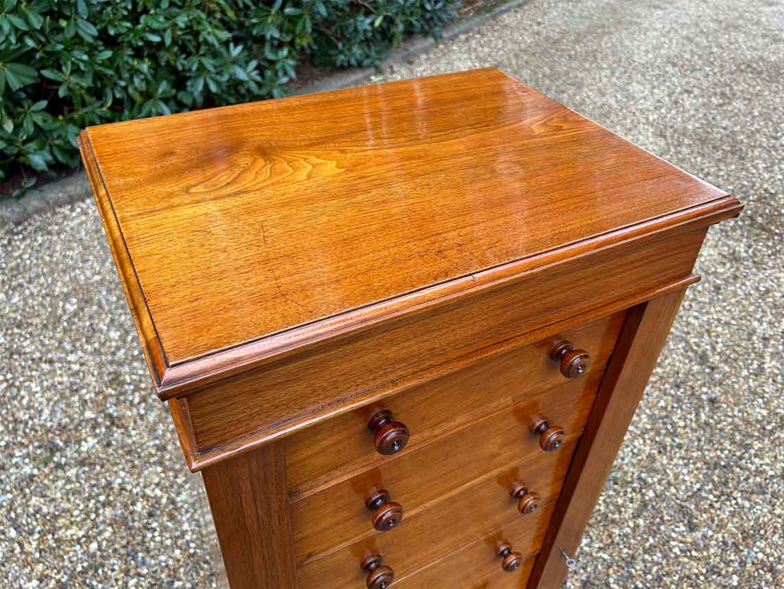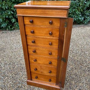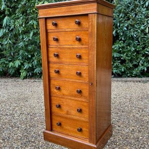 A very high quality 19th Century Victorian Walnut Wellington Chest with seven mahogany lined drawers, turned walnut bun handles and plinth base. With working key.