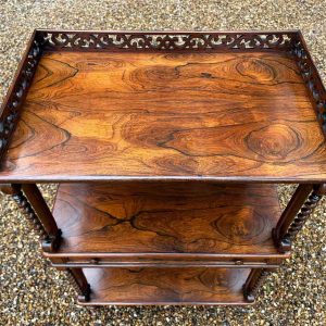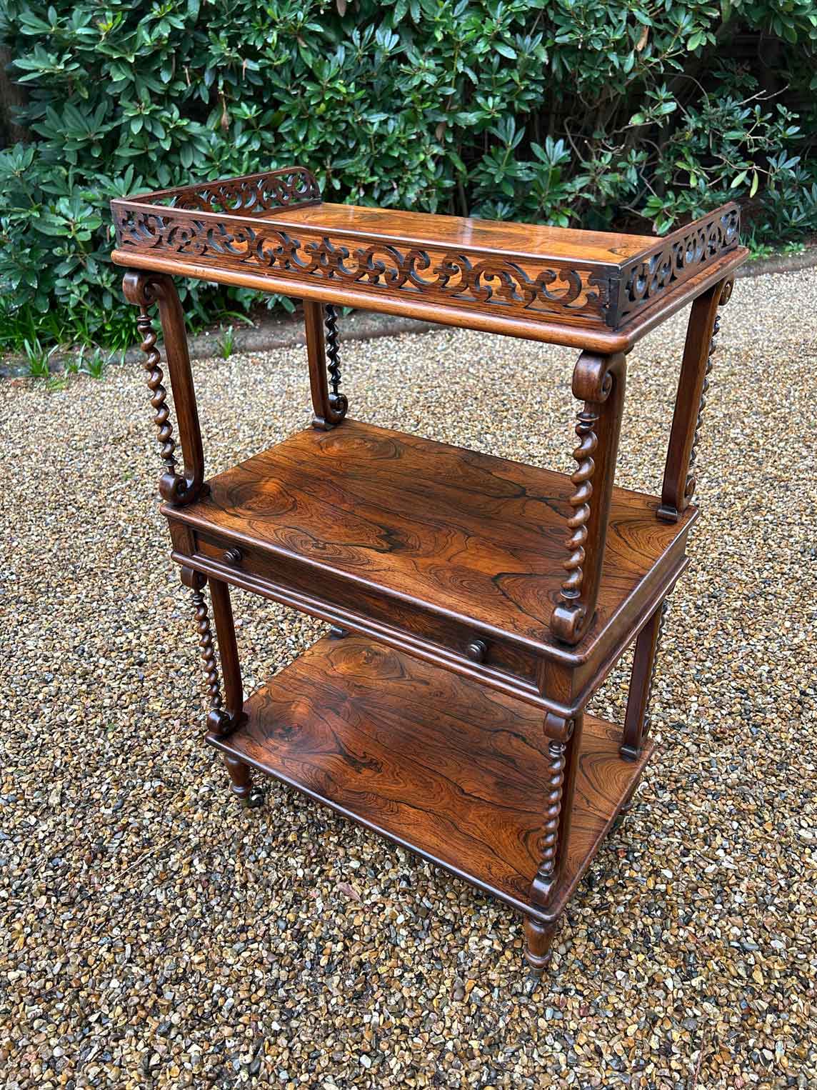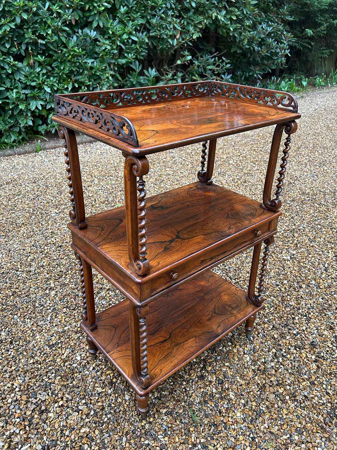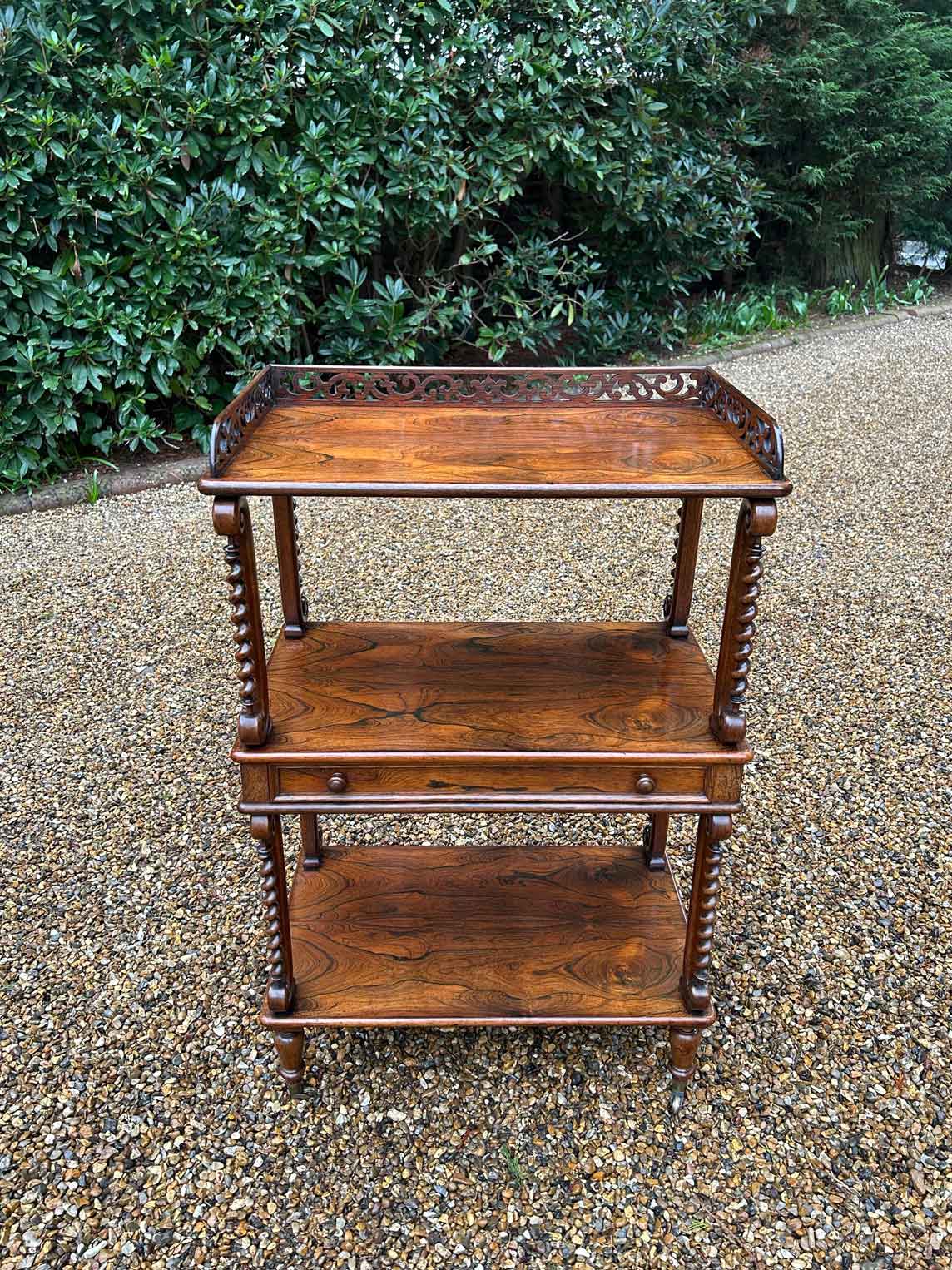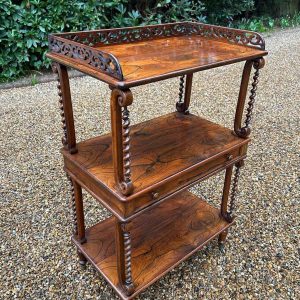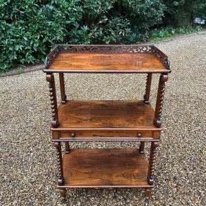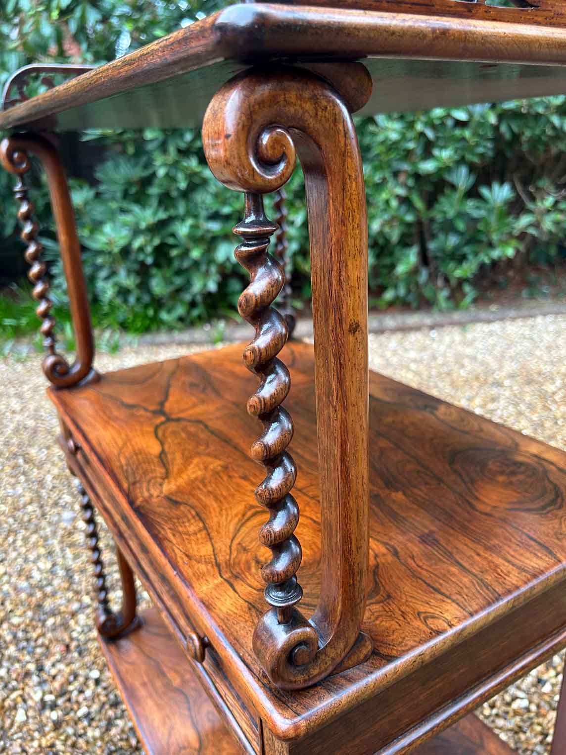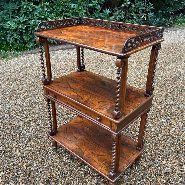 19th Century William IV Rosewood Whatnot, with pierced three quarter fret carved gallery, over three tiers raised on turned spiral barley twist rosewood uprights, with a drawer to one shelf and dummy drawer on the back, all standing on turned legs and castors.
