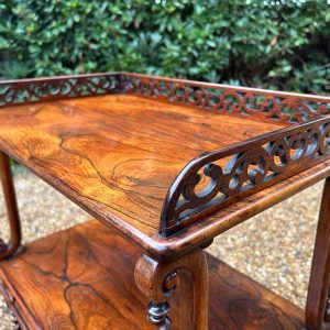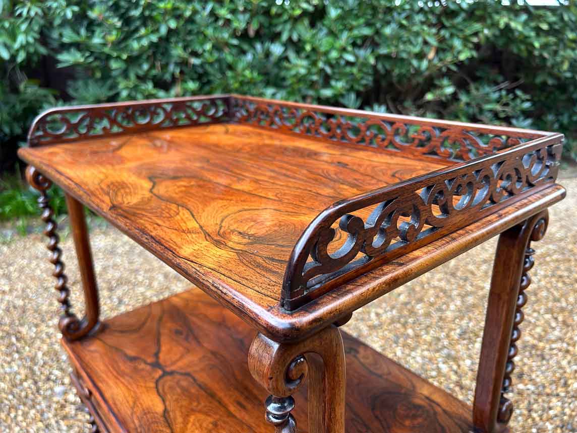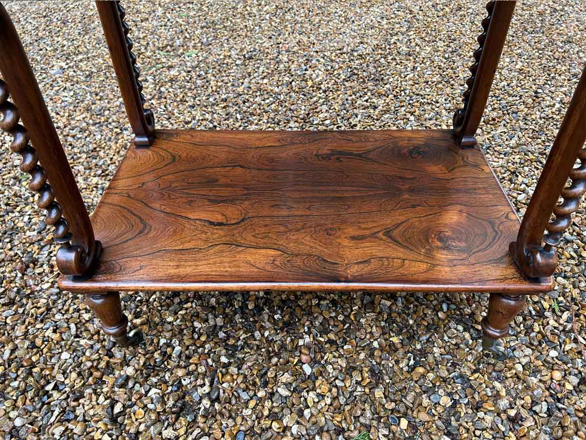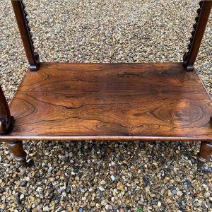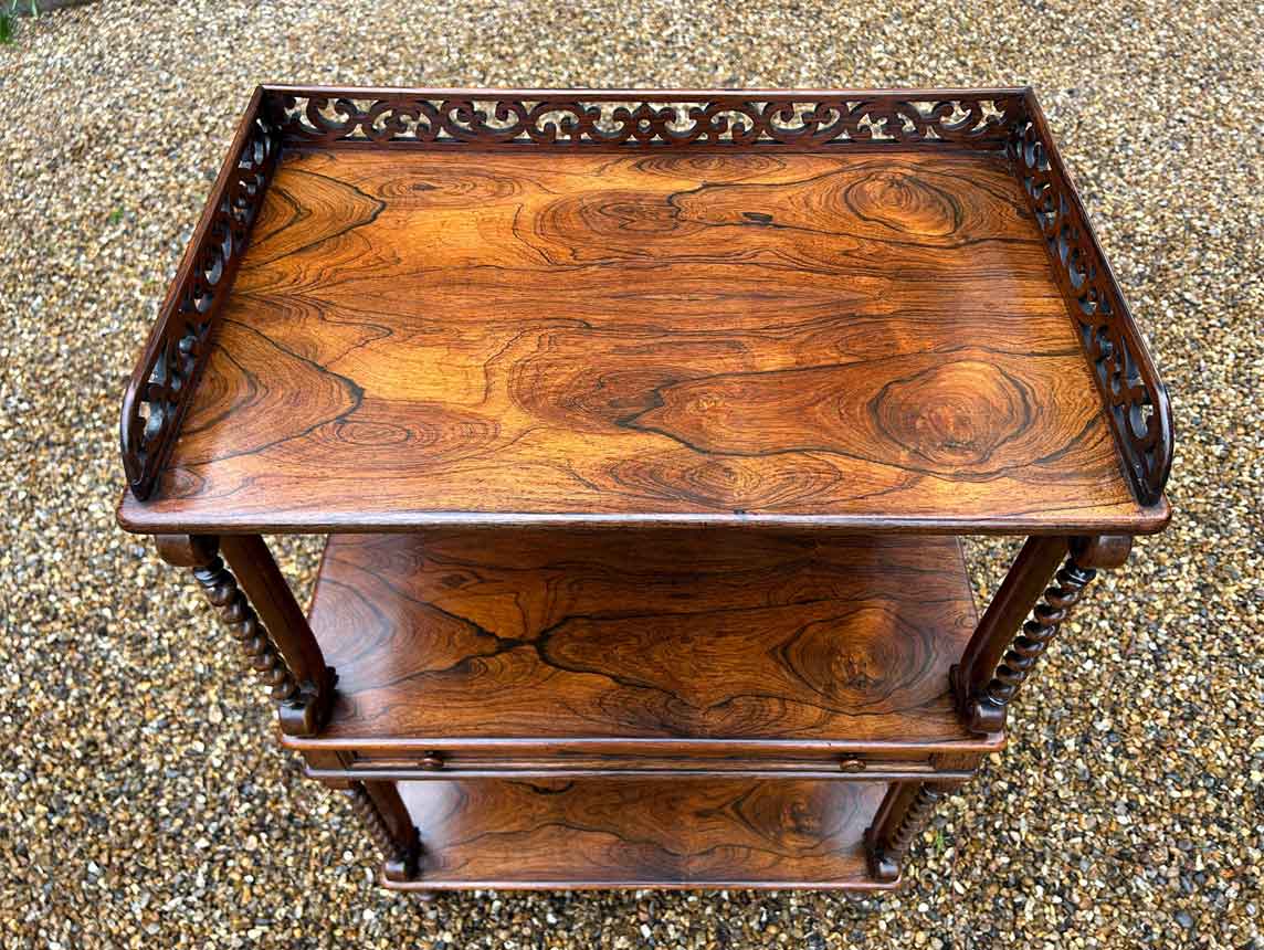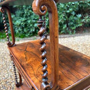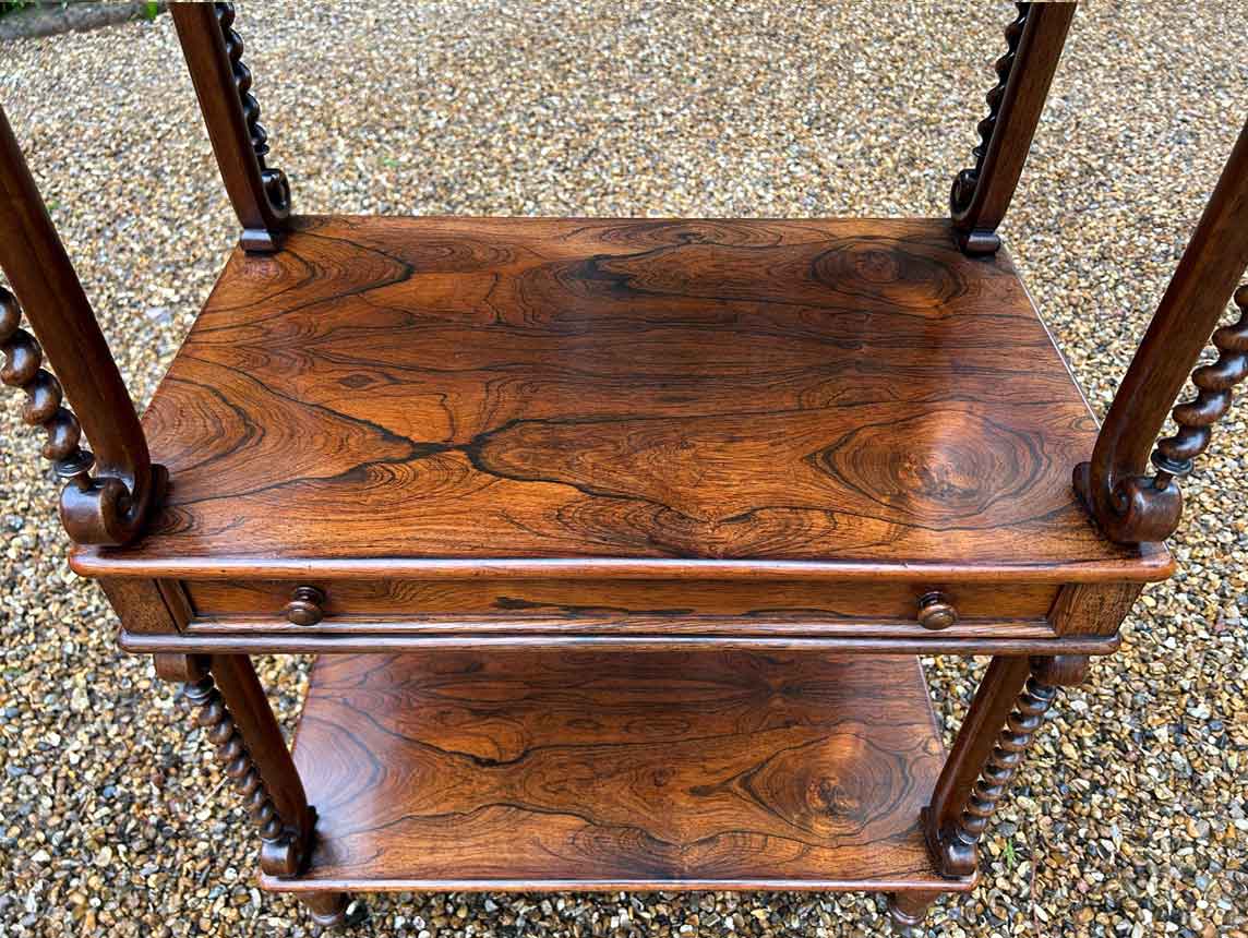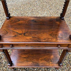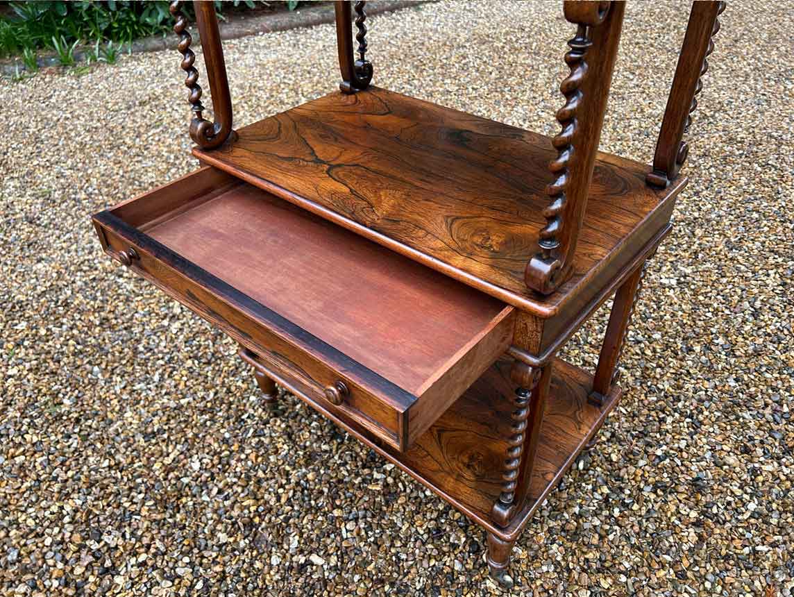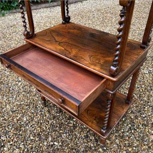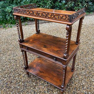 19th Century William IV Rosewood Whatnot, with pierced three quarter fret carved gallery, over three tiers raised on turned spiral barley twist rosewood uprights, with a drawer to one shelf and dummy drawer on the back, all standing on turned legs and castors.