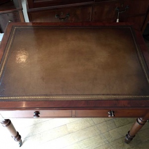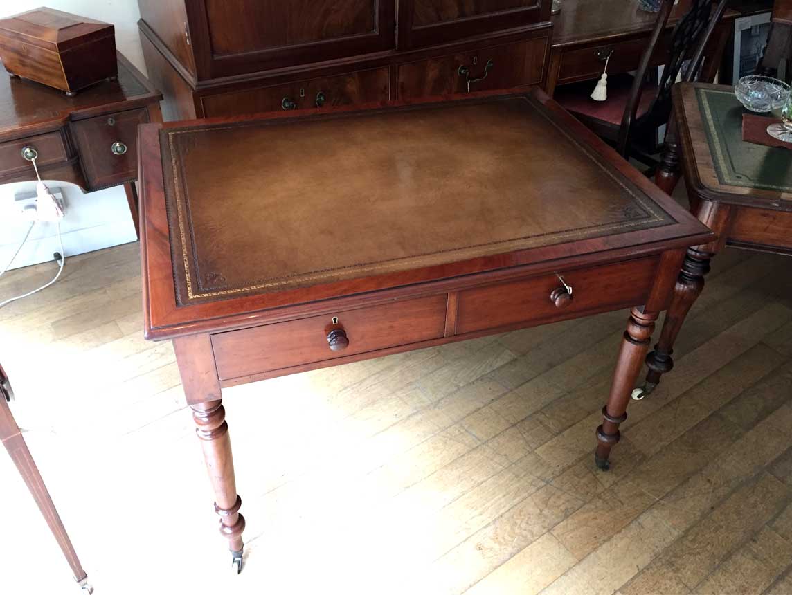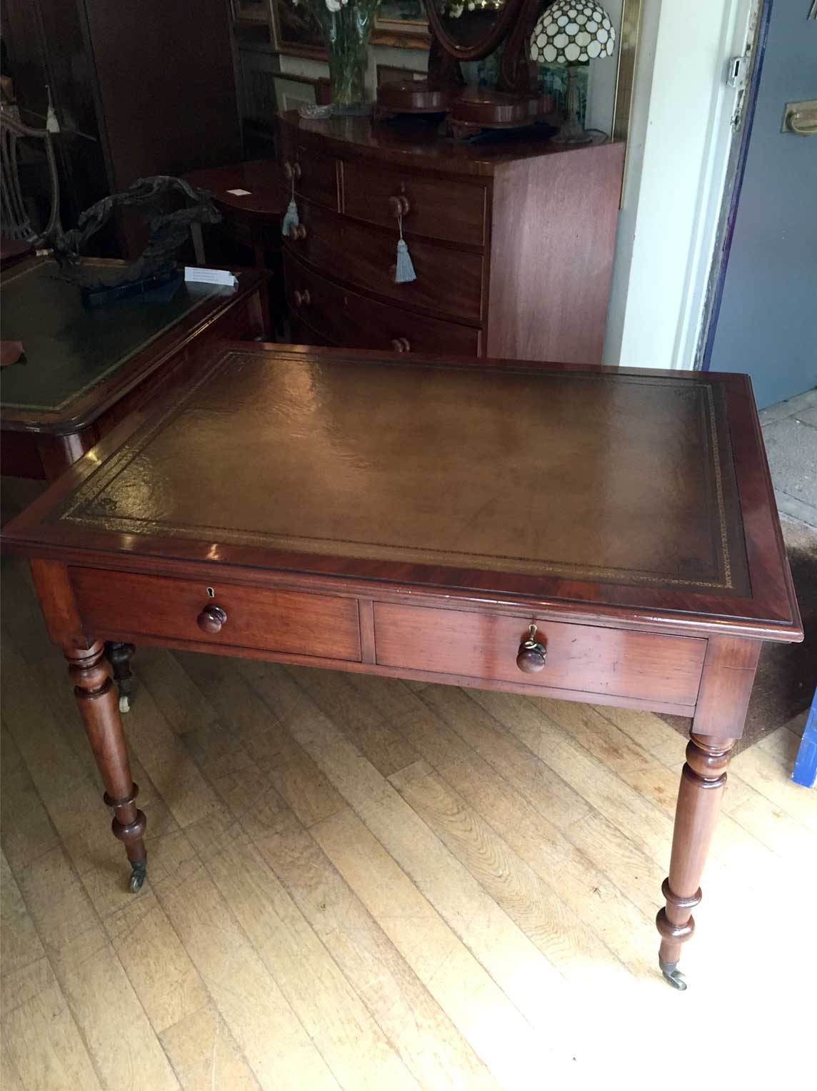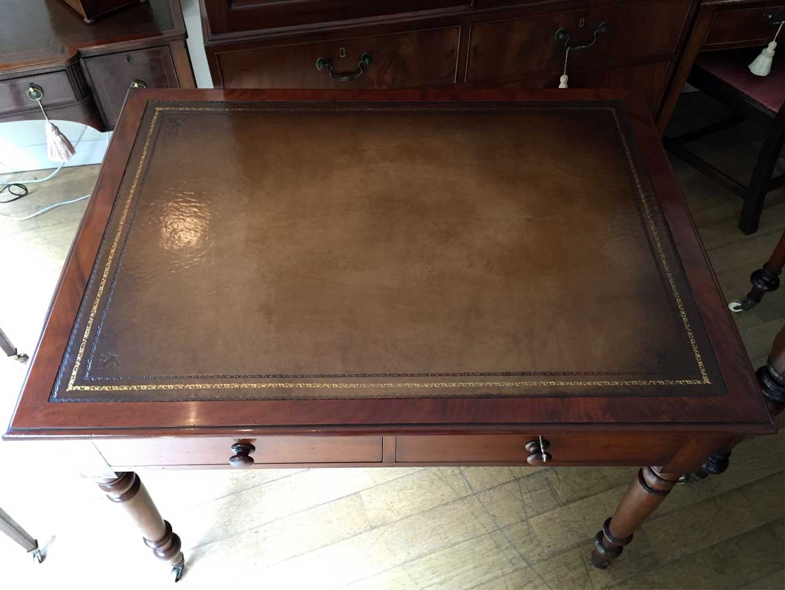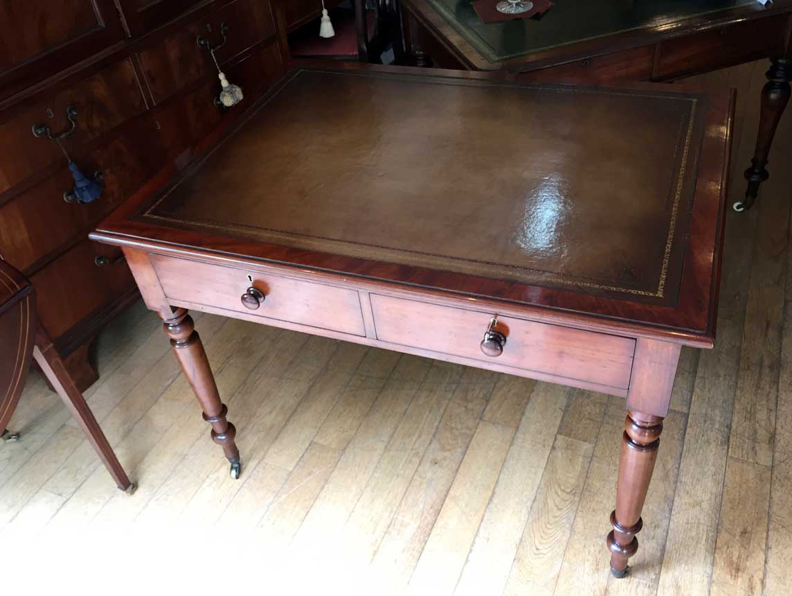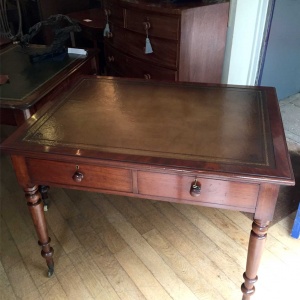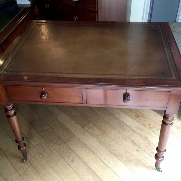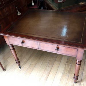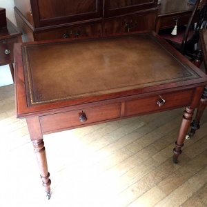 Victorian Mahogany Writing Table with Leathered top and two drawers. On turned legs with castors.