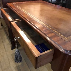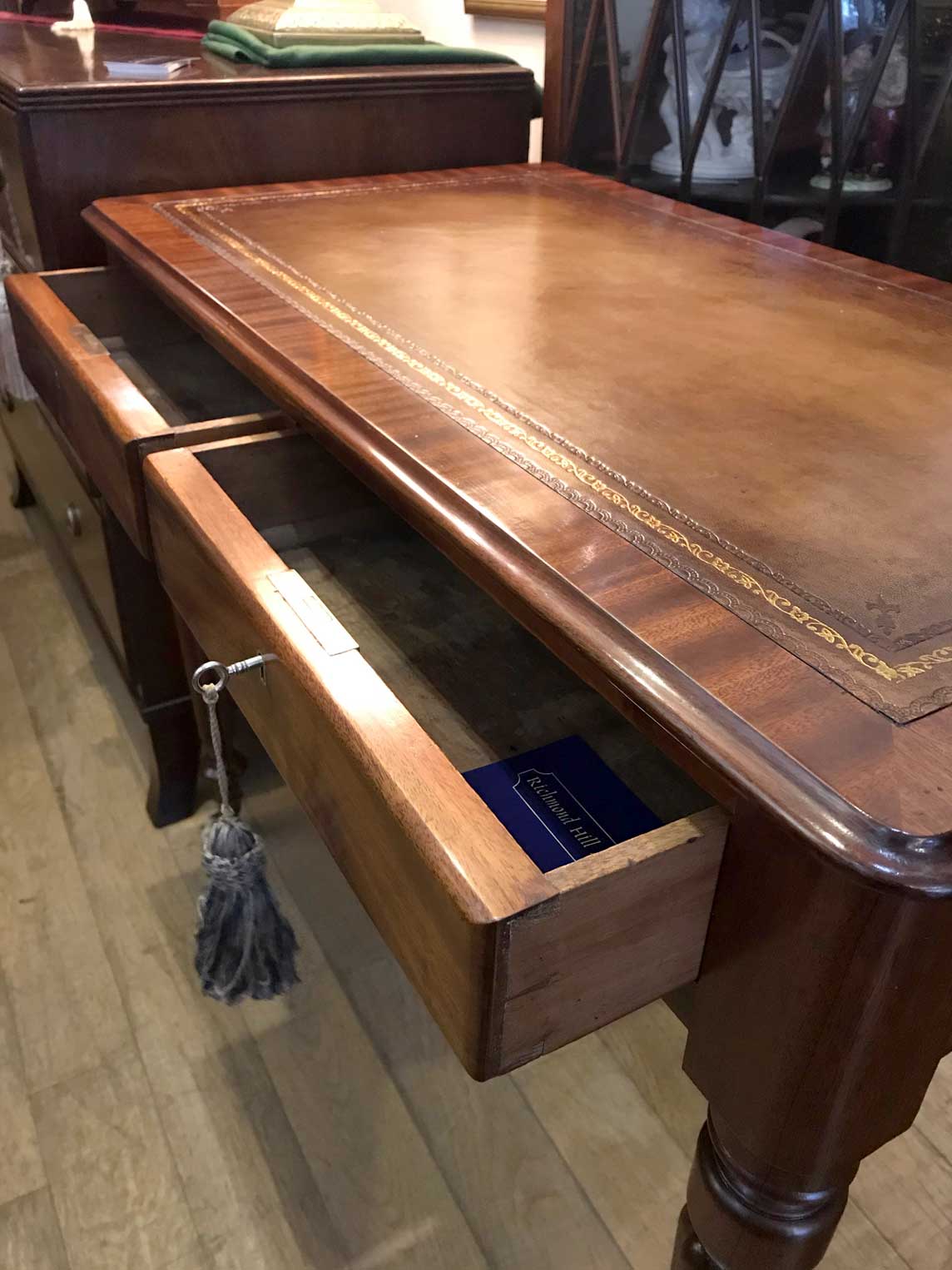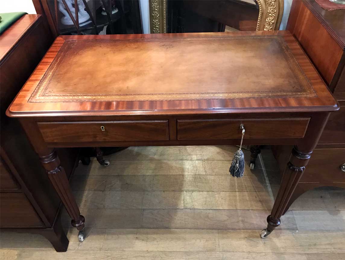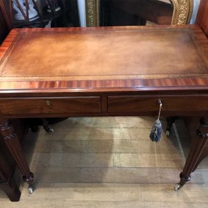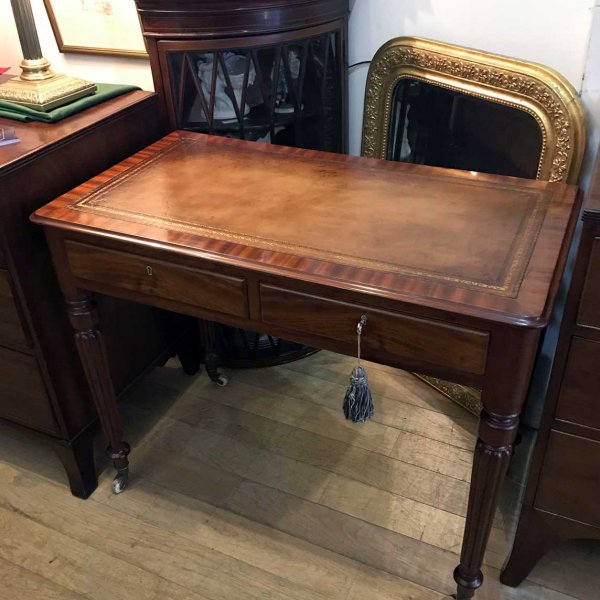 19th Century Mahogany Writing Table with two drawers. On reeded legs and original castors to base. With working key