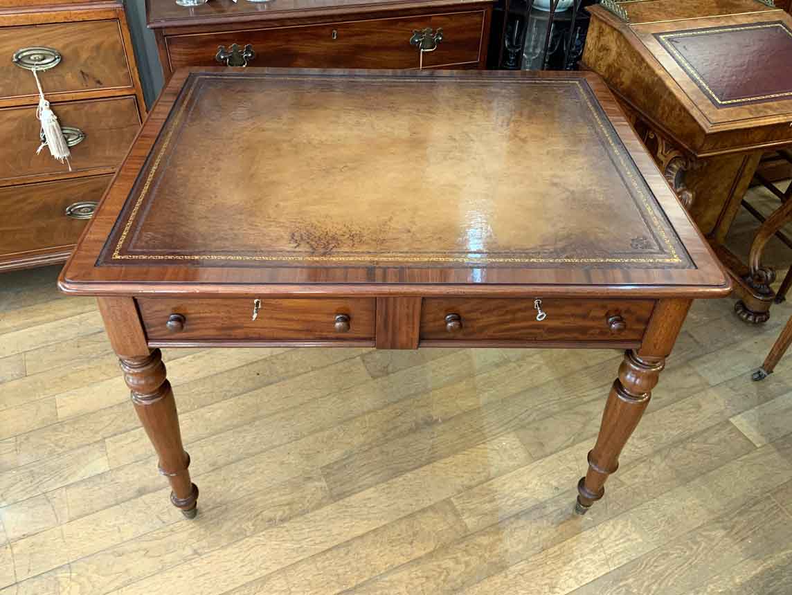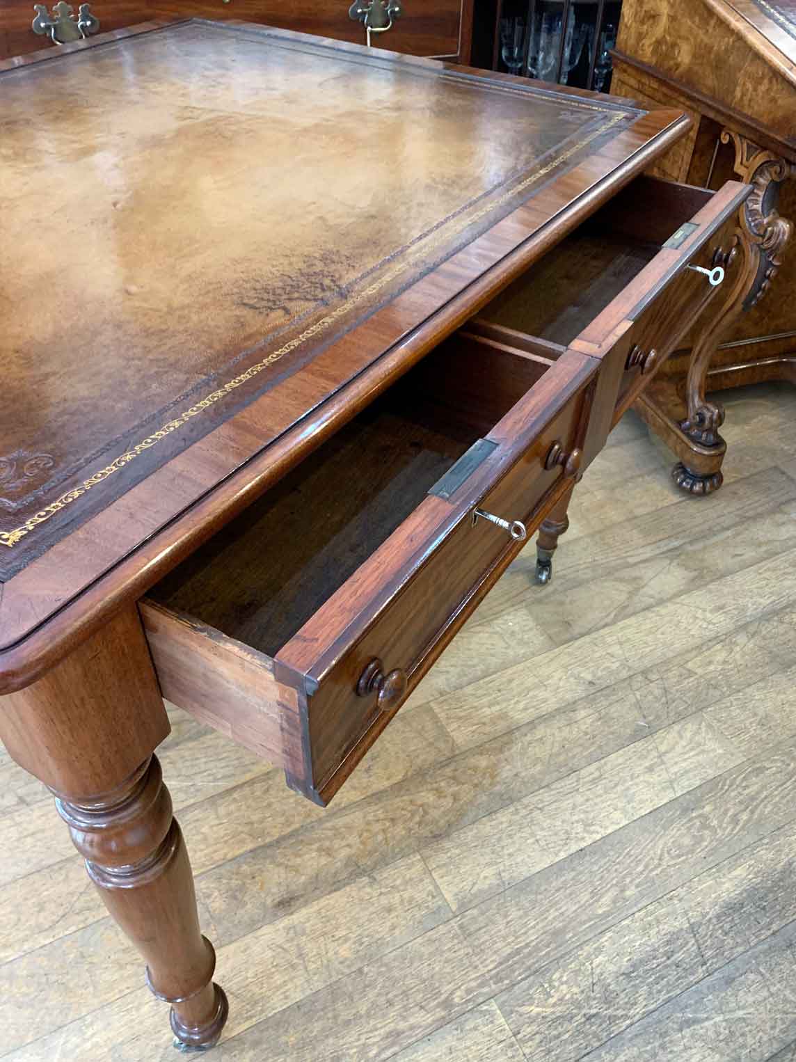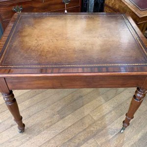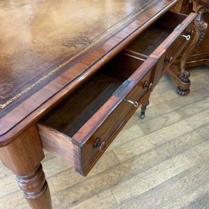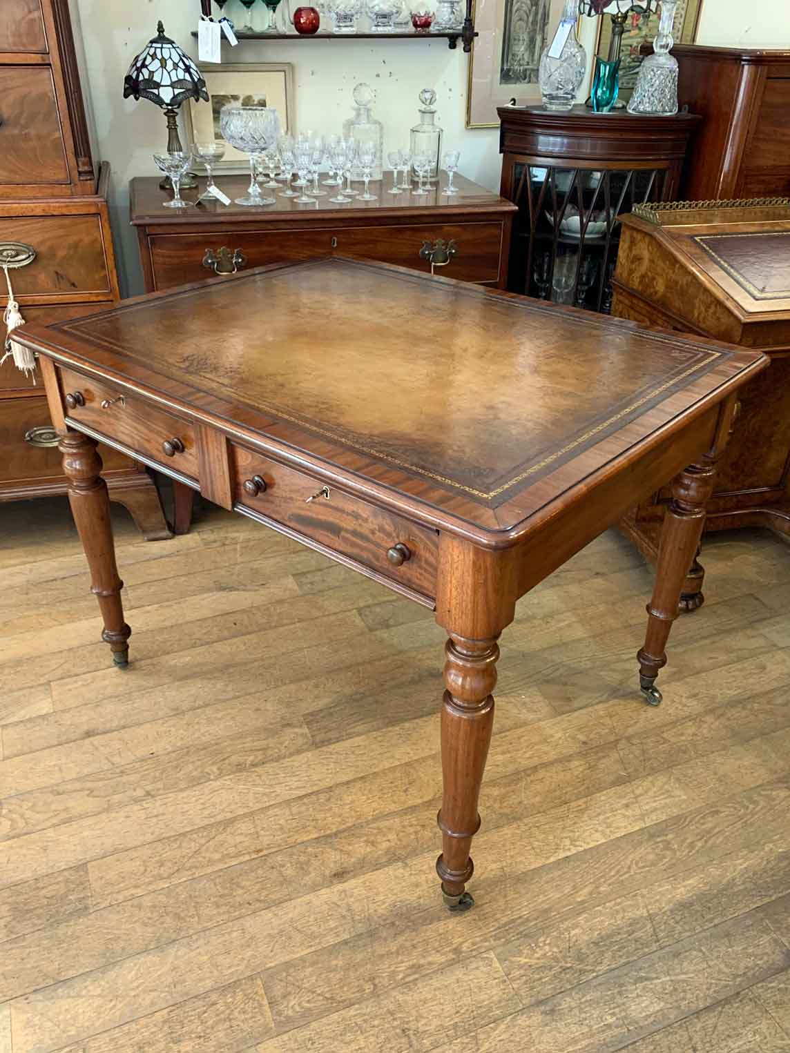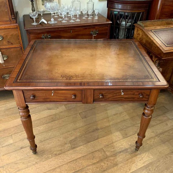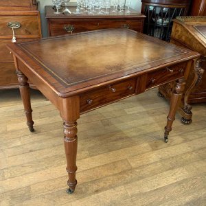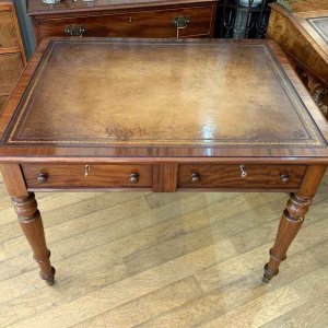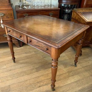 A high quality 19th Century / William IV Mahogany Writing Table with round corners and two drawers with working keys. On round turned legs and brass original castors to base.