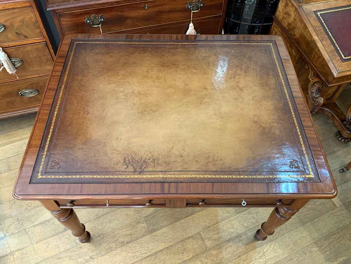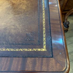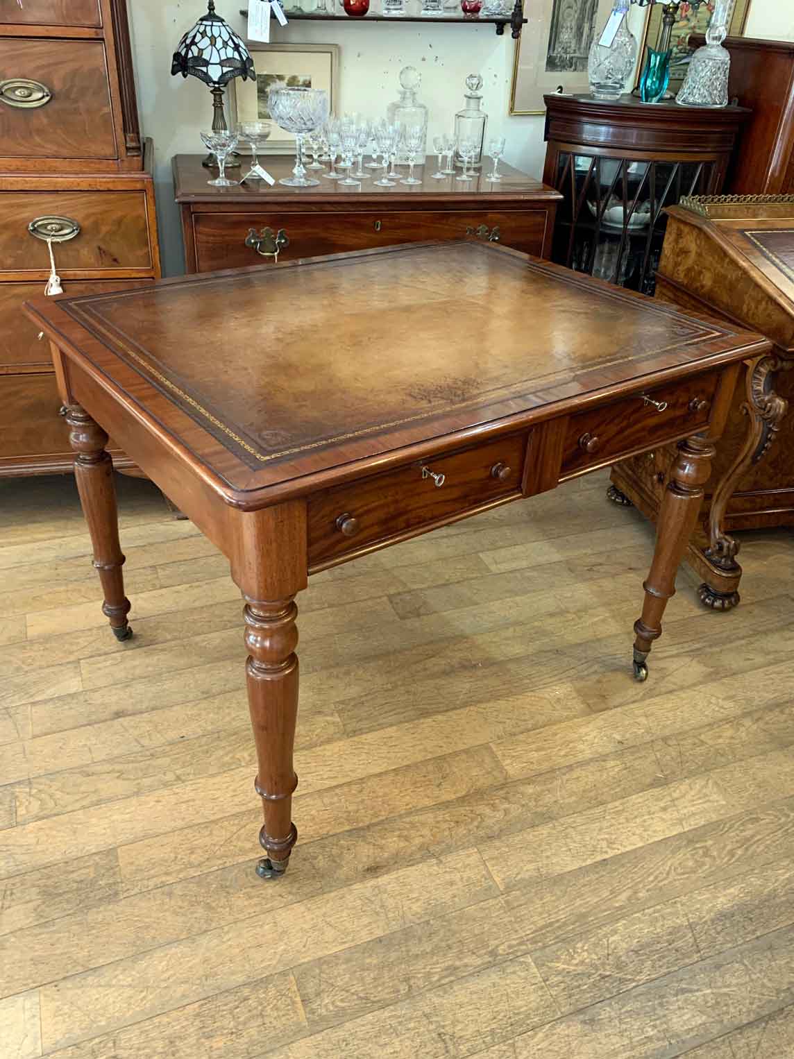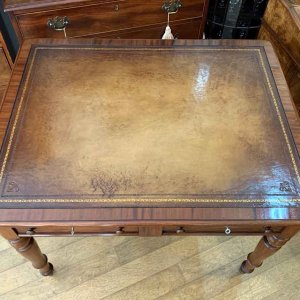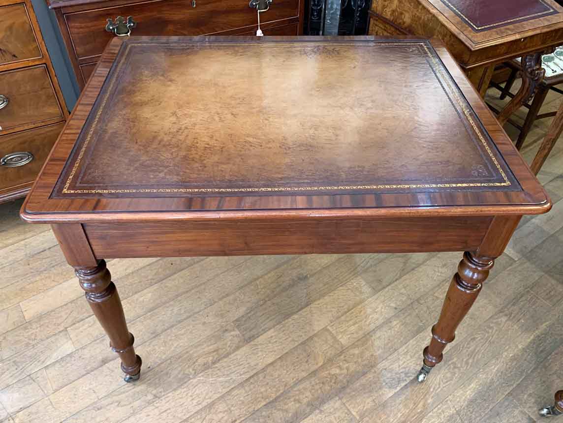 A high quality 19th Century / William IV Mahogany Writing Table with round corners and two drawers with working keys. On round turned legs and brass original castors to base.