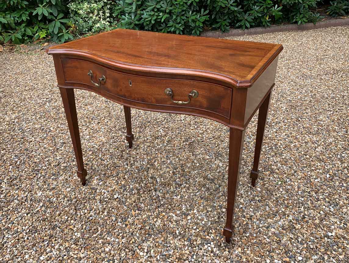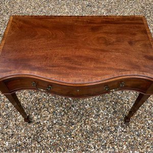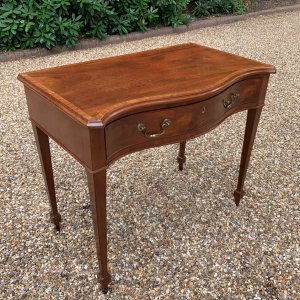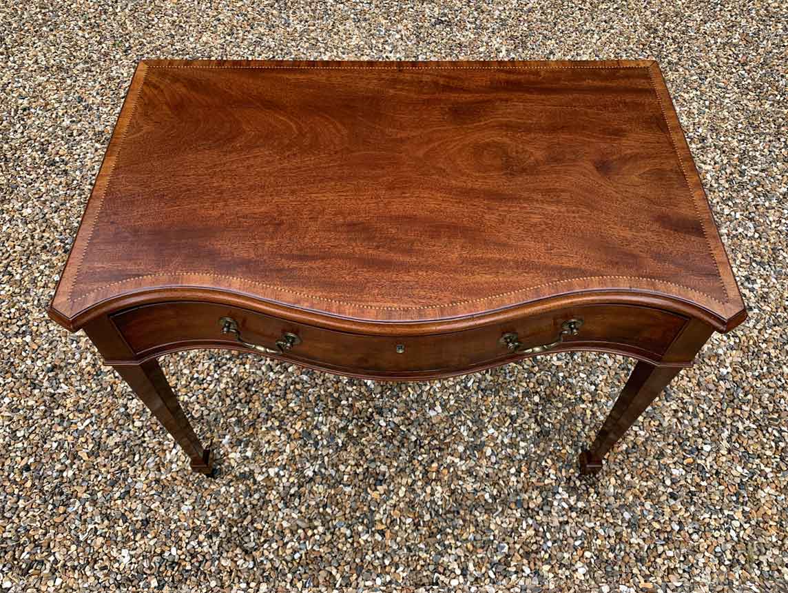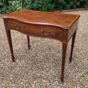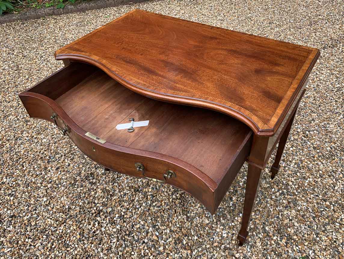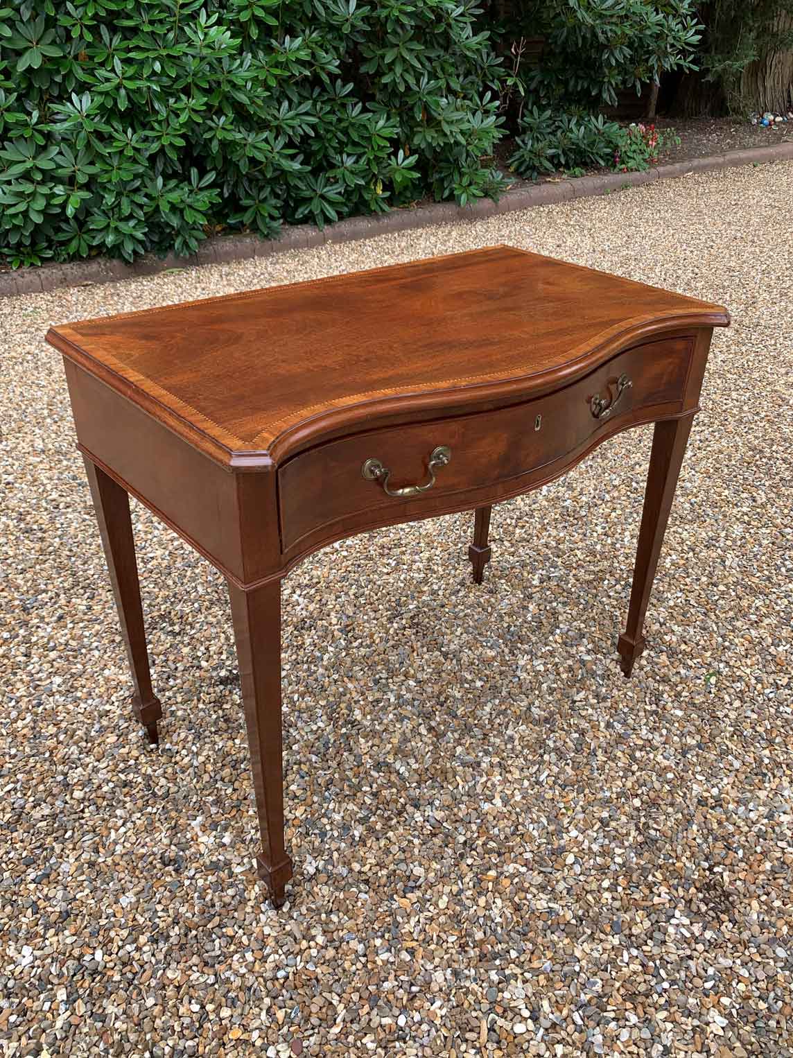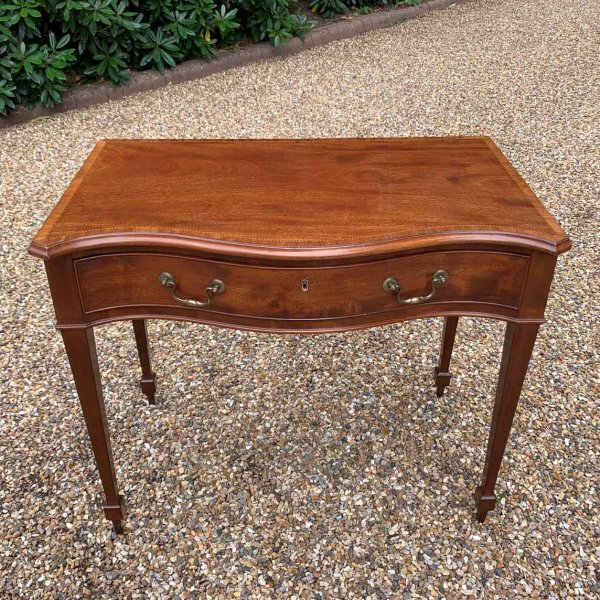 George III Inlaid Mahogany Serpentine Writing Table with single drawer, brass swan neck handles, working key on tapering square supports.