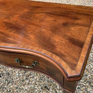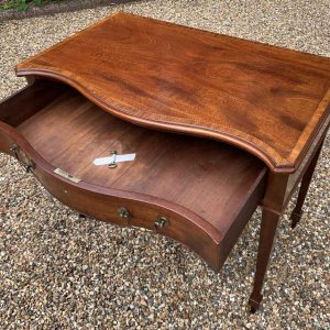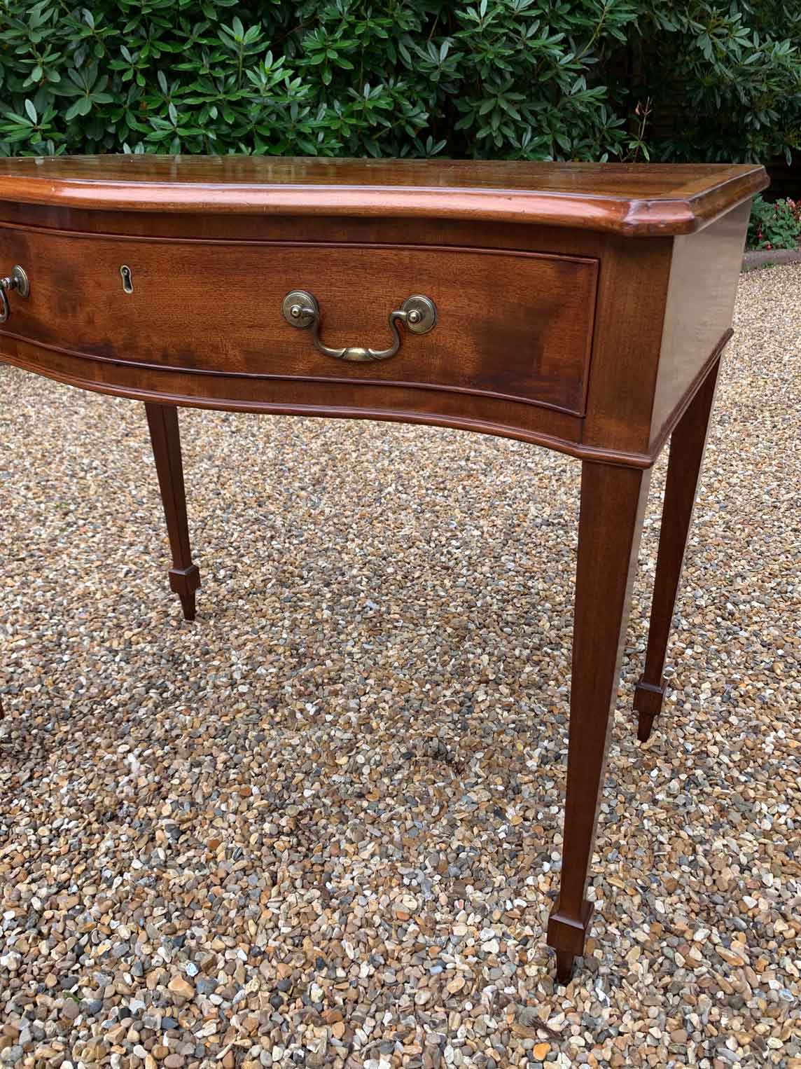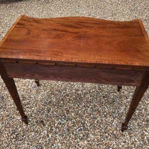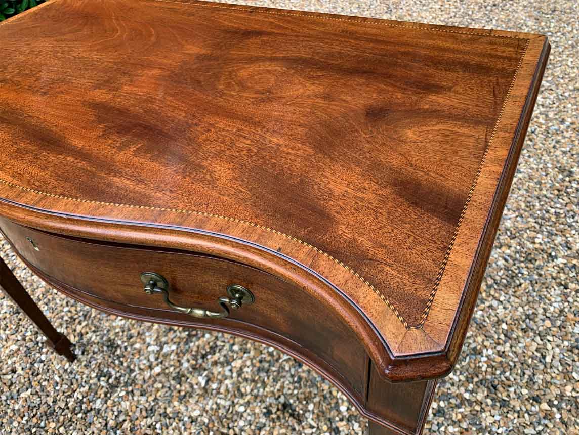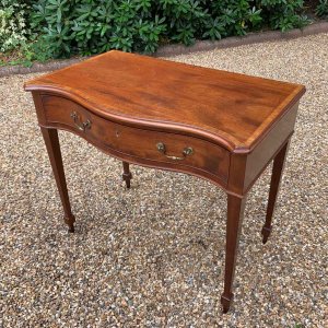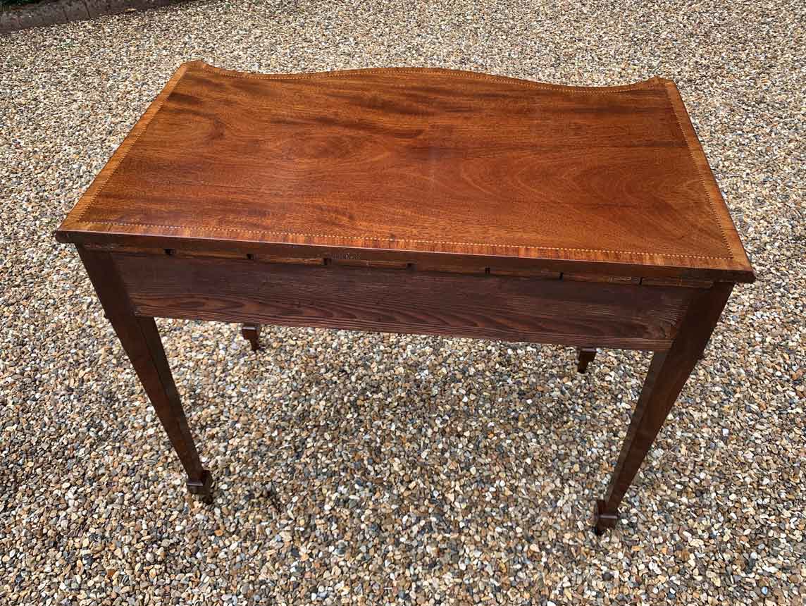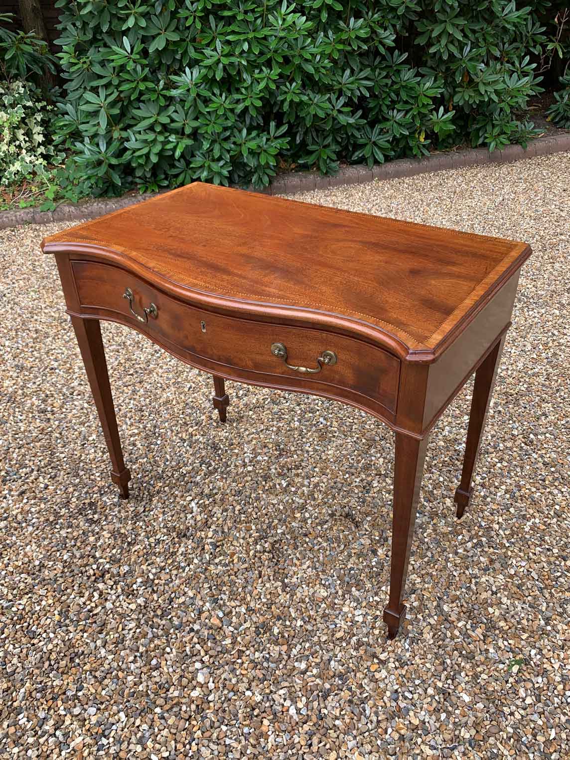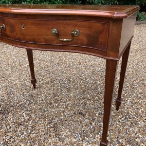 George III Inlaid Mahogany Serpentine Writing Table with single drawer, brass swan neck handles, working key on tapering square supports.