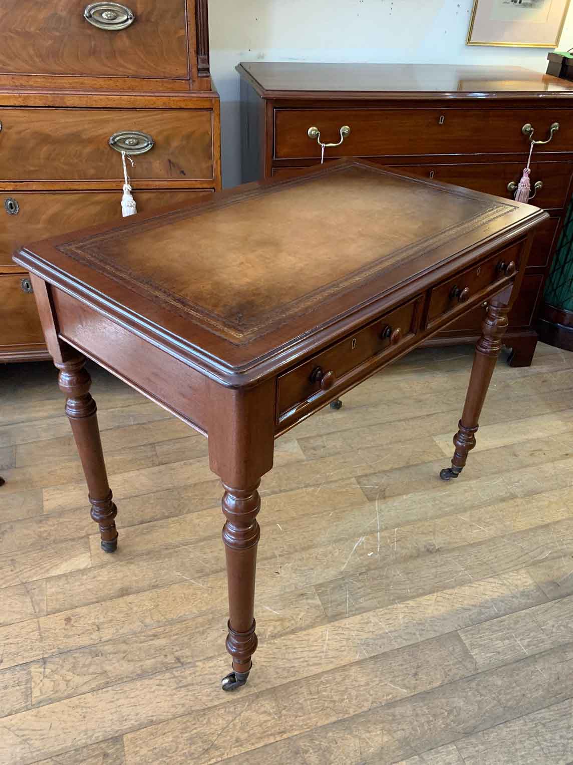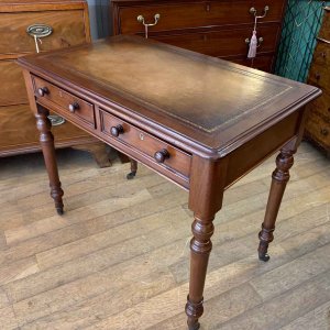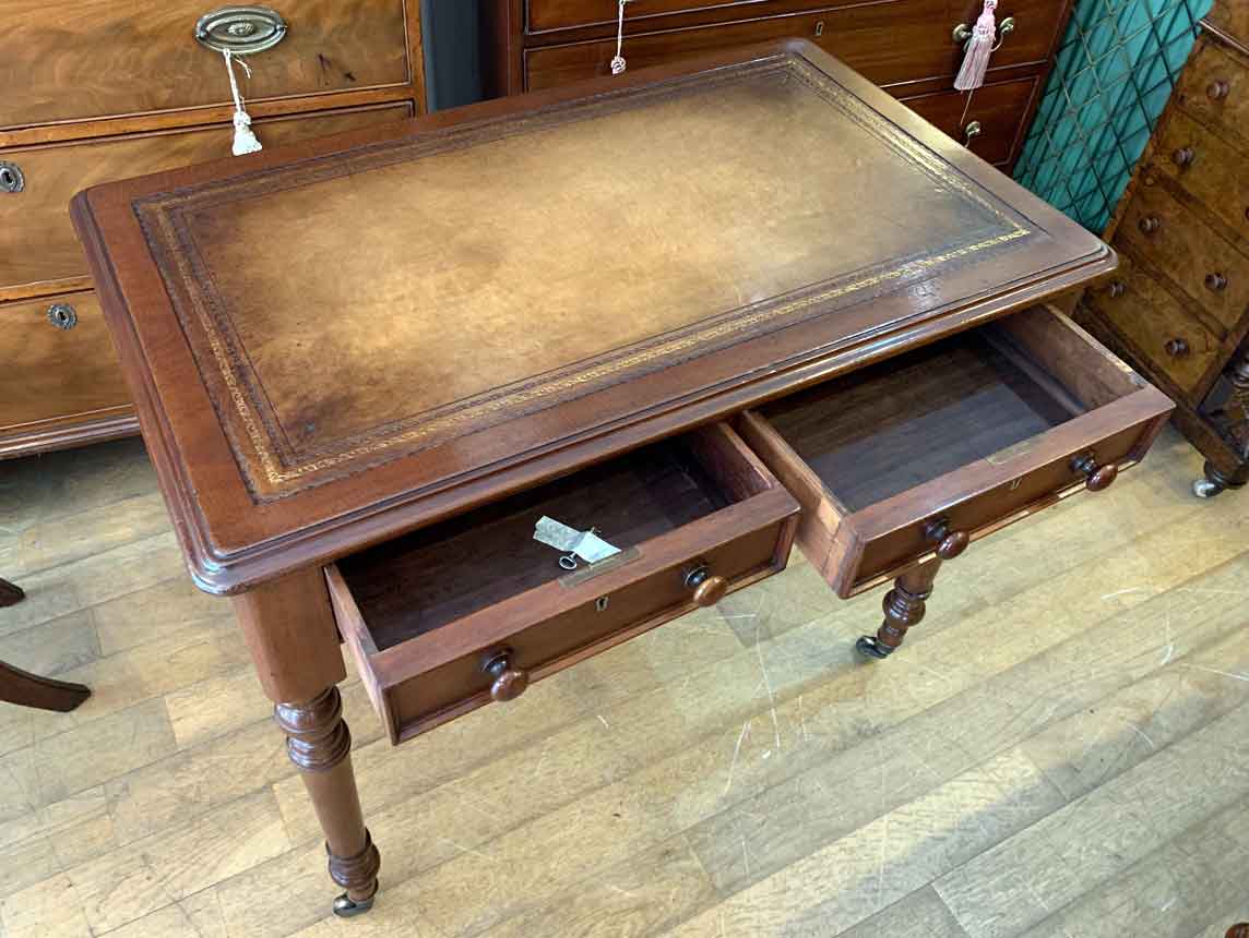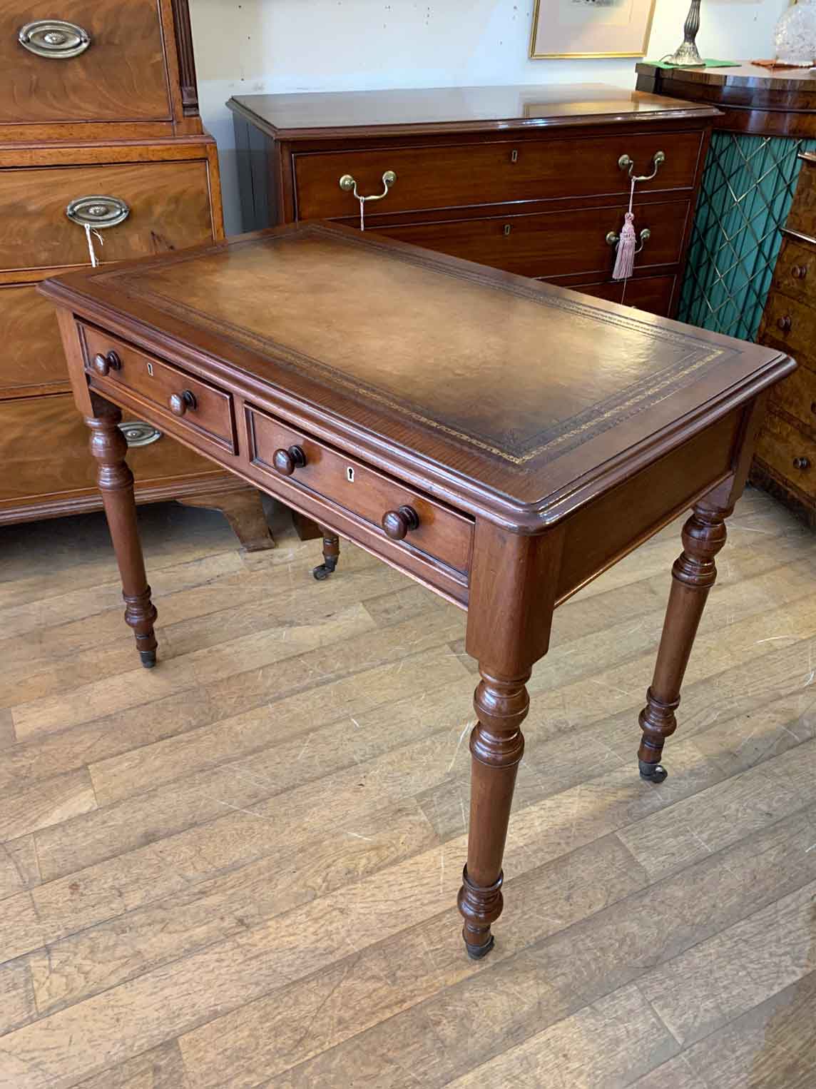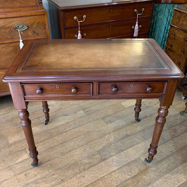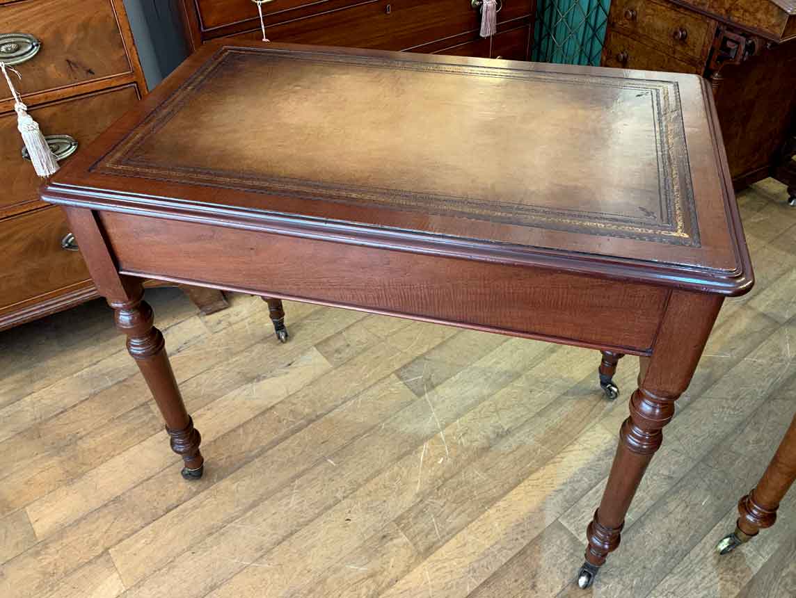 Victorian Mahogany Writing Table with cabinet maker James Shoolbred stamp est.1820 (jas shoolbred & co) and a tooled leathered writing surface, two fitted mahogany drawers with key on turned supports and castors.