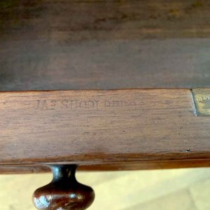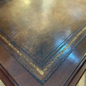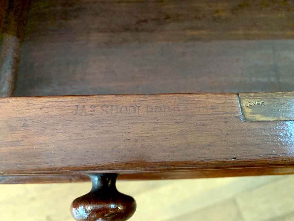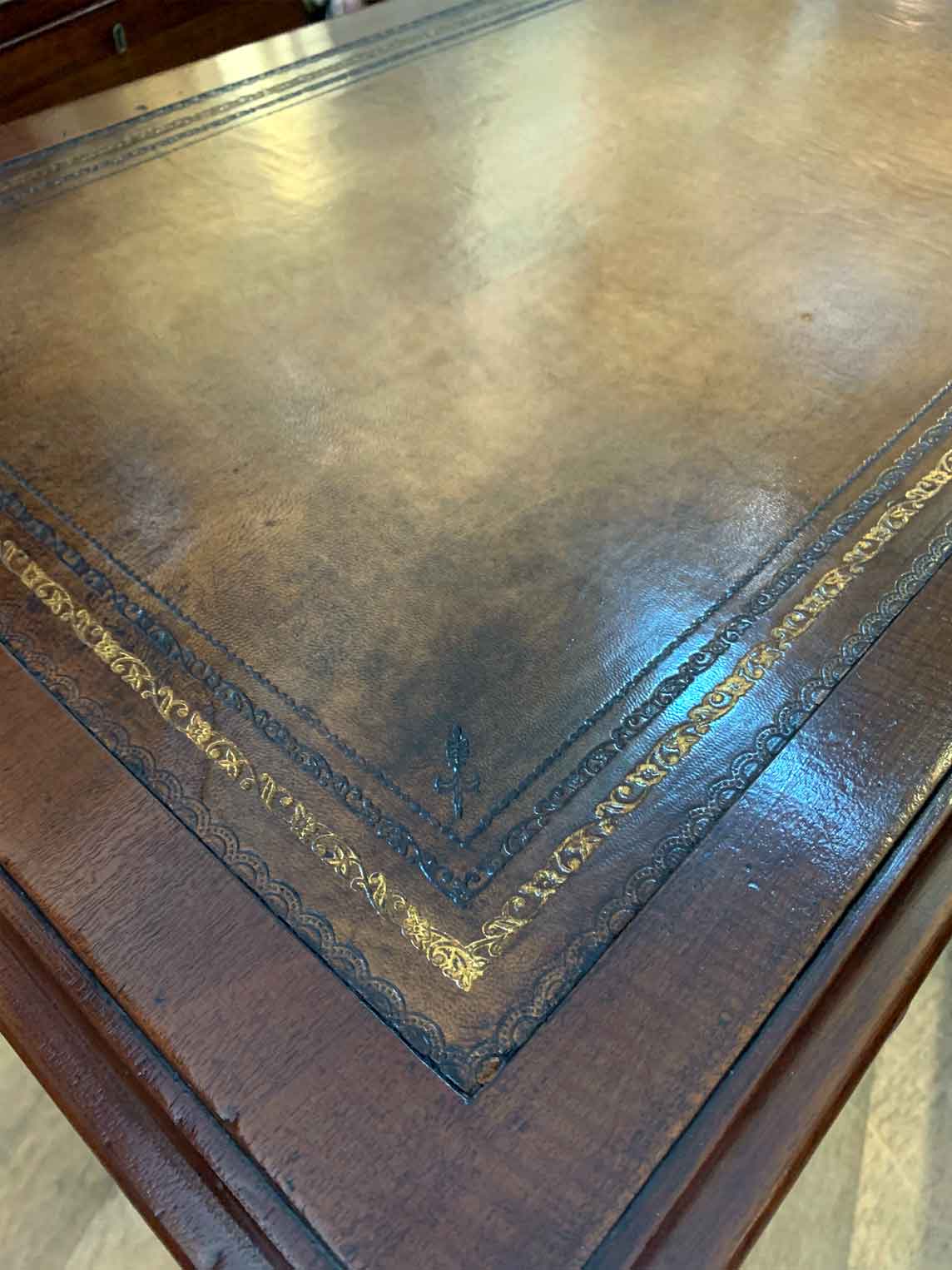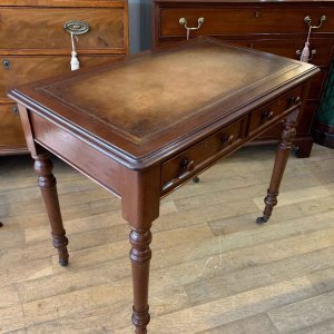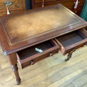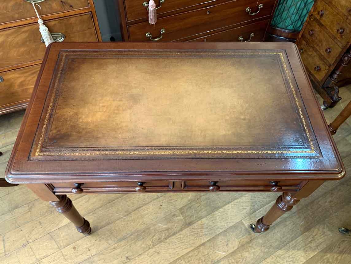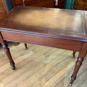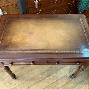 Victorian Mahogany Writing Table with cabinet maker James Shoolbred stamp est.1820 (jas shoolbred & co) and a tooled leathered writing surface, two fitted mahogany drawers with key on turned supports and castors.