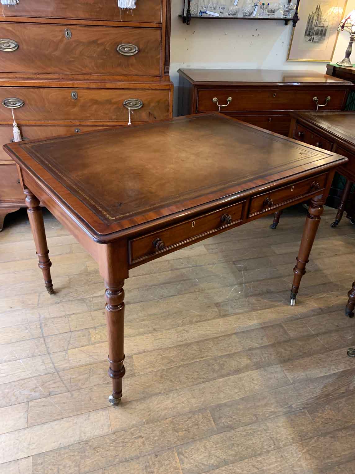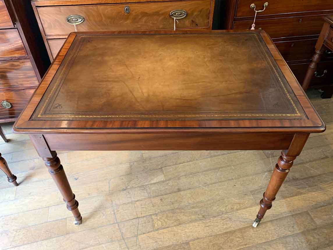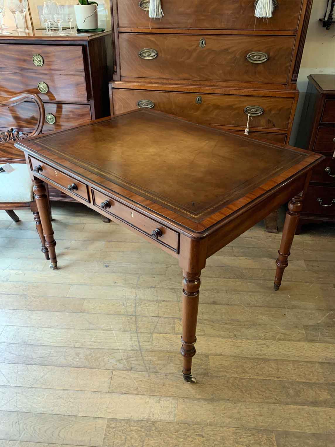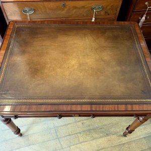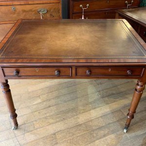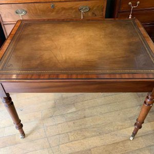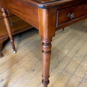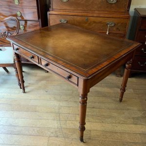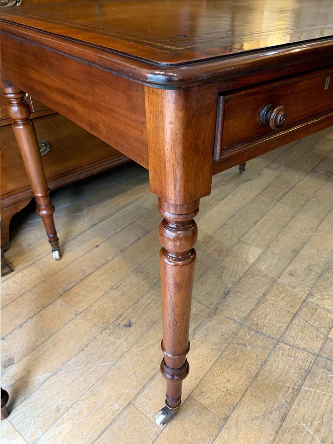 19th Century William IV Mahogany Writing Table with tooled leathered writing surface. Two mahogany drawers with key on turned supports.