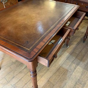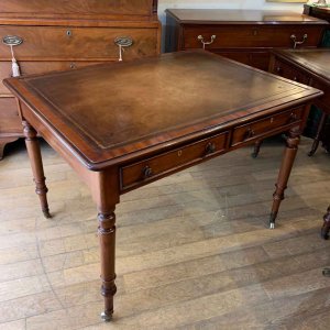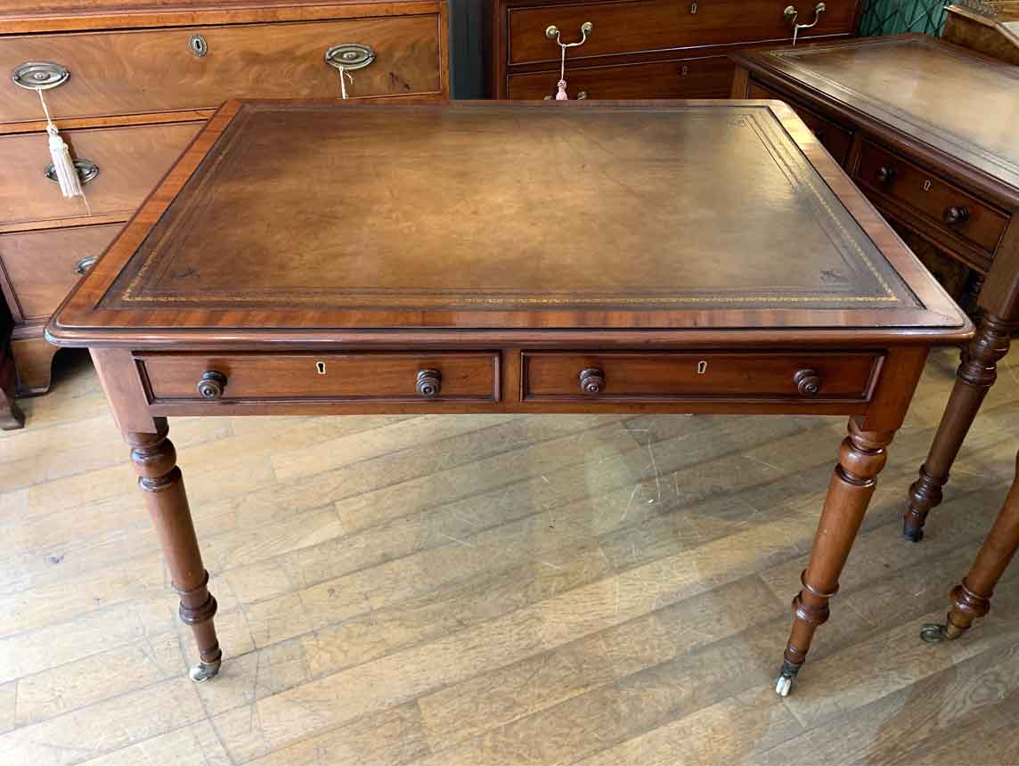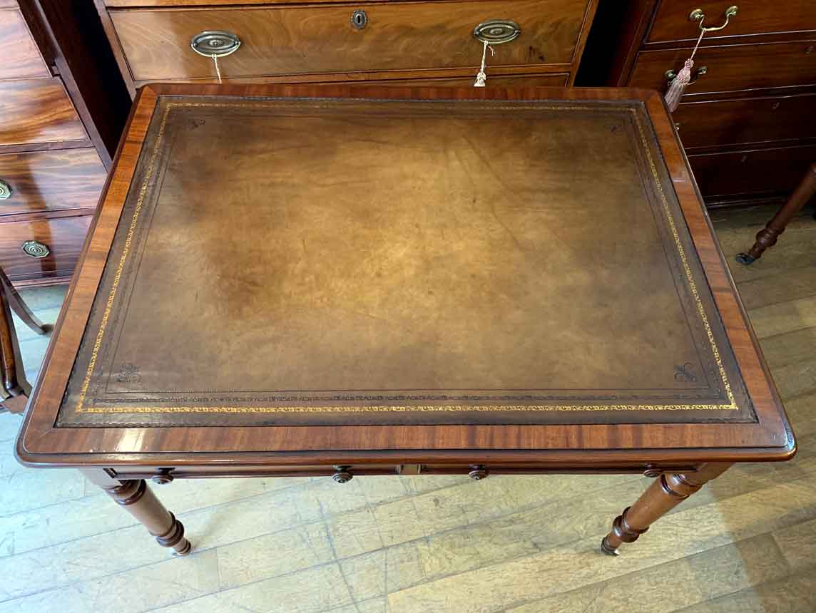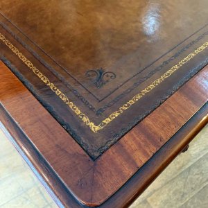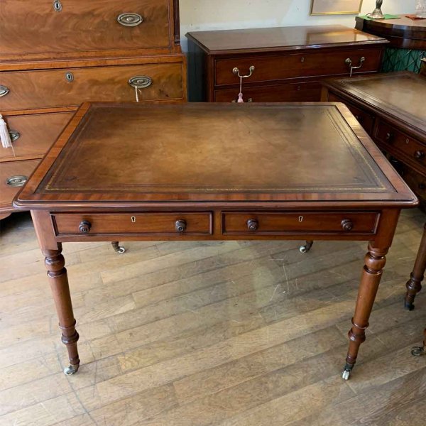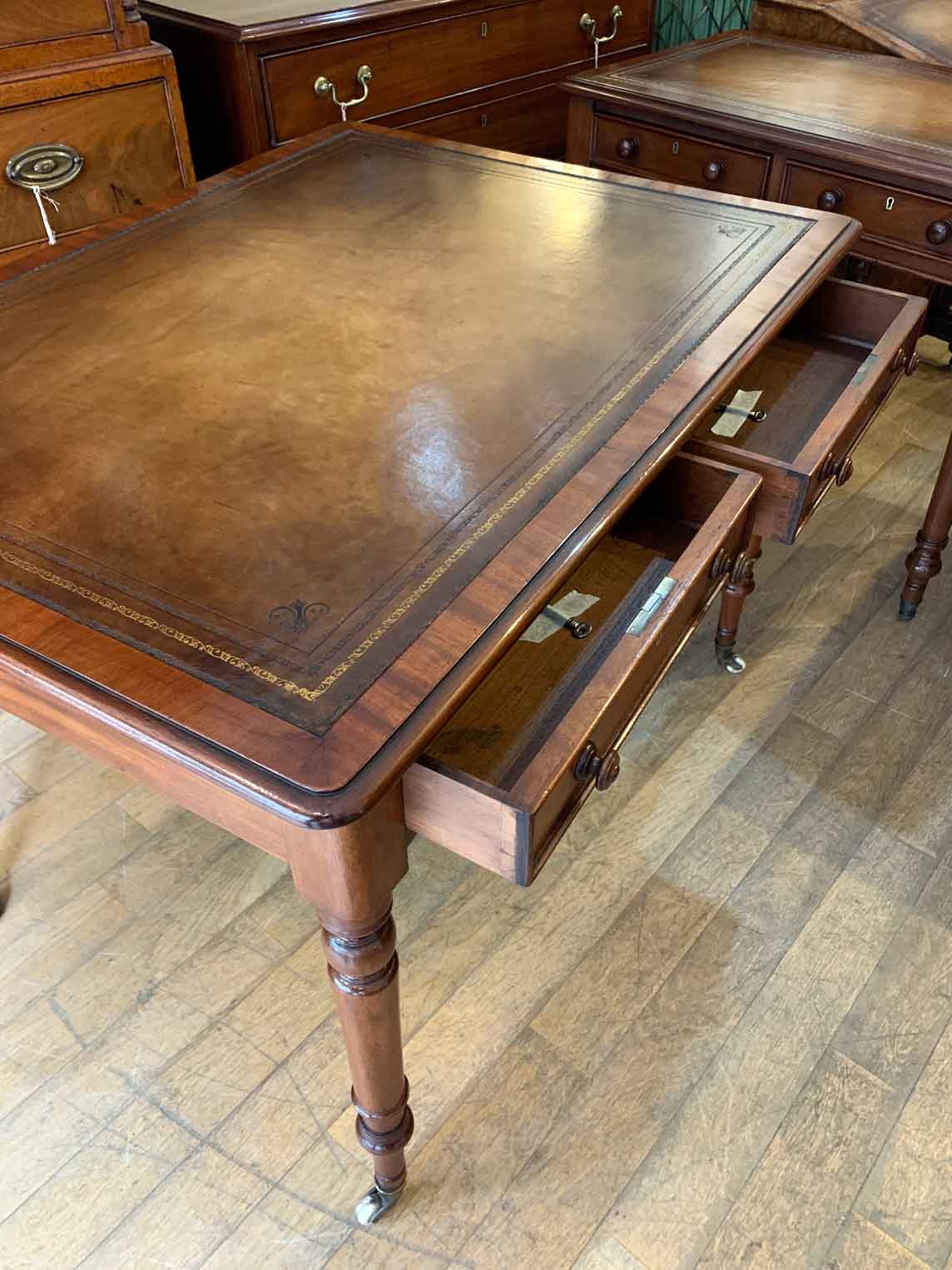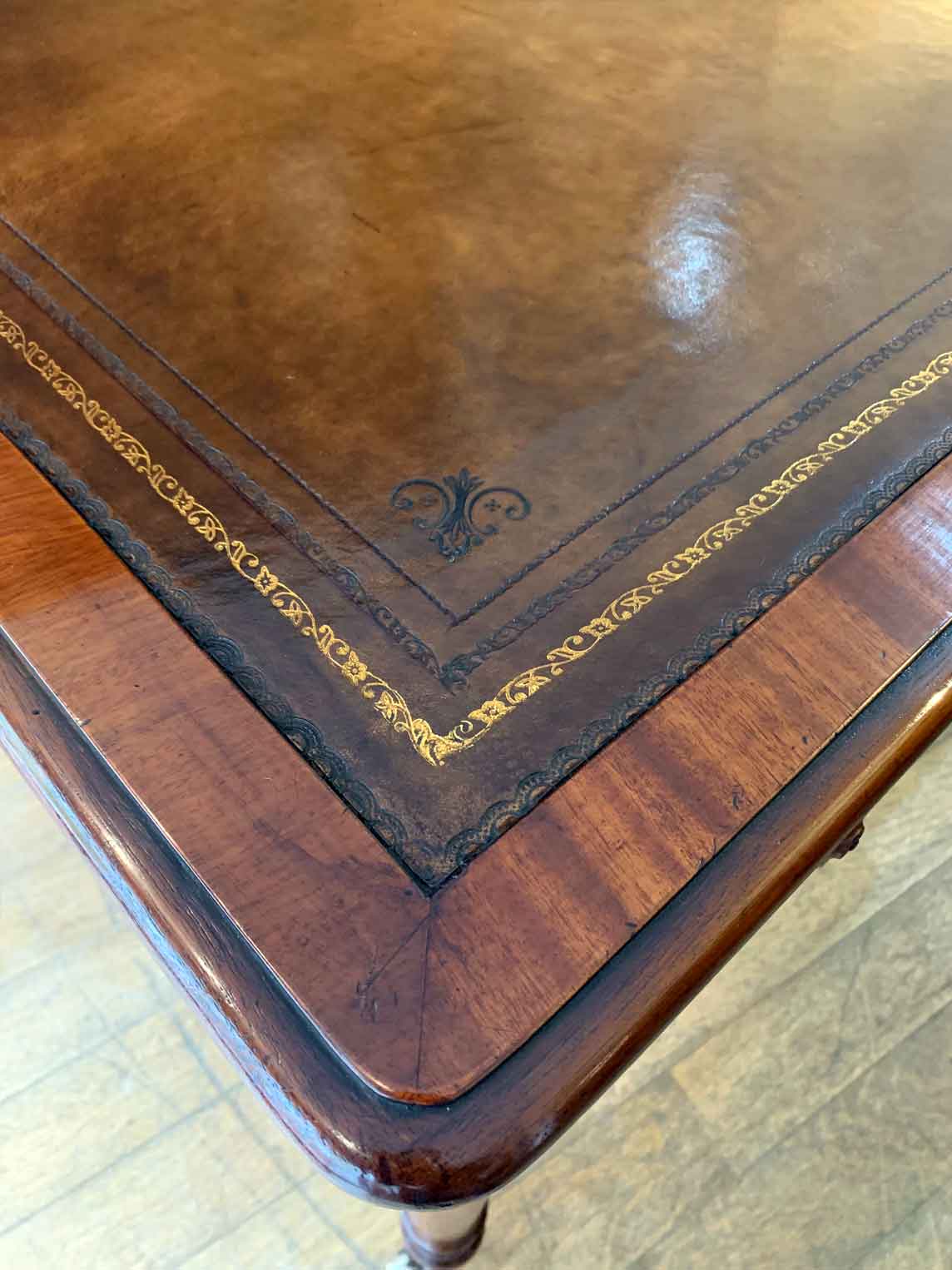 19th Century William IV Mahogany Writing Table with tooled leathered writing surface. Two mahogany drawers with key on turned supports.