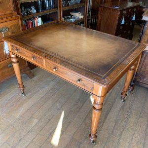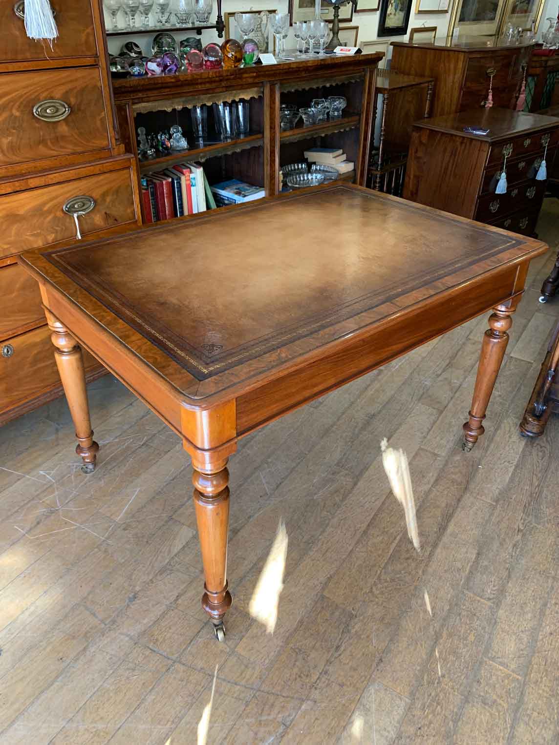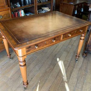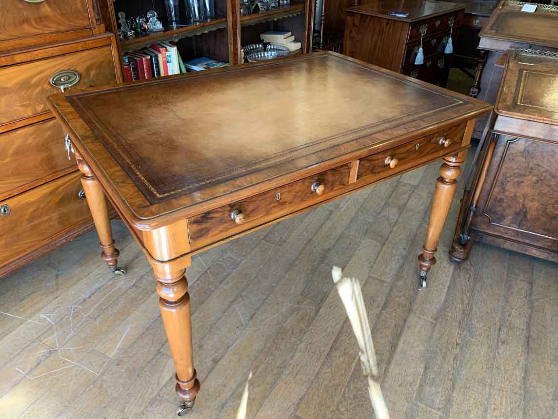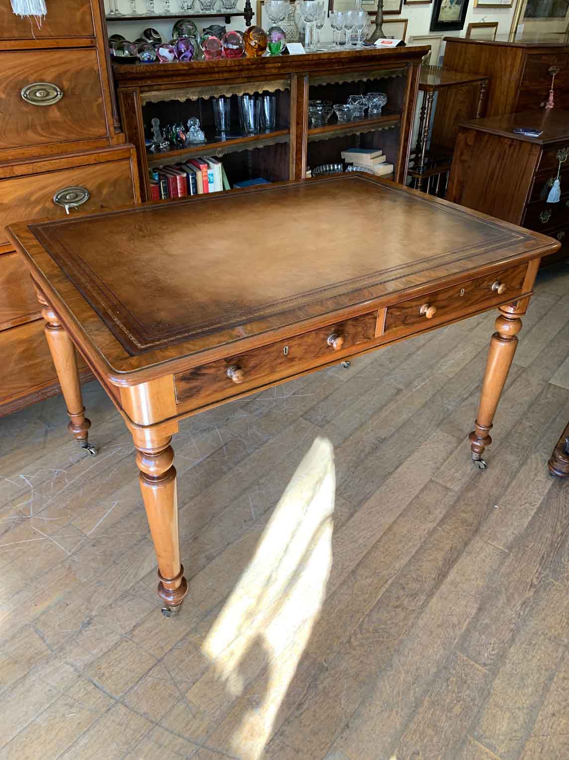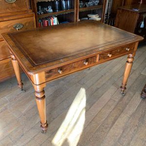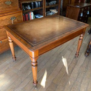 19th Century Mahogany Writing Table with two drawers / working keys, bun handles on turned legs and castors.
