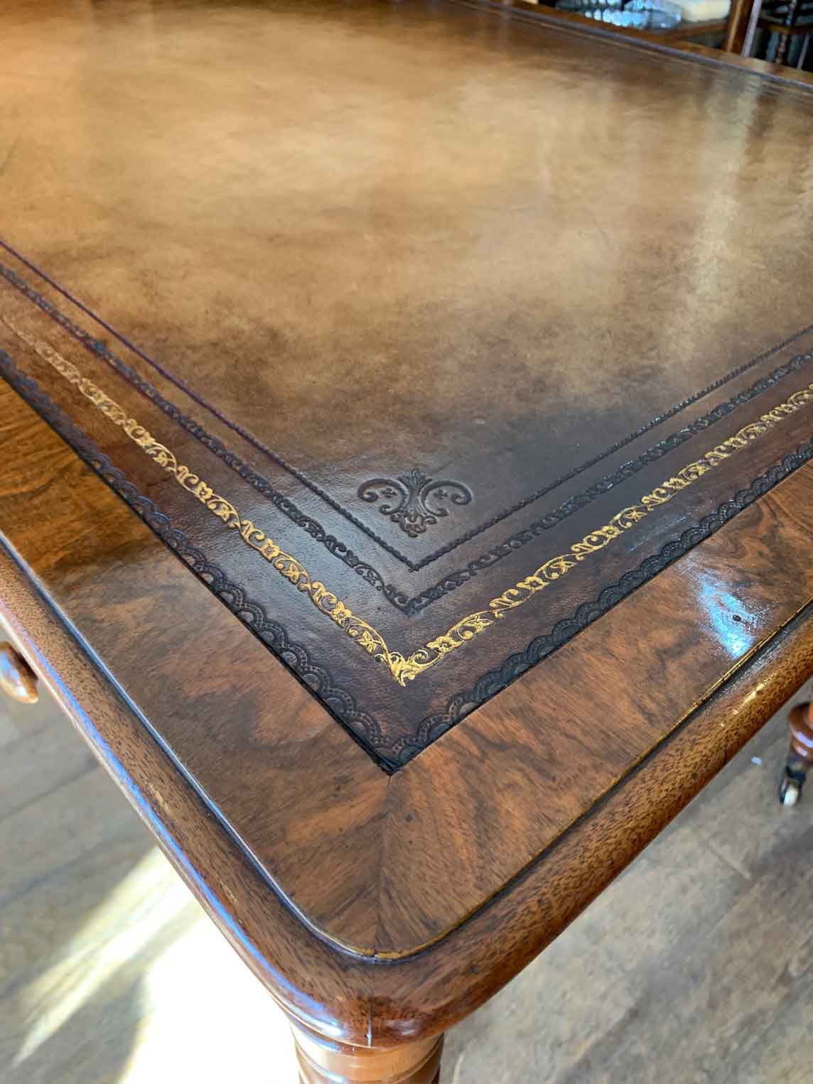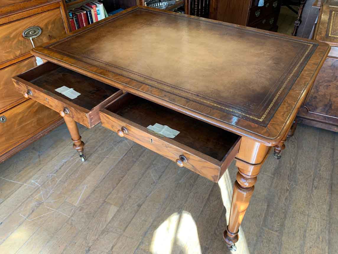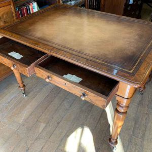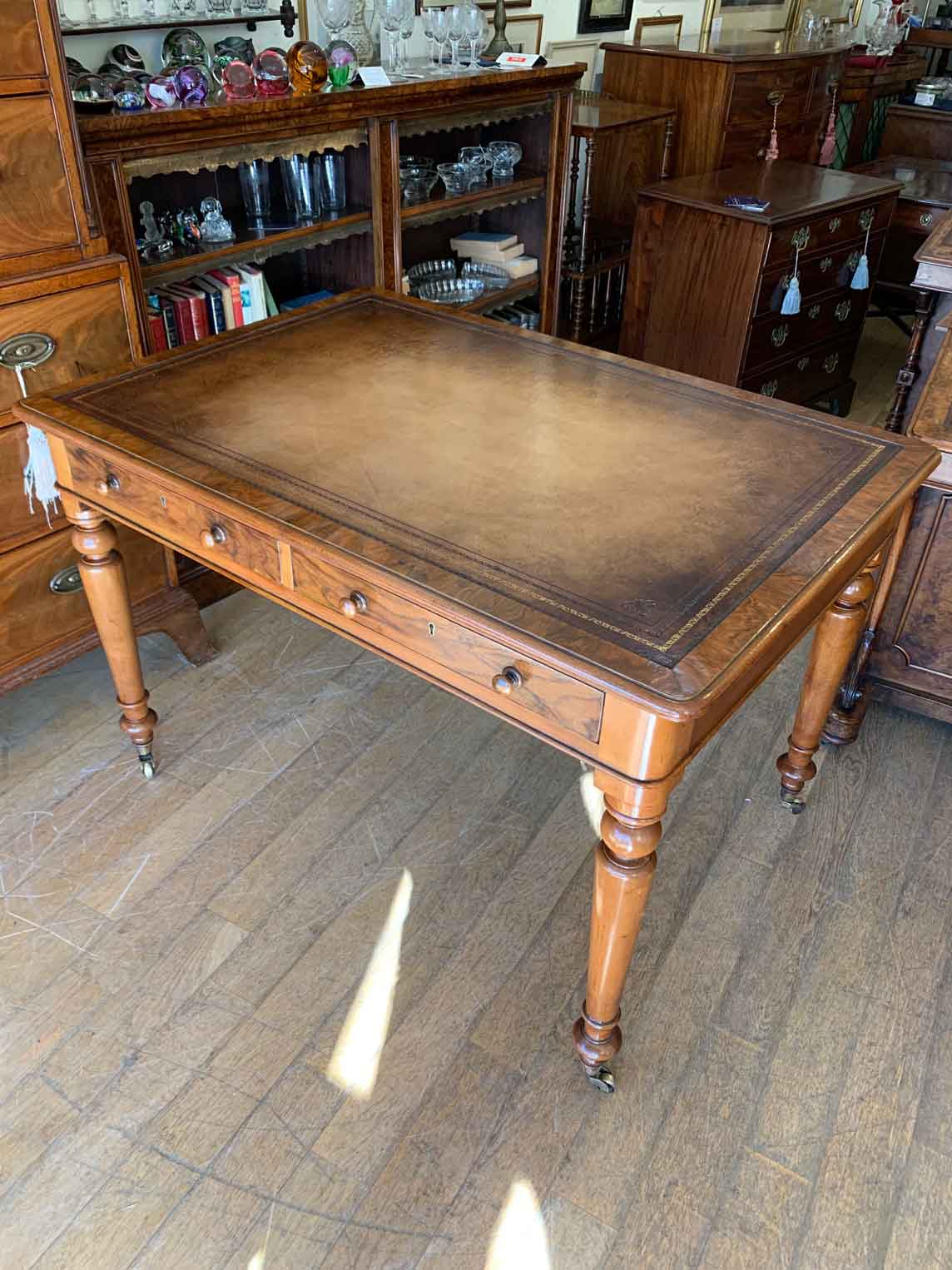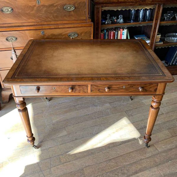19th Century Mahogany Writing Table with two drawers / working keys, bun handles on turned legs and castors.