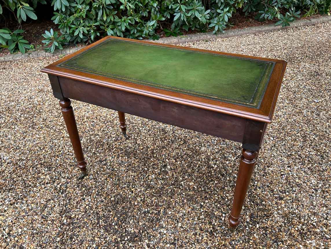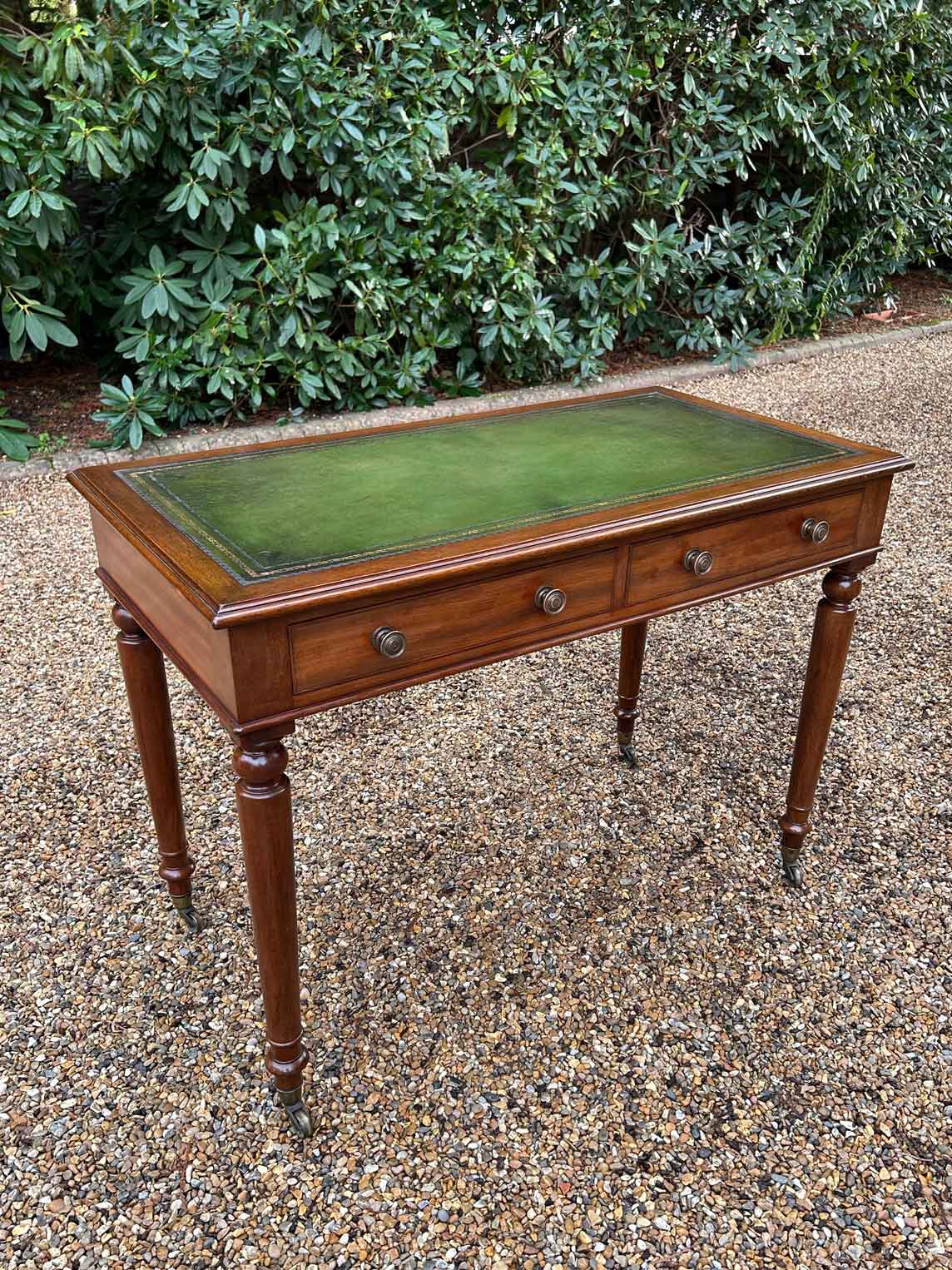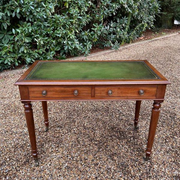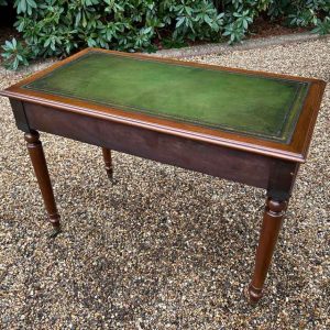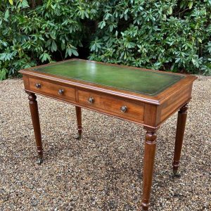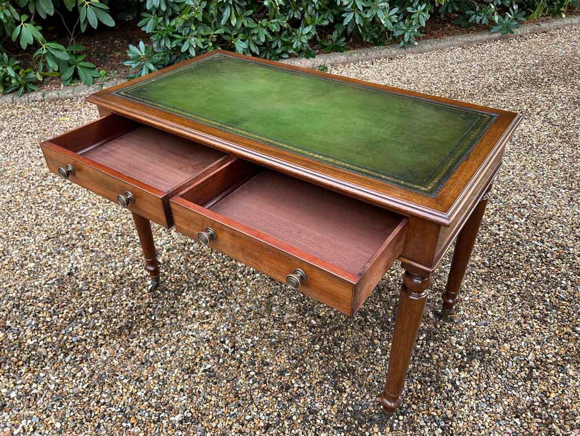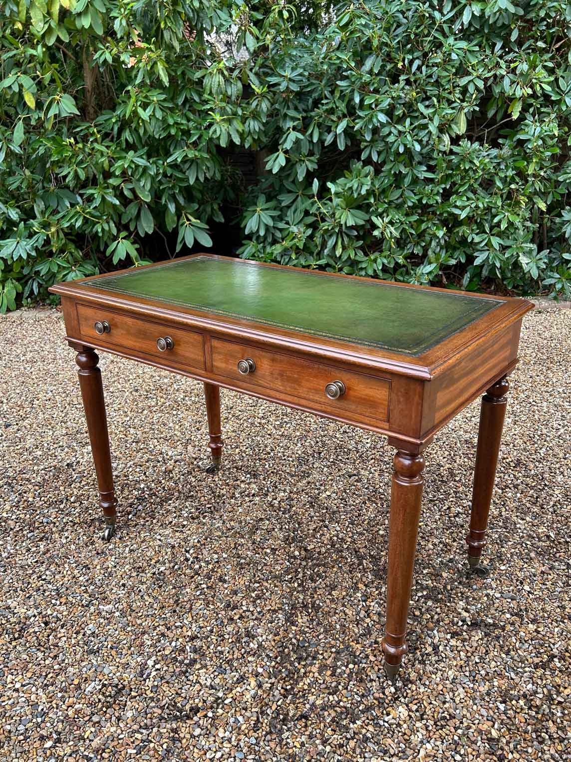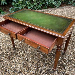 19th Century Mahogany Writing Table with green leathered writing surface, above two solid mahogany drawers and brass handles. On turned legs, with brass original castors to base.