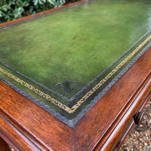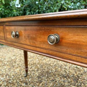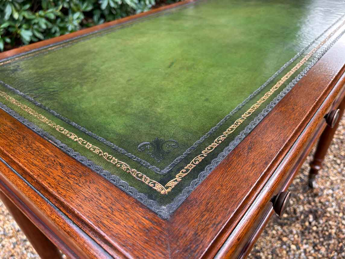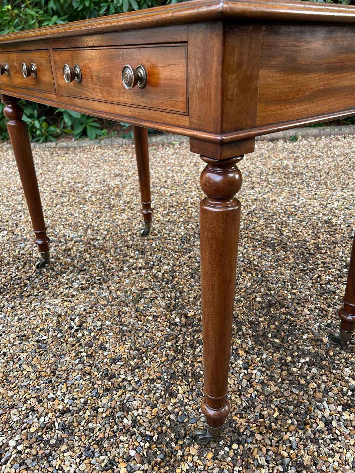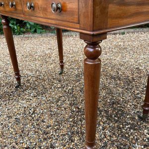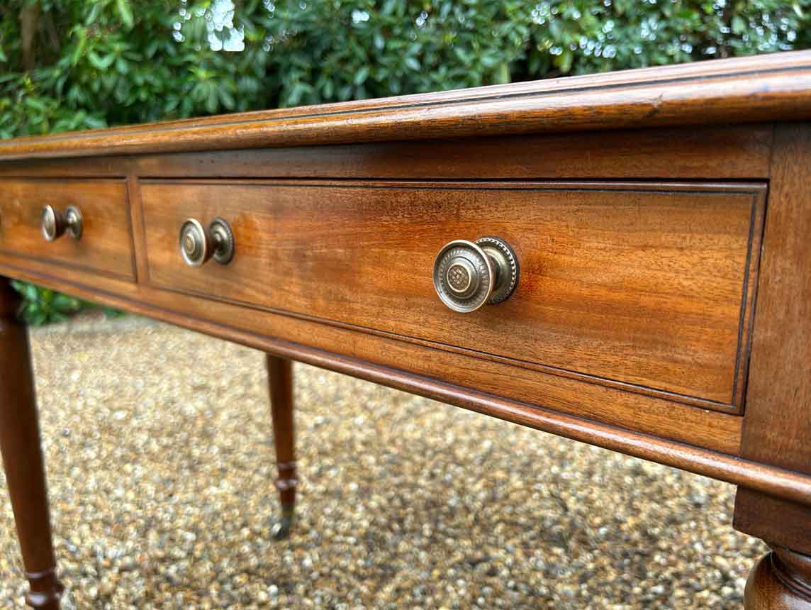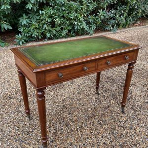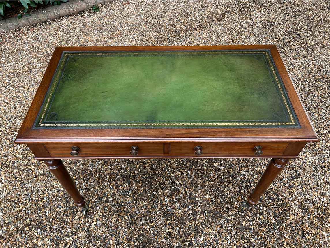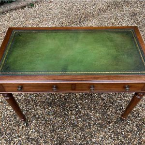 19th Century Mahogany Writing Table with green leathered writing surface, above two solid mahogany drawers and brass handles. On turned legs, with brass original castors to base.