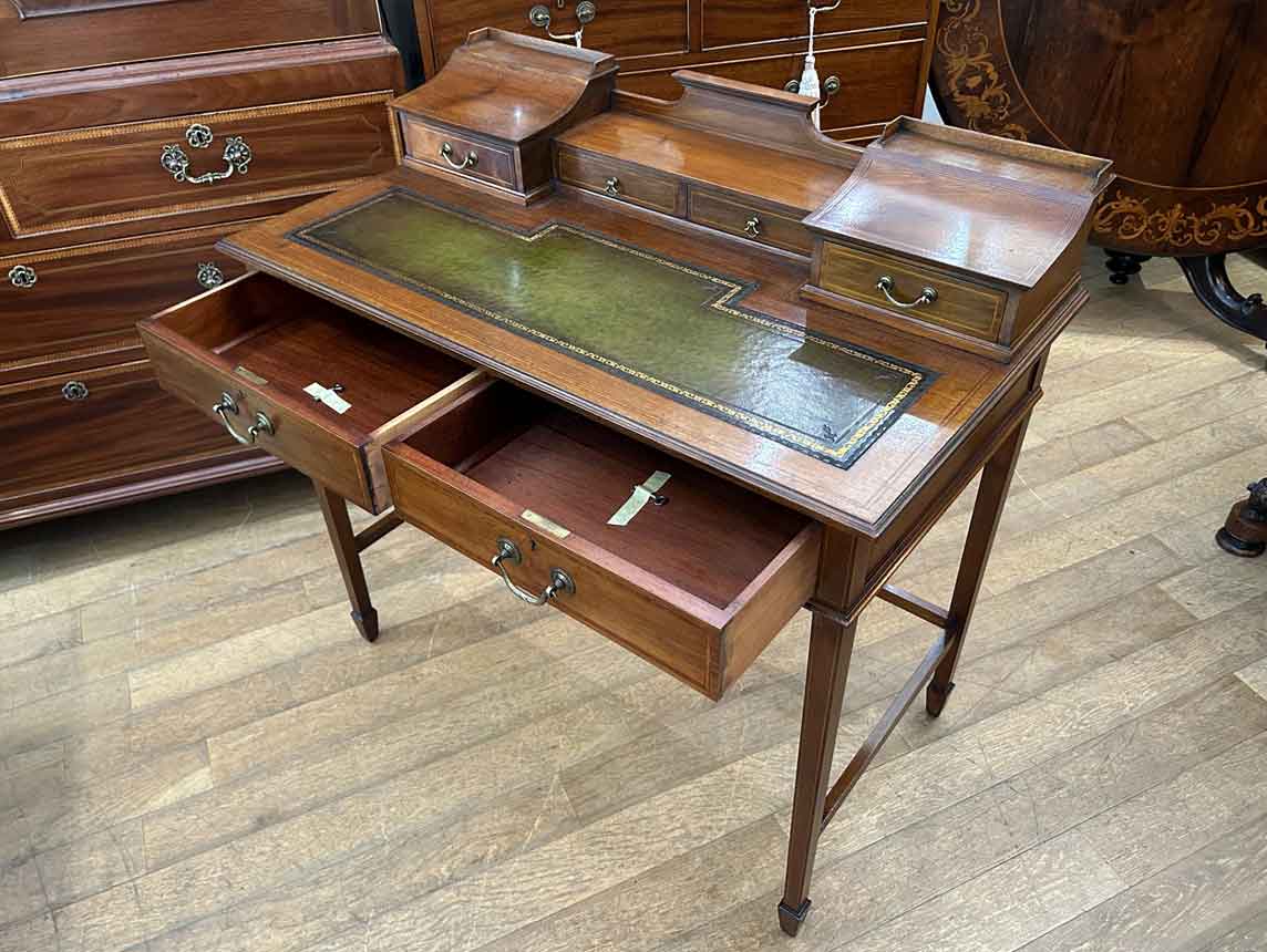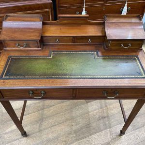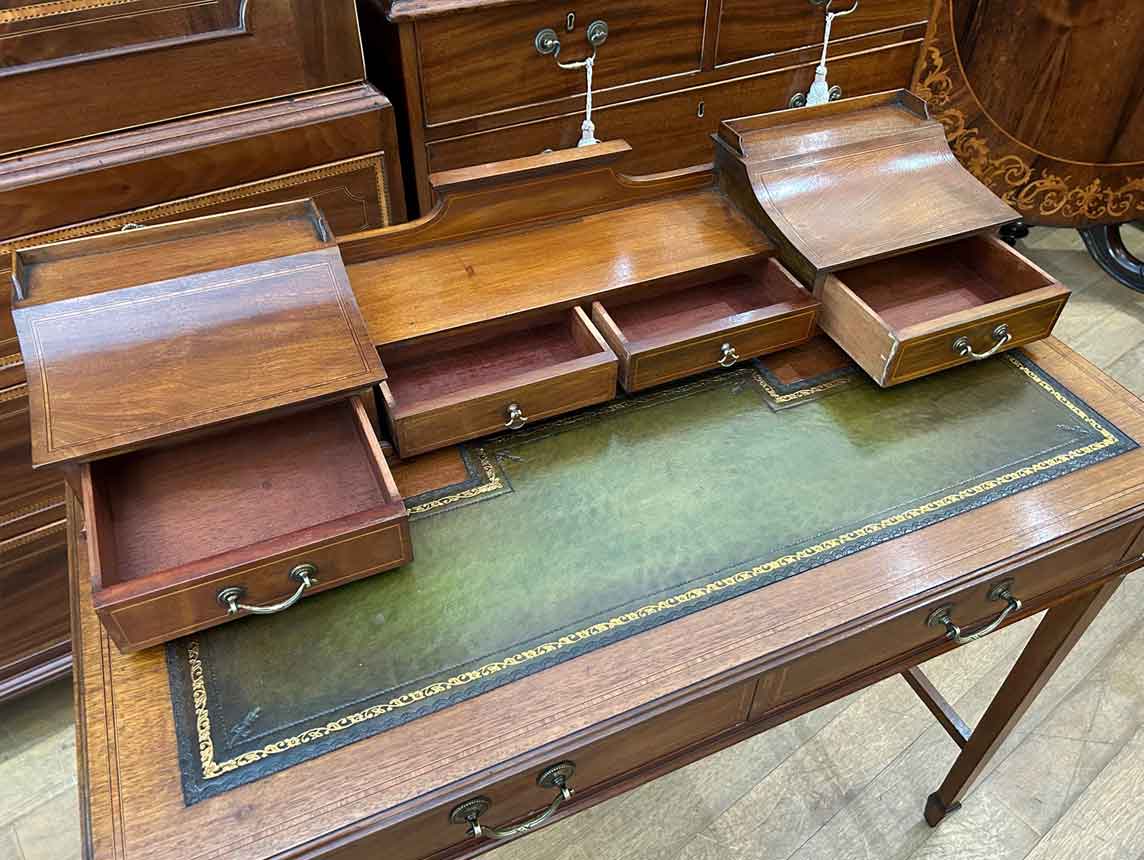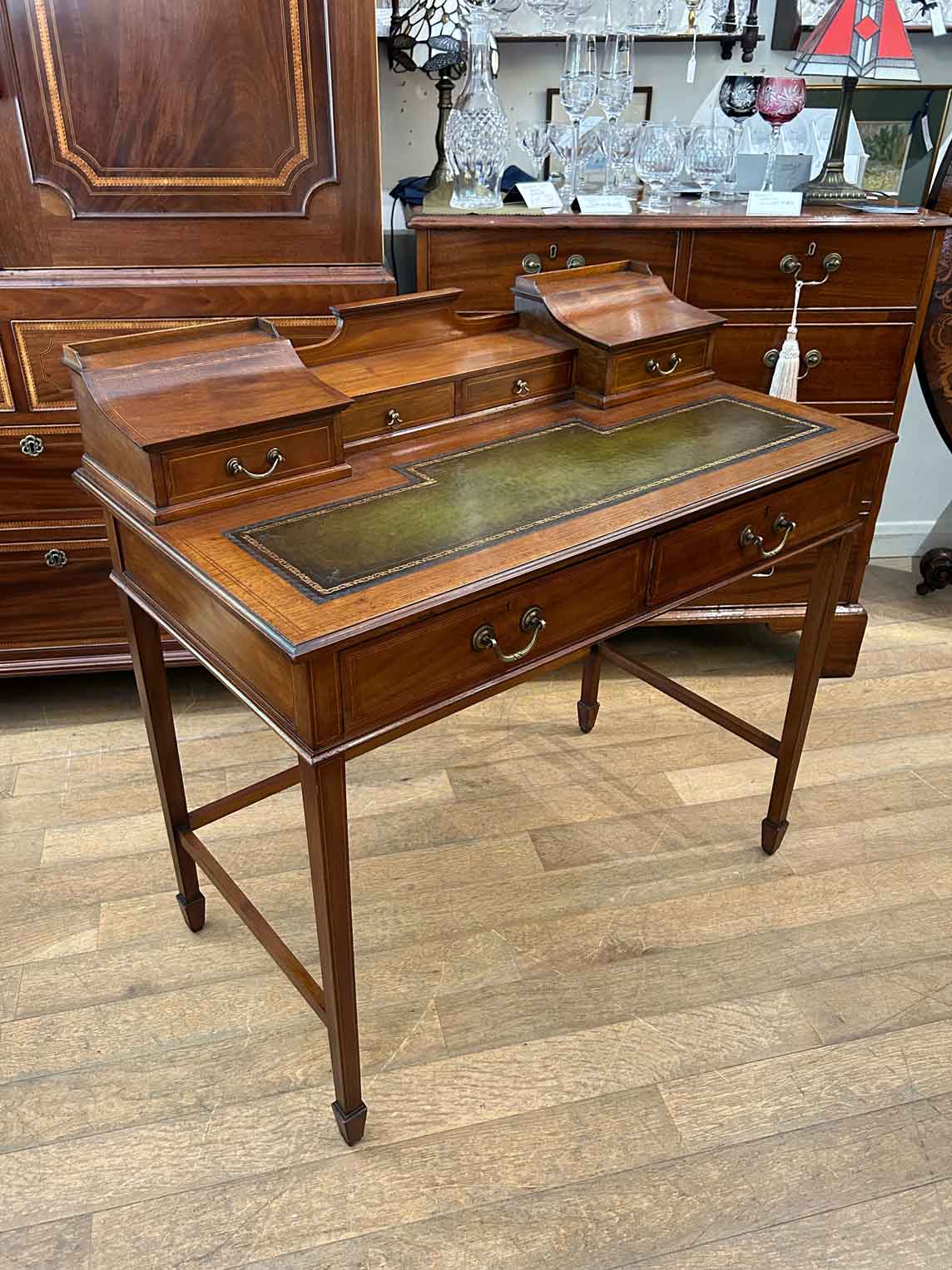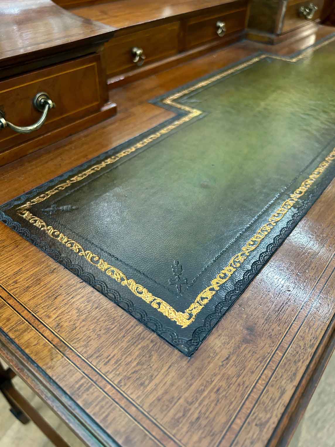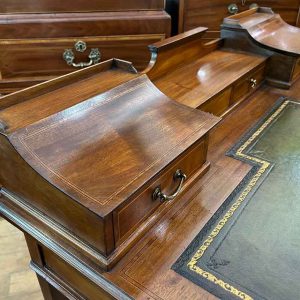 19th Century Victorian Mahogany Inlaid Writing Table with green leather writing surface, the top has four drawer compartments with two main drawers below fitted with brass handles. Standing on square tapering legs with working keys