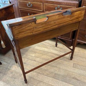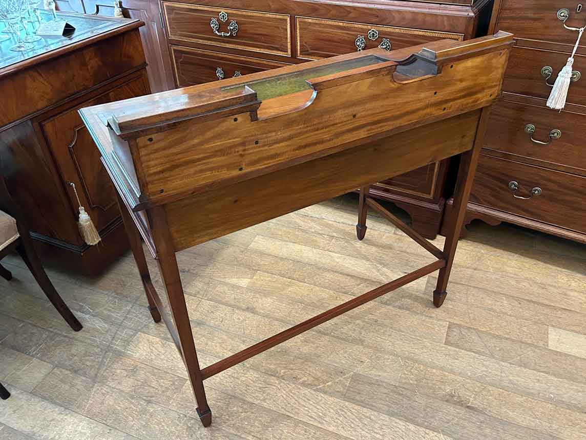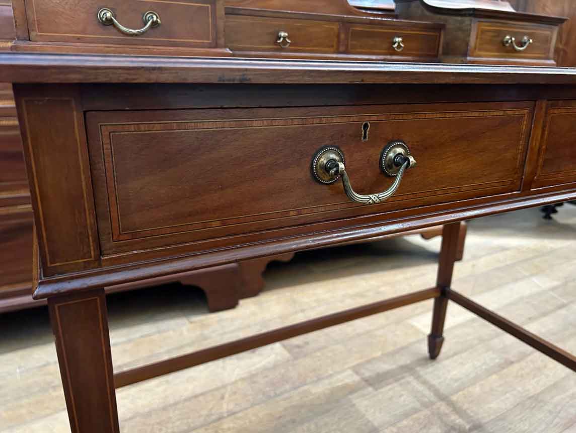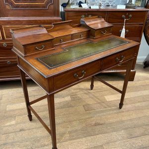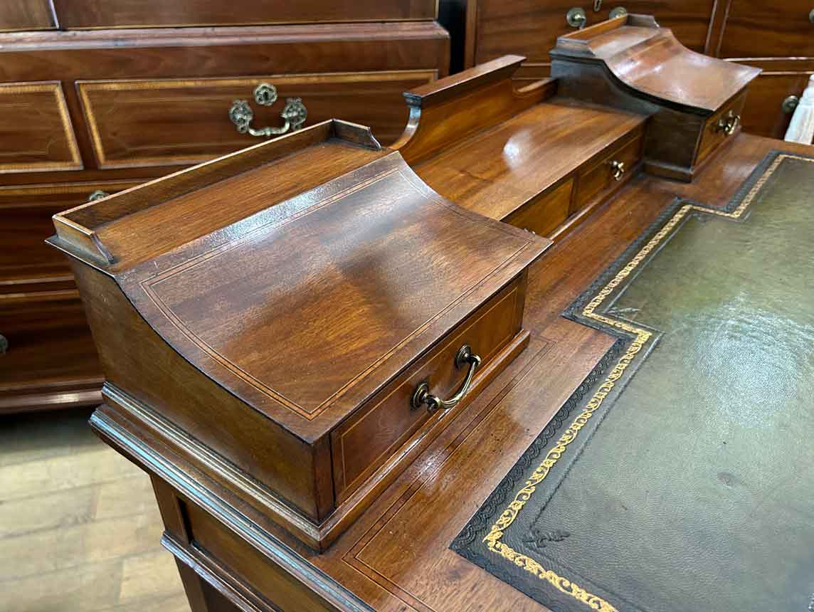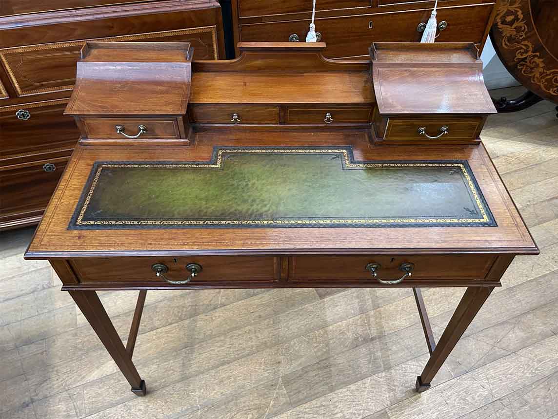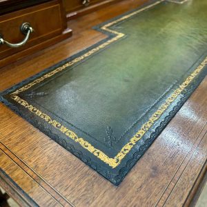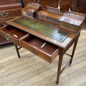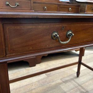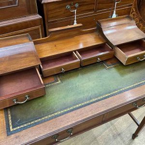 19th Century Victorian Mahogany Inlaid Writing Table with green leather writing surface, the top has four drawer compartments with two main drawers below fitted with brass handles. Standing on square tapering legs with working keys