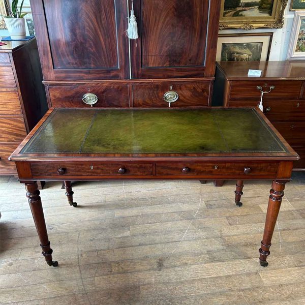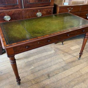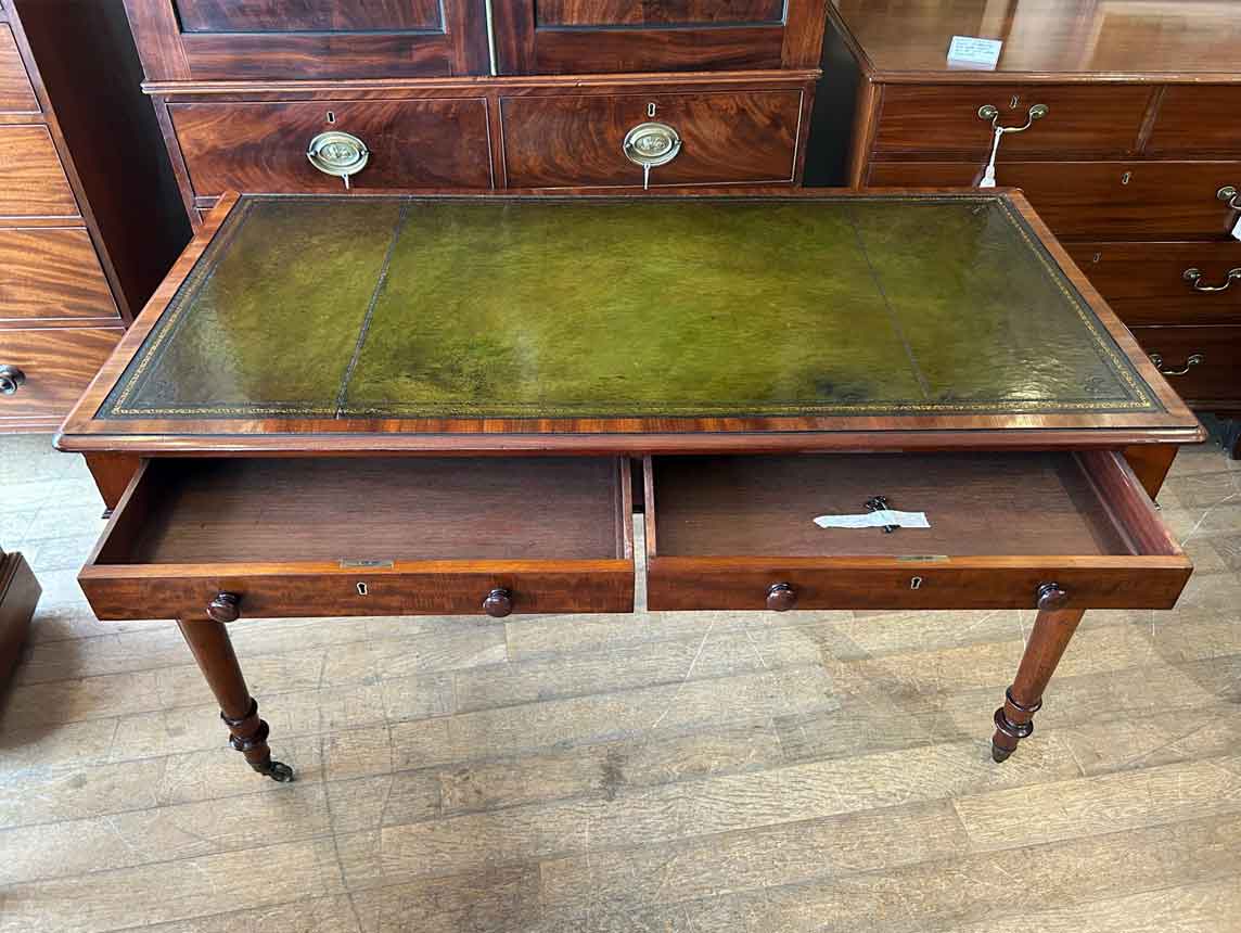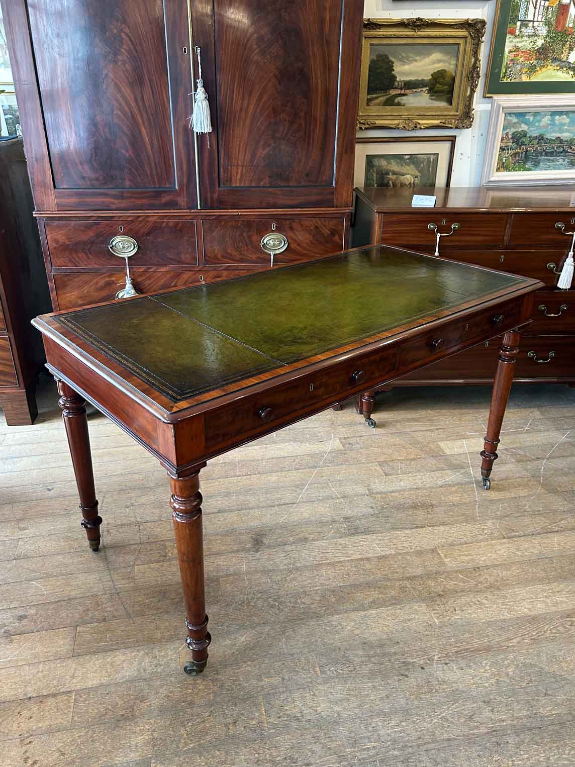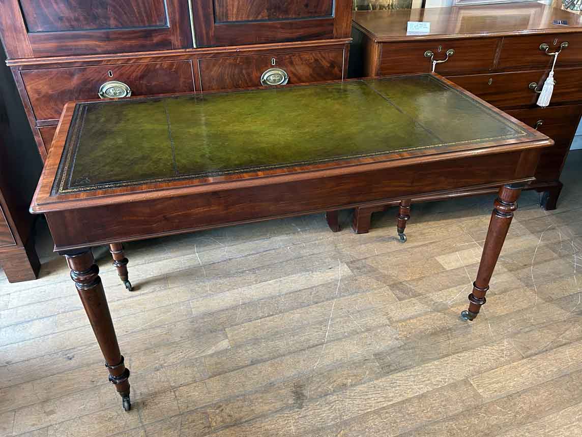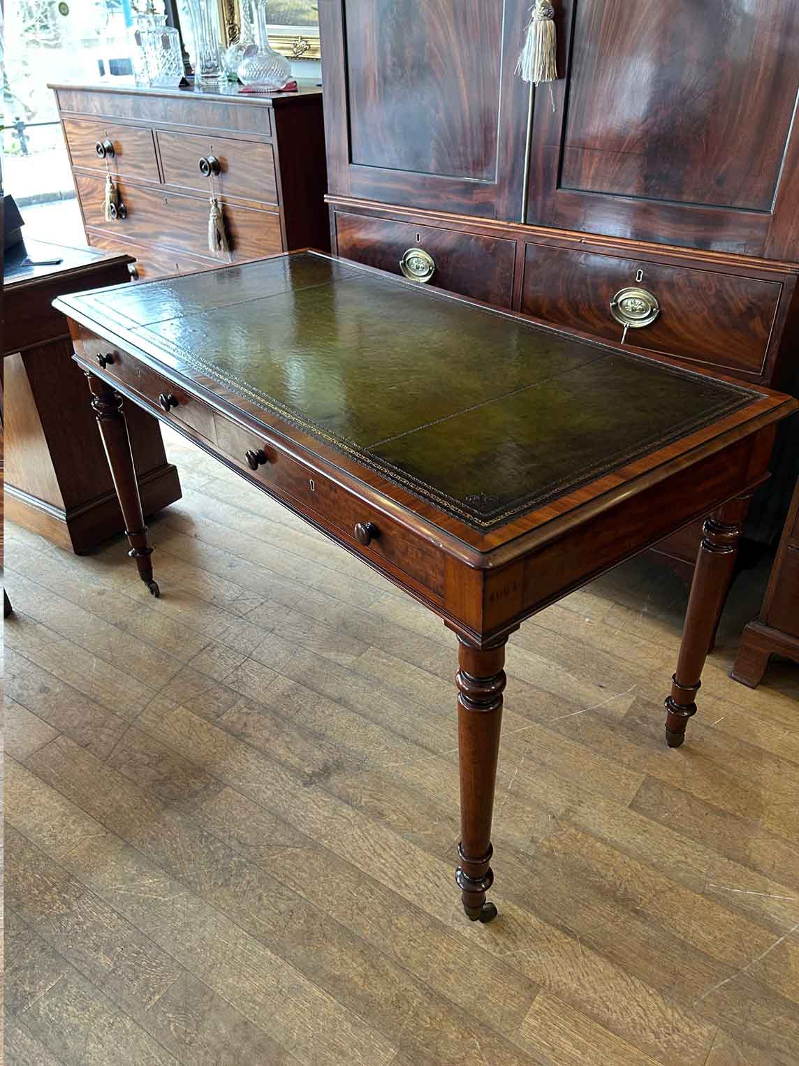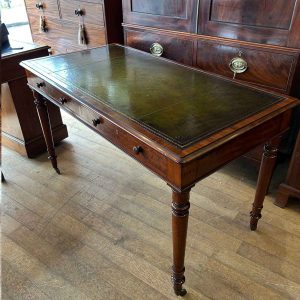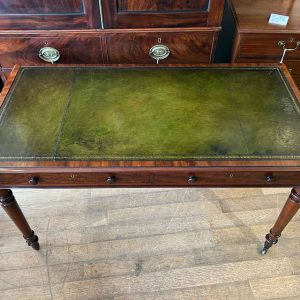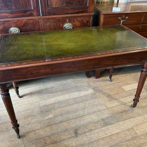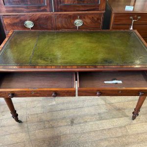 A very high quality 19th Century Mahogany Writing Table with green leathered writing surface and gilt tooling, above two fitted mahogany drawers with turned wooden knobs. Supported by turned legs on brass castors with two working keys.