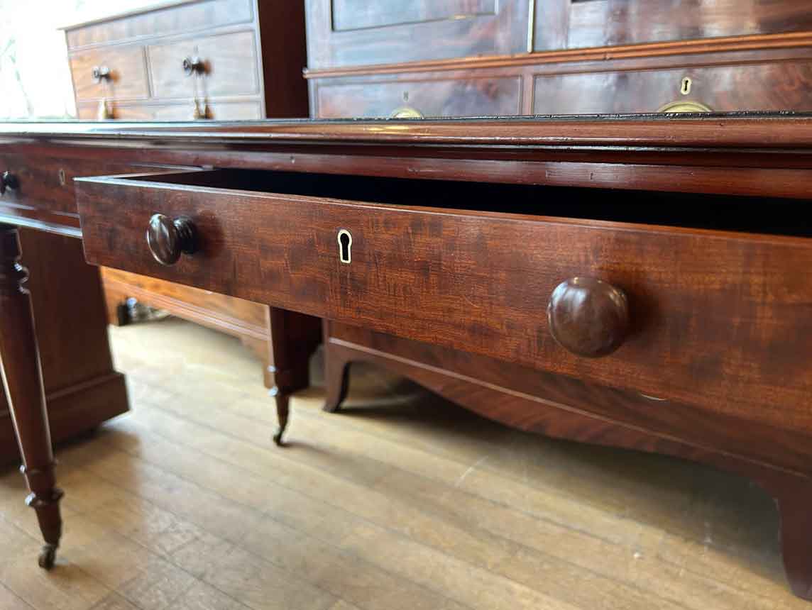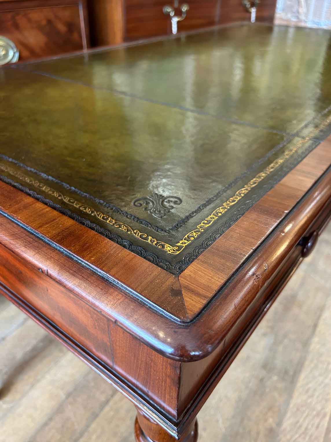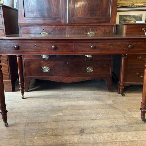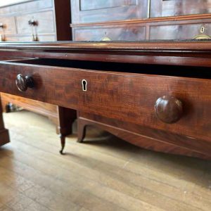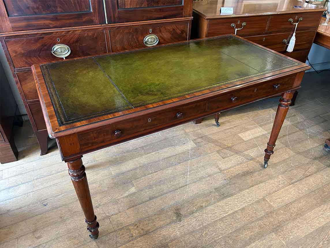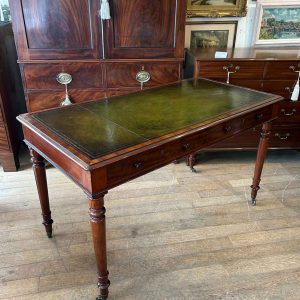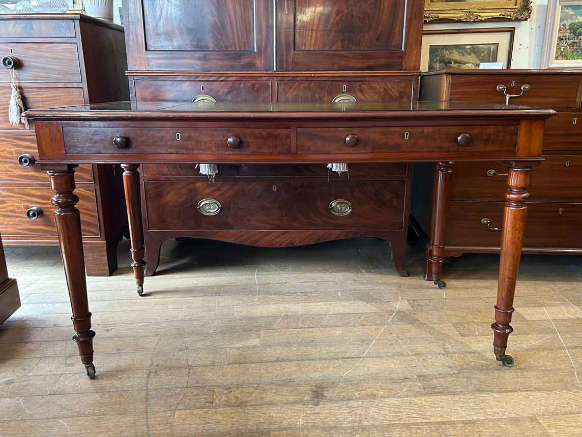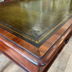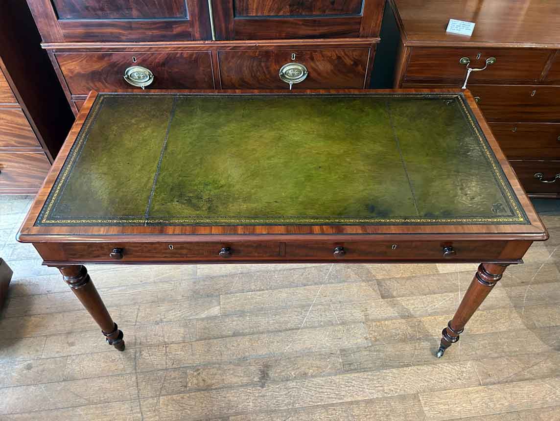 A very high quality 19th Century Mahogany Writing Table with green leathered writing surface and gilt tooling, above two fitted mahogany drawers with turned wooden knobs. Supported by turned legs on brass castors with two working keys.