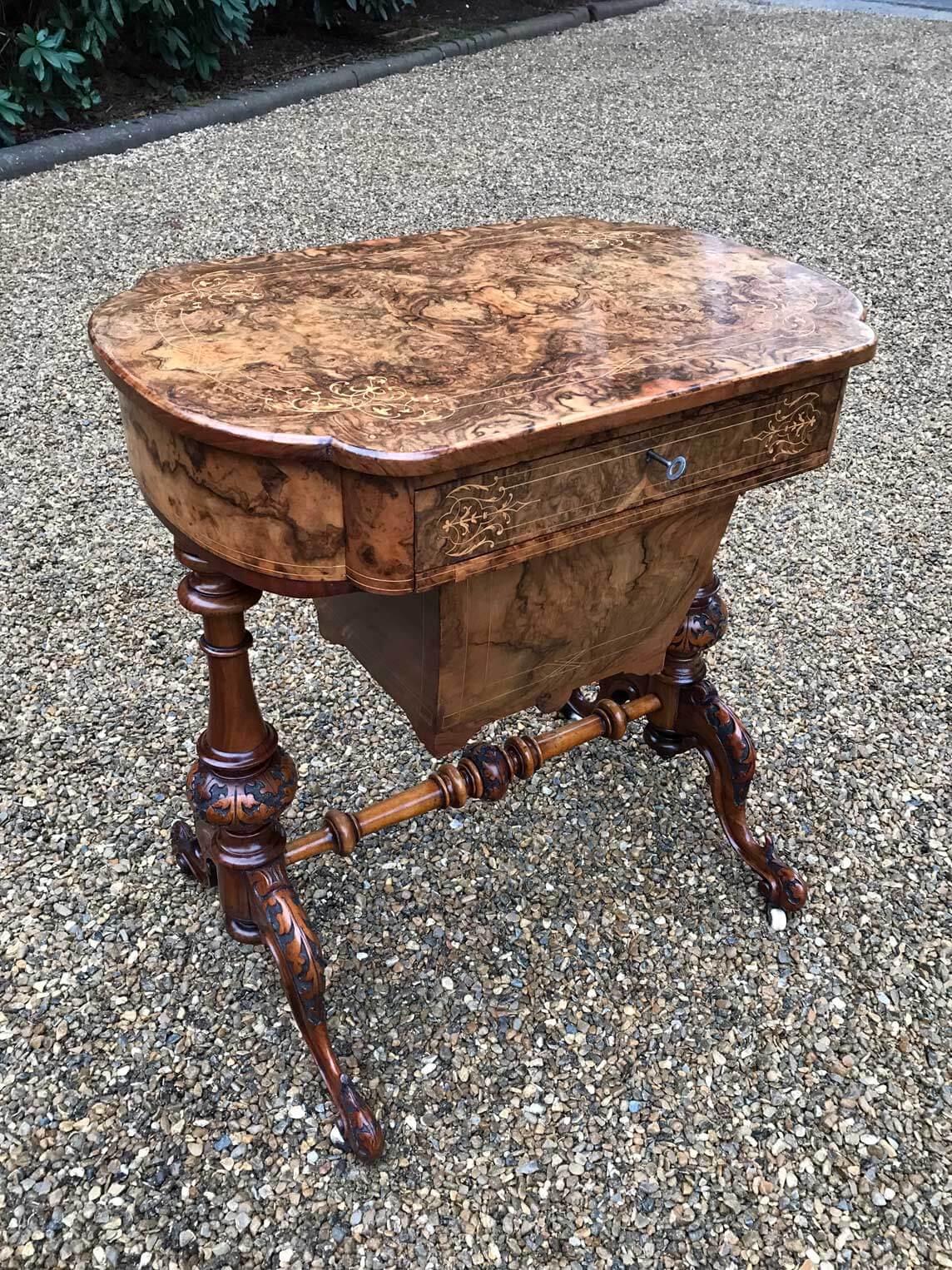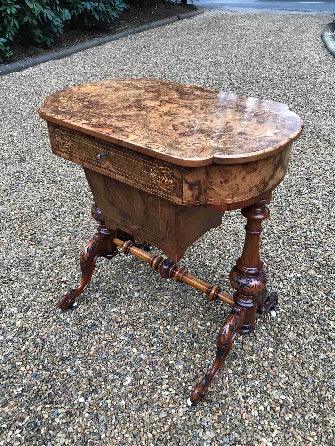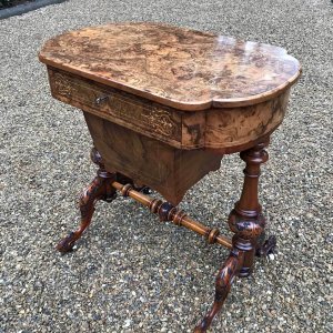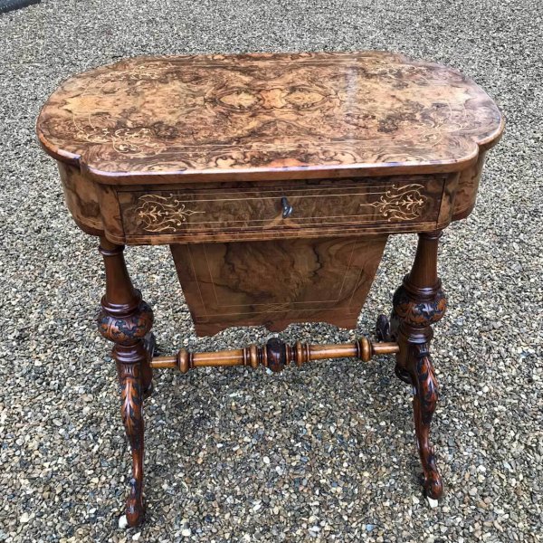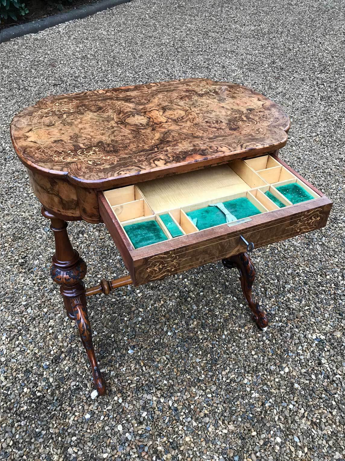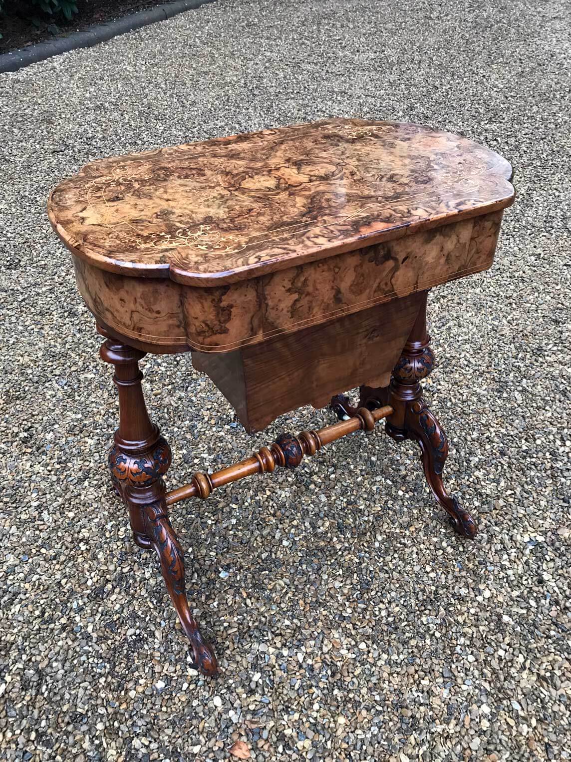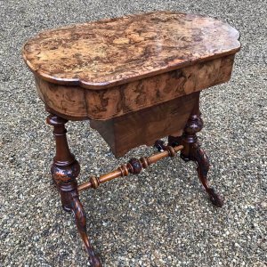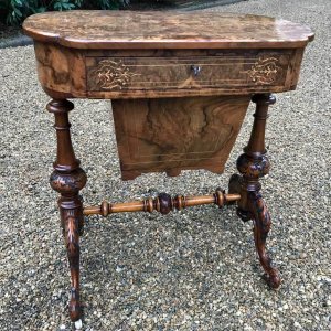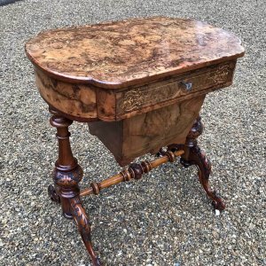 High Quality 19th Century Burr Walnut and Marquetry Work Table with a central drawer with fitted compartments, a pull out box section below, turned / carved legs and stretchers.