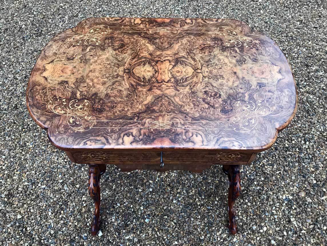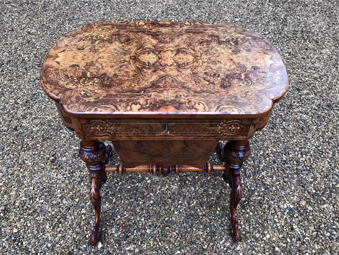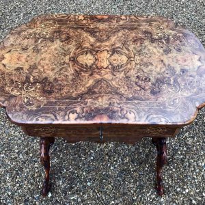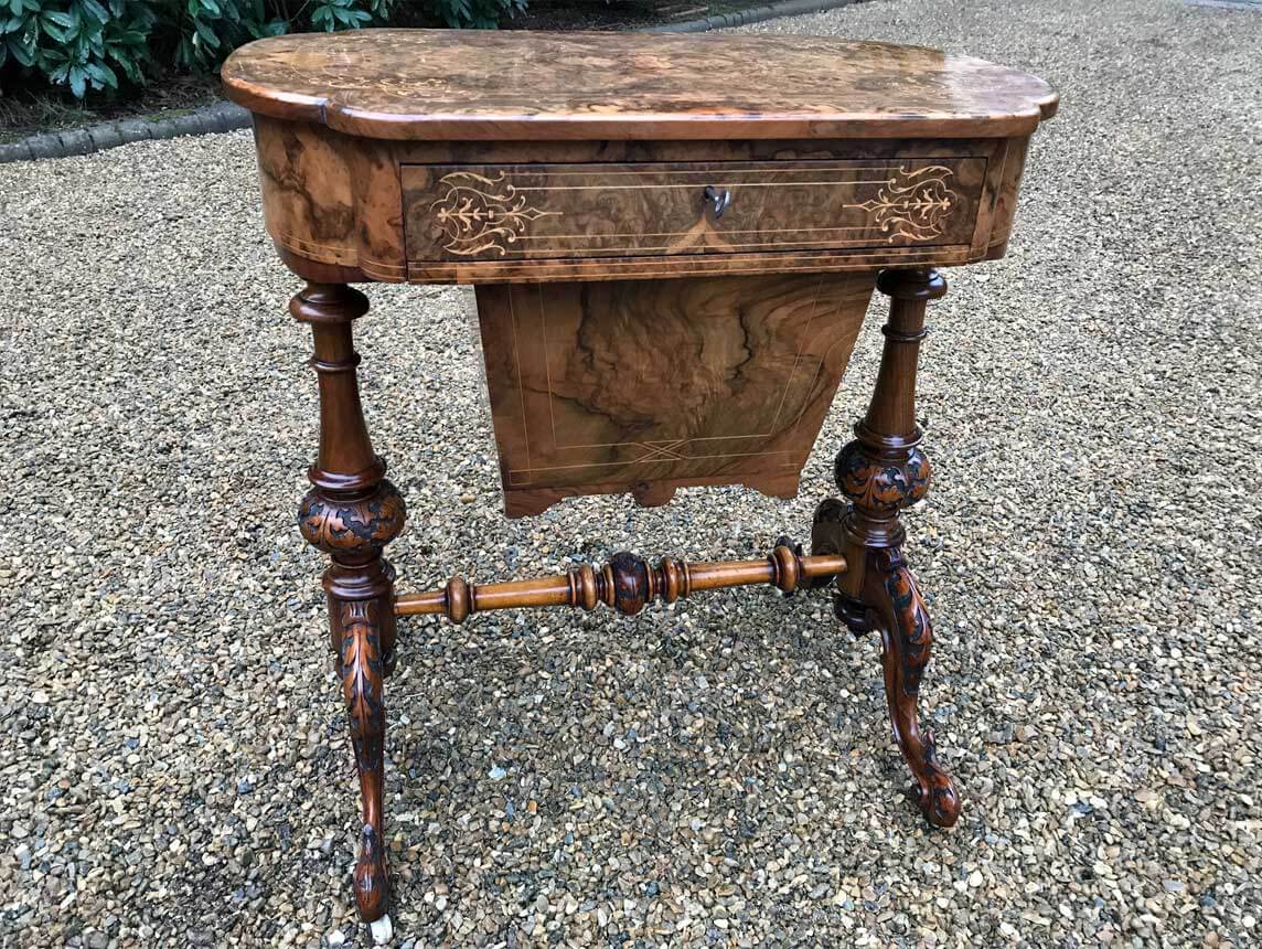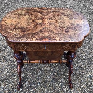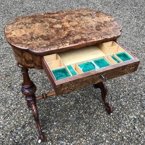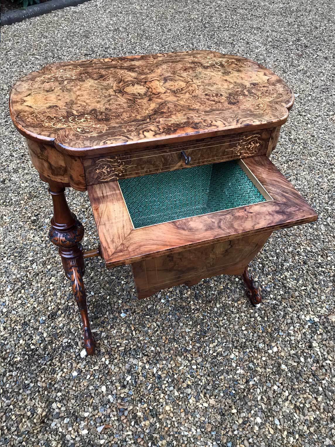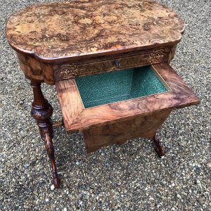 High Quality 19th Century Burr Walnut and Marquetry Work Table with a central drawer with fitted compartments, a pull out box section below, turned / carved legs and stretchers.