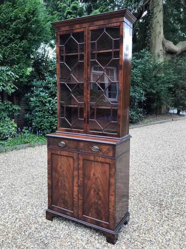 A late Victorian Mahogany Bookcase / Cupboard with two mahogany lined drawers and brass oval handles. Three adjustable shelves to the top bookcase section. The cupboard below has one shelf which can be adjusted. Comes apart in two separate sections on bracket feet. Circa: 1880 Dimensions: Height: 80 inches – 203 cms Width: 31 inches – 79 cms Depth: 16 inches – 40 cms…