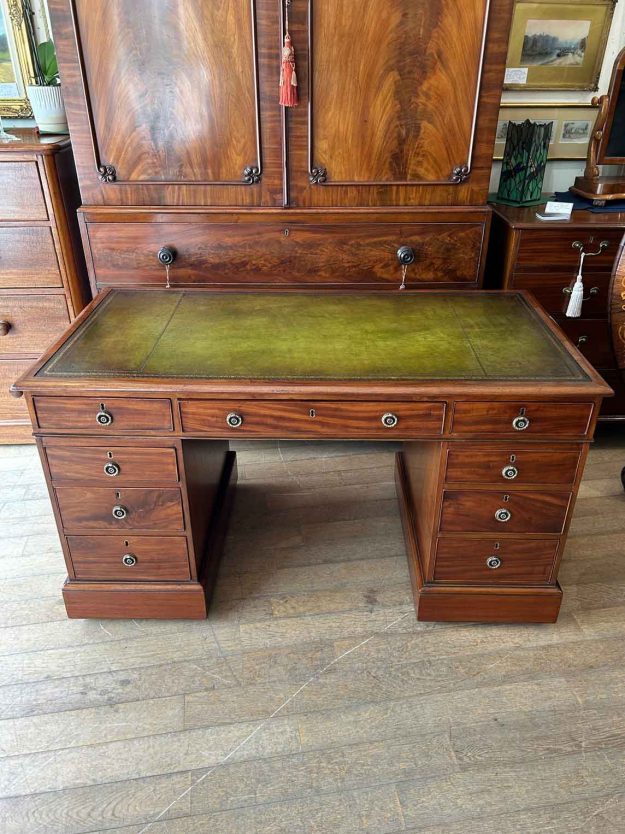 19th Century Mahogany Pedestal Desk, with green hide leather top and gilt tooling, eight drawers all fitted with round turned knob handles with two working keys. Comes apart in three separate sections. Circa: 1860 Video: If you require video. Please just let us know by filling out the enquiry form. Dimensions: Height: 31 inches –…