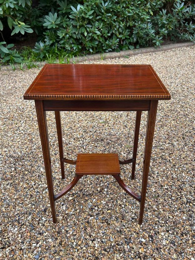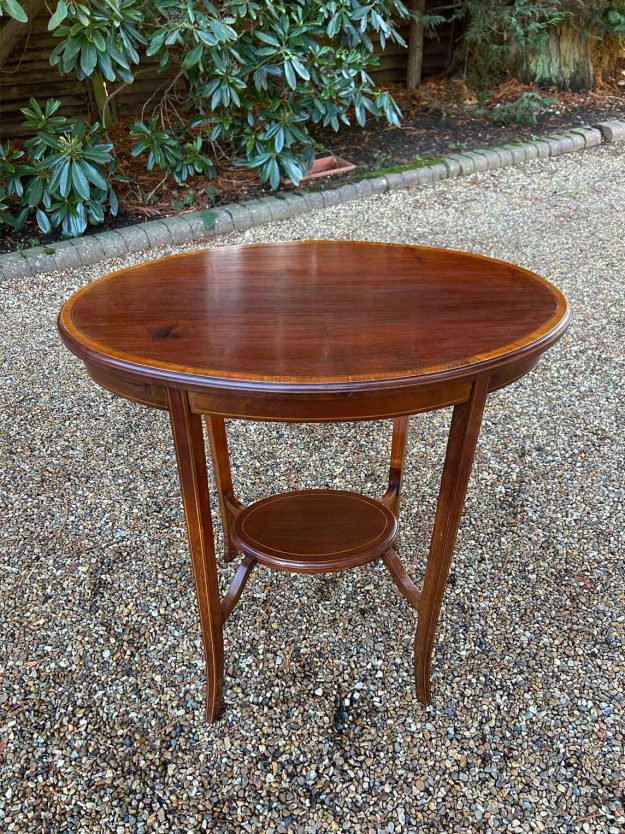 19th Century Mahogany Oval Occasional Table with a satinwood crossbanded edge, line inlay decoration and a lower shelf. Standing on four square splayed legs. Circa: 1930 Video: If you require video. Please just let us know by filling out the enquiry form. Dimensions: Height: 28.5 inches – 72.5 cms Width: 27.5 inches – 70 cms…