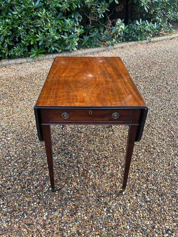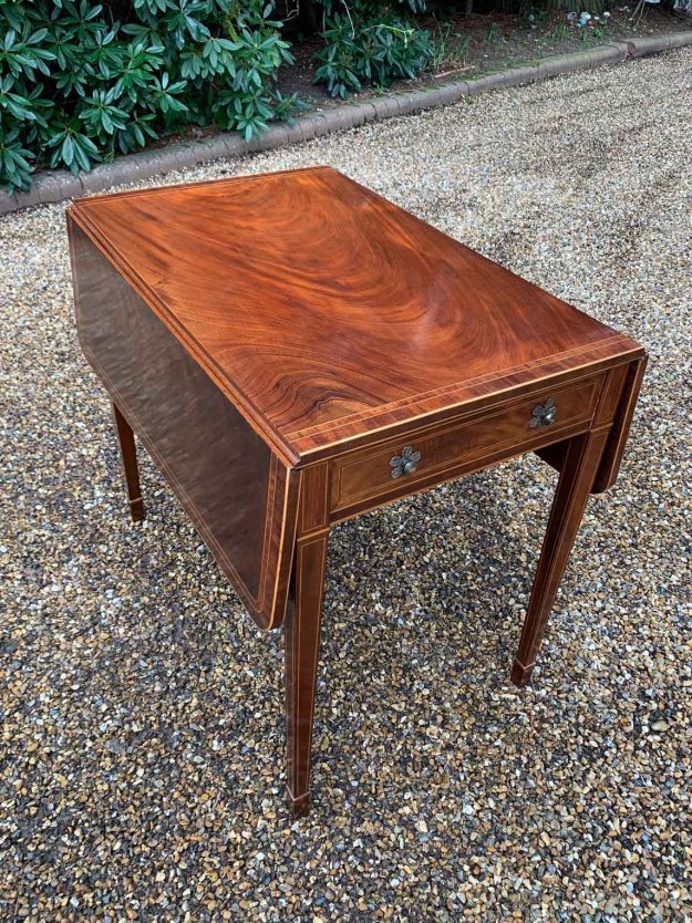 A very good quality 19th Century Mahogany Oval Pembroke Table, with inlaid satinwood crossbandings on top, a single mahogany lined drawer with a brass swan neck handle. Standing on elegant square tapered legs supports united by ‘X’ stretcher with brass castors to base. Circa: 1860 Dimensions: Height: 28.25 inches / 72 cms Depth: 18 inches…