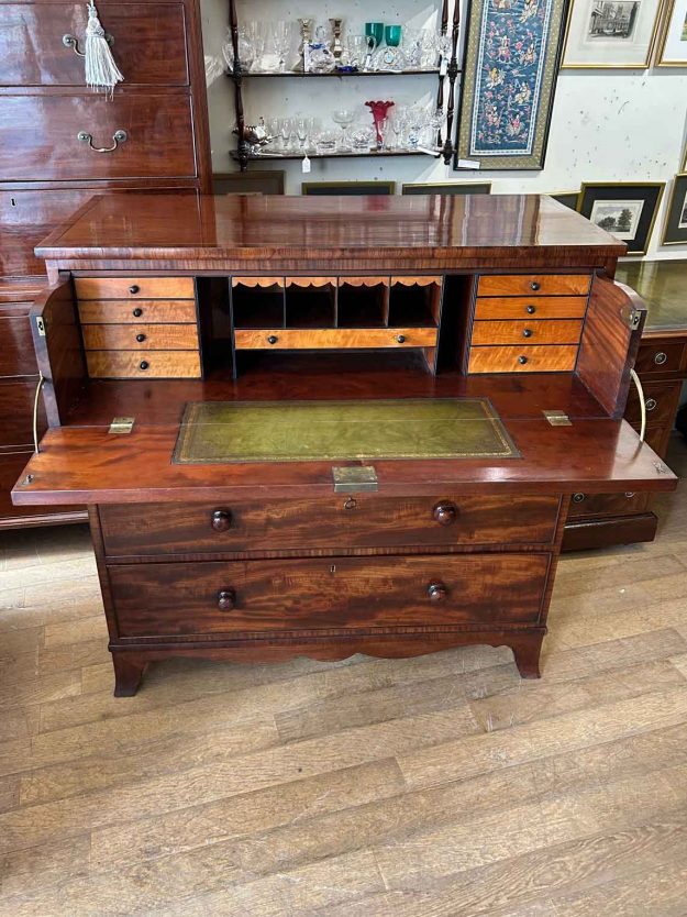 19th Century Georgian Mahogany Secretaire has a fitted desk drawer over three long drawers with brass oval handles. The fitted desk drawer interior has a writing surface with 7 strung drawers and 5 pigeon holes. Stands on four bracket feet. Circa: 1820 Dimensions: Height: 39 inches – 99.5 cms Width: 34 inches – 87 cms Depth:…