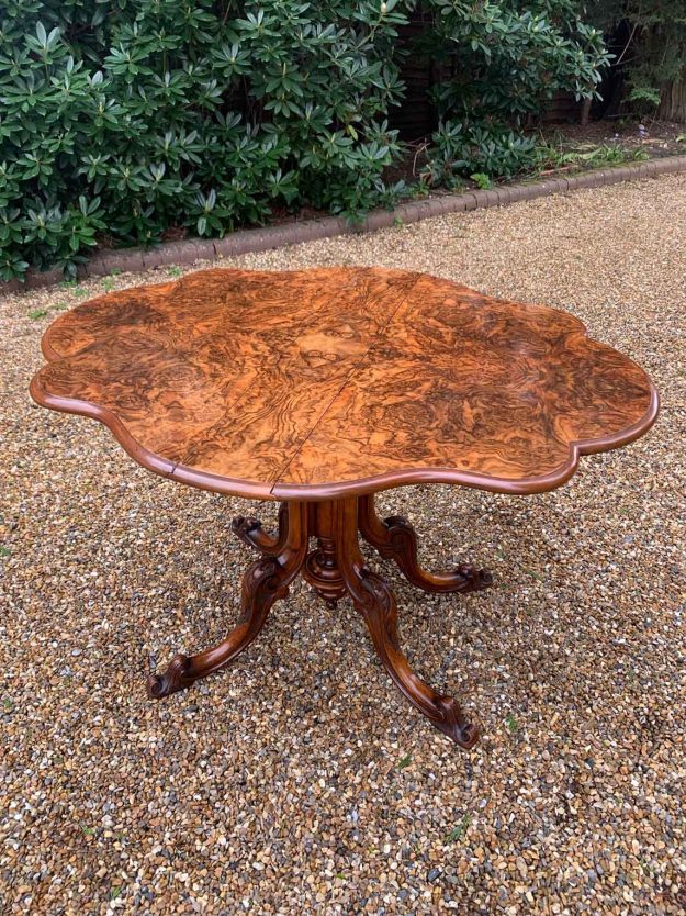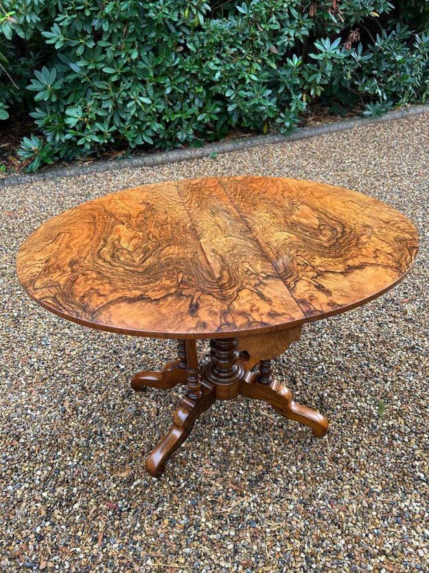 Victorian Burr Walnut Serpentine Sutherland Tea Table by T. Eyles, Cabinet Maker