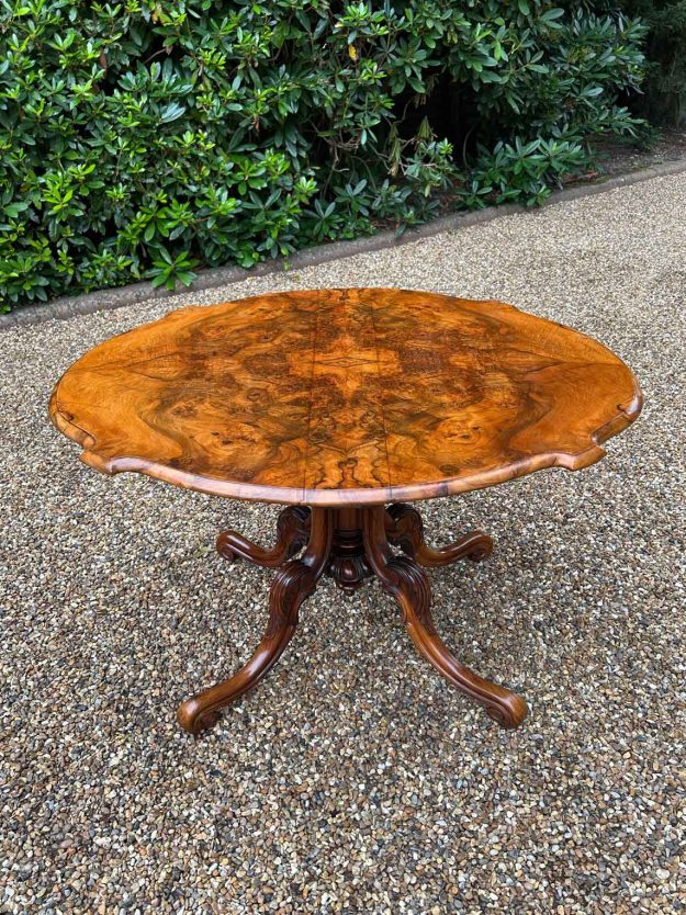 A very high quality 19th Century Victorian Burr Walnut Serpentine Sutherland Tea Table by Eyles, Thomas (1830) Cabinet Maker. With a rare quadruple gate-leg action, on four carved scroll out-swinging cabriole legs. The serpentine shaped oval top in mirror-matched burr walnut with a cushion moulded edge, supported on four acanthus-carved, hipped cabriole legs. All rotating…