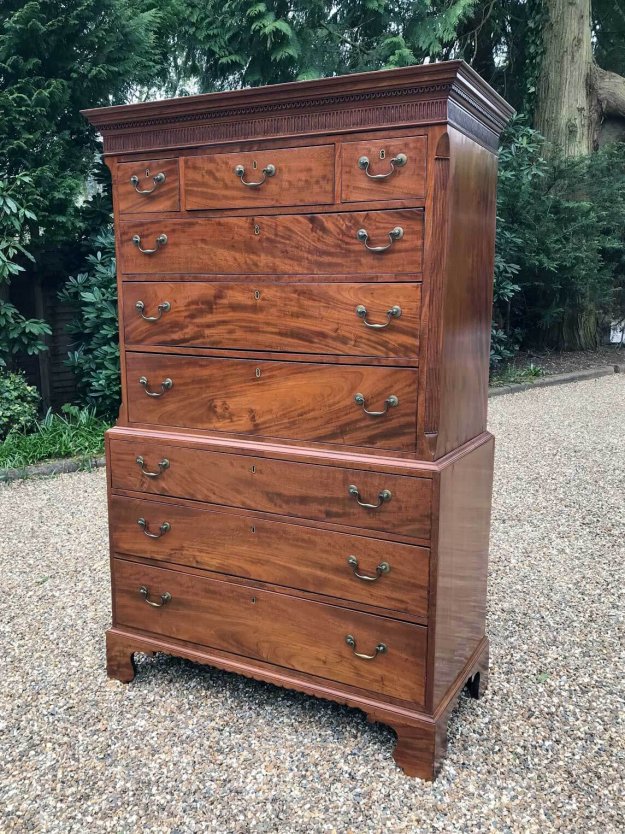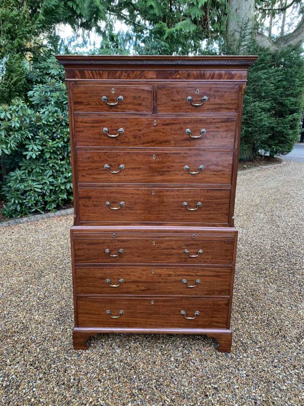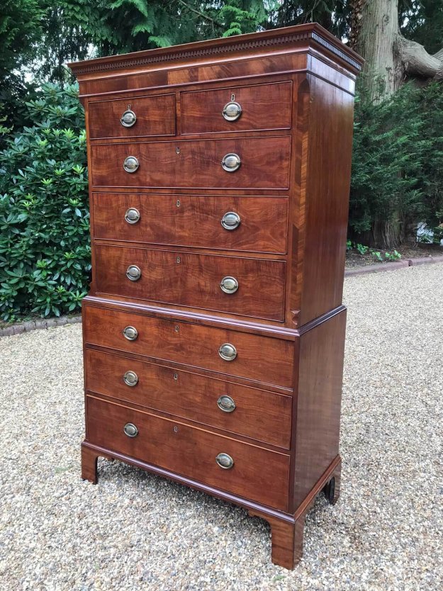 A very high quality 18th Century George III Mahogany Chest On Chest (Tallboy) Two short drawers at the top and six long solid oak lined drawers. With brass plate handles and frieze to cornice. Comes apart in two separate sections on original bracket feet. Circa: 1790 Dimensions: Height:  77 inches – 195 cms Width:   43.5…