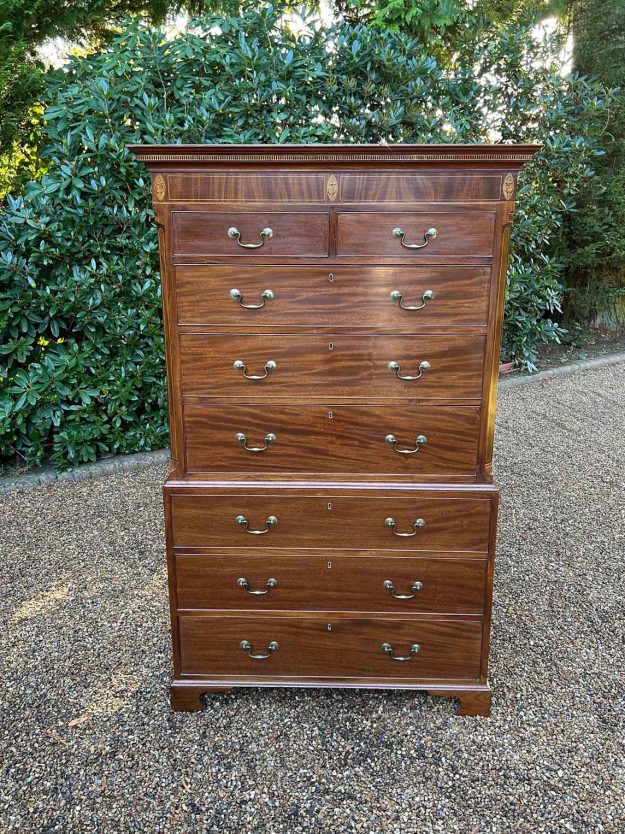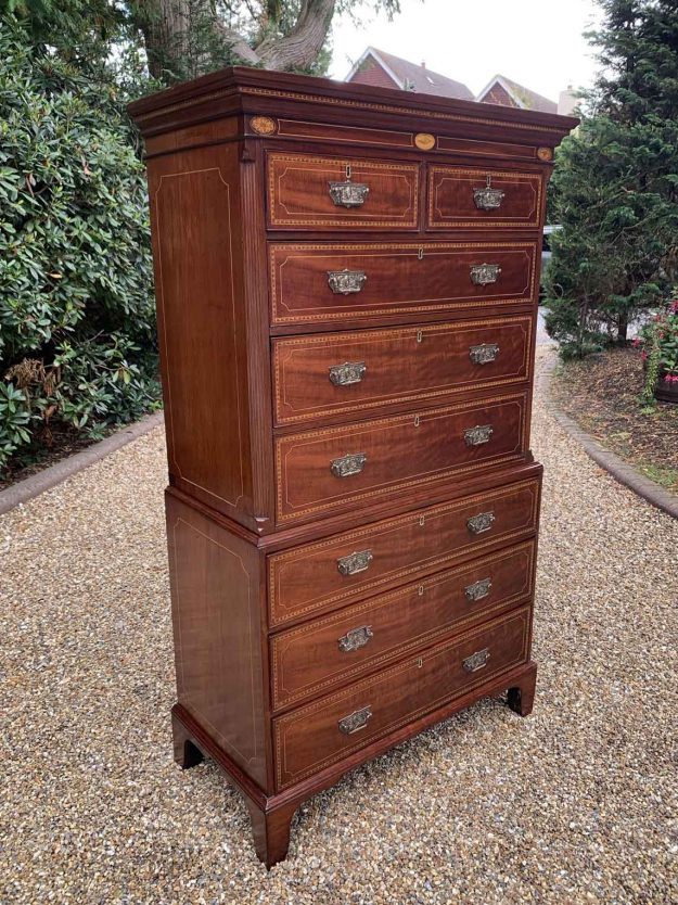 A very high quality 18th Century (George III) Mahogany Chest On Chest (Tallboy) with two short drawers at the top and six long drawers with original brass swan neck handles and oak lined drawers. With inlaid frieze to cornice and chamfered sides. Comes apart in two separate sections on original bracket feet. Circa: 1790 Dimensions:…
